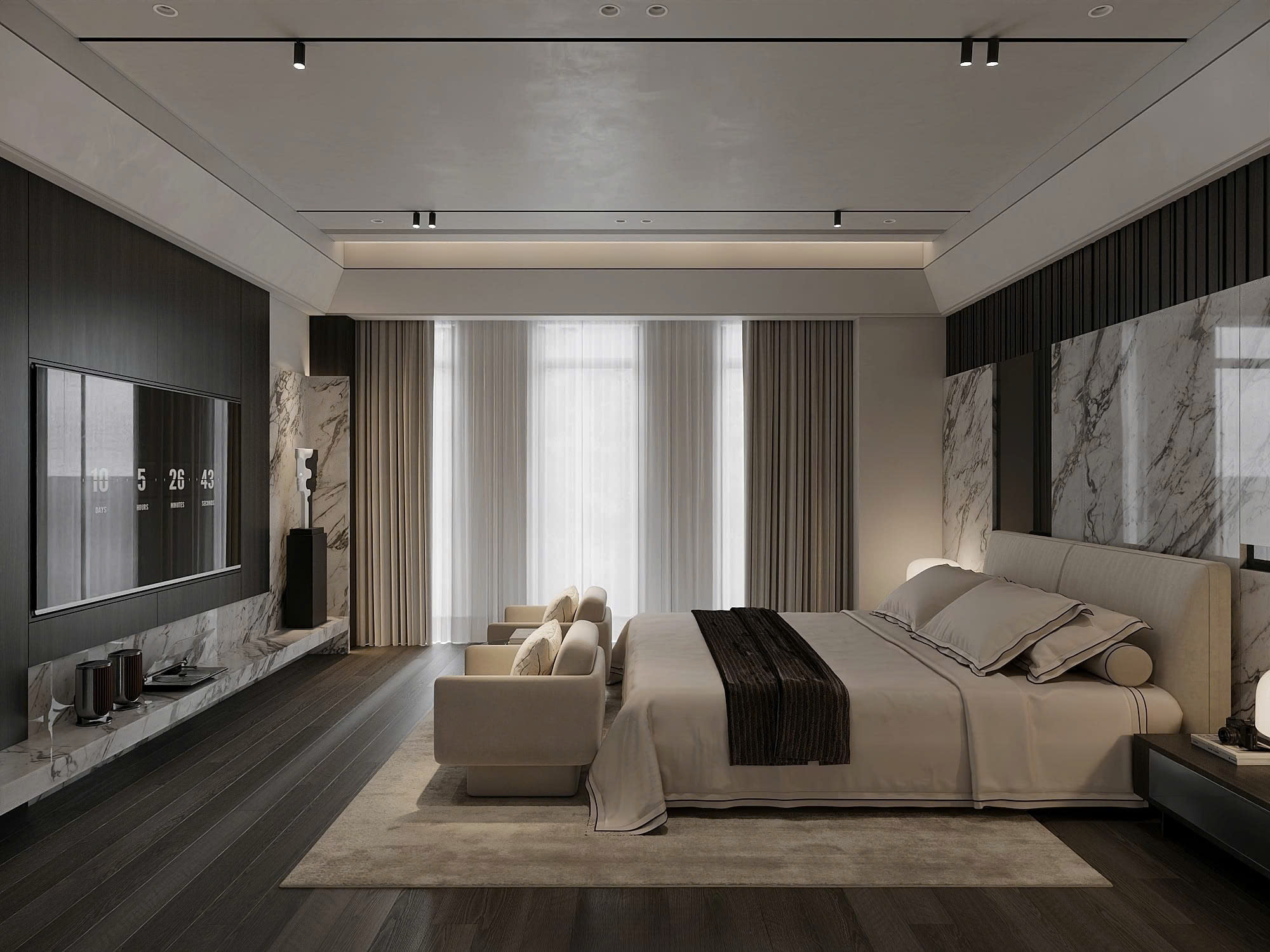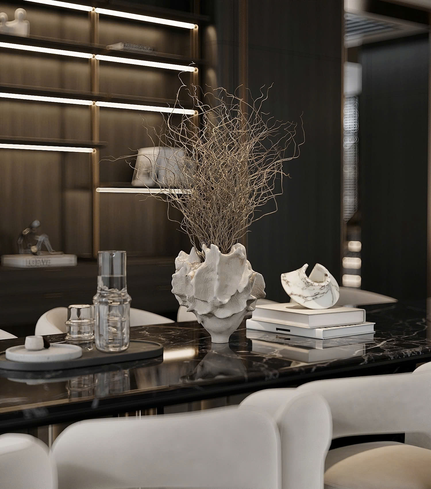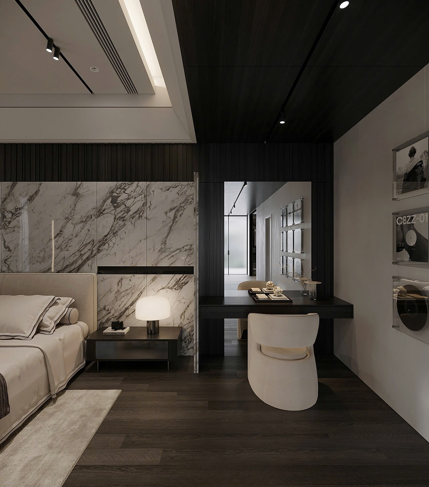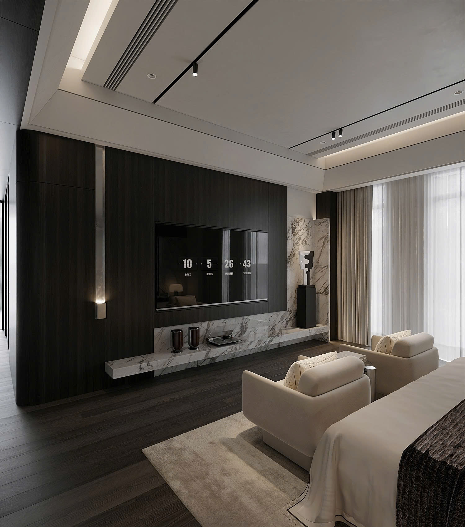 Bảng màu trung tính như trắng, kem, xám và nâu gỗ được lựa chọn làm nền, mang lại cảm giác nhẹ nhàng và sang trọng. Các vật liệu cao cấp như đá vân tự nhiên, gỗ phủ veneer, kính cường lực và kim loại ánh kim được kết hợp tinh tế, tạo hiệu ứng thị giác ấn tượng nhưng không phô trương. Sự phối hợp giữa màu sắc và chất liệu giúp không gian vừa hiện đại, vừa ấm áp, đồng thời nâng tầm giá trị tổng thể của công trình.