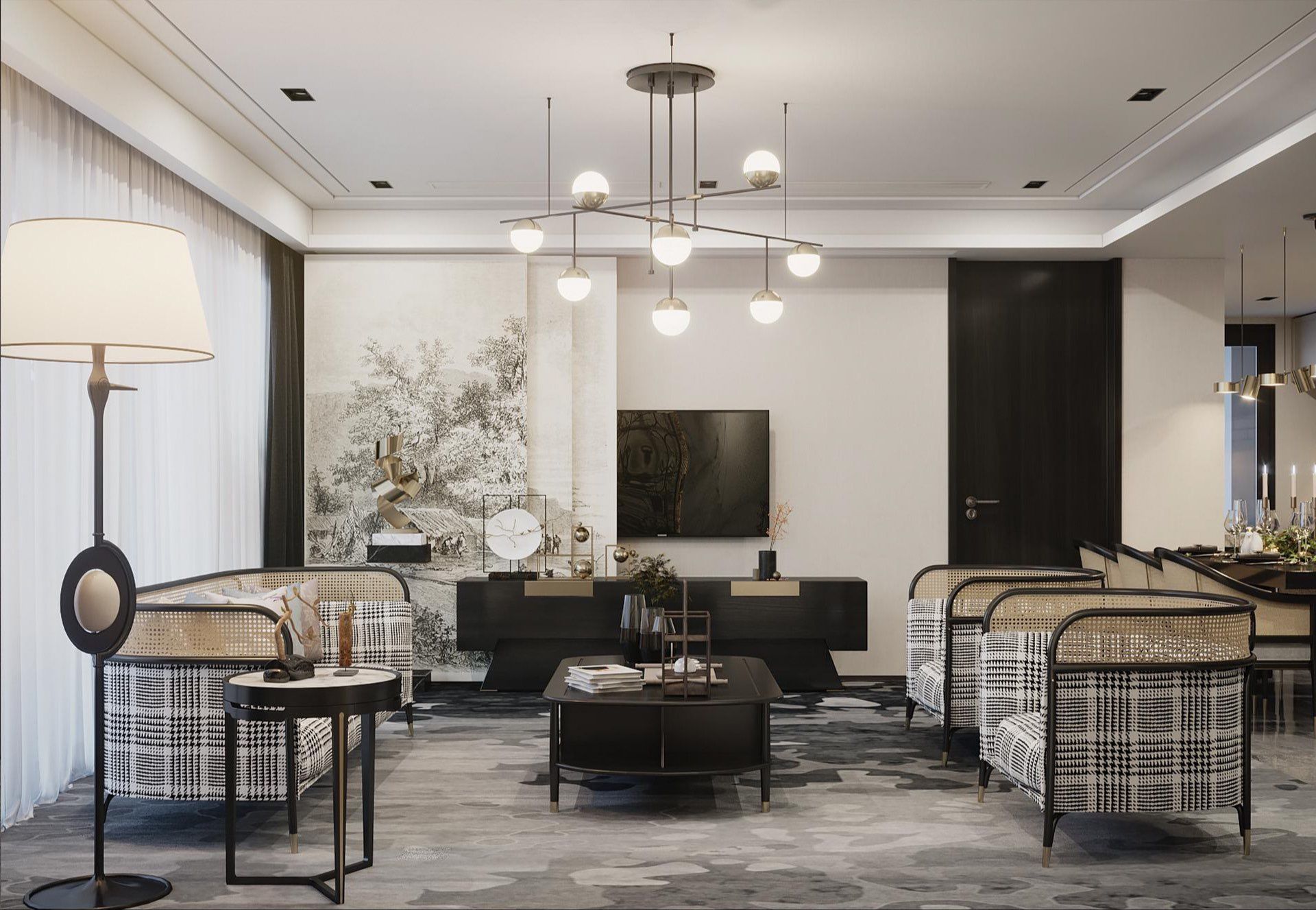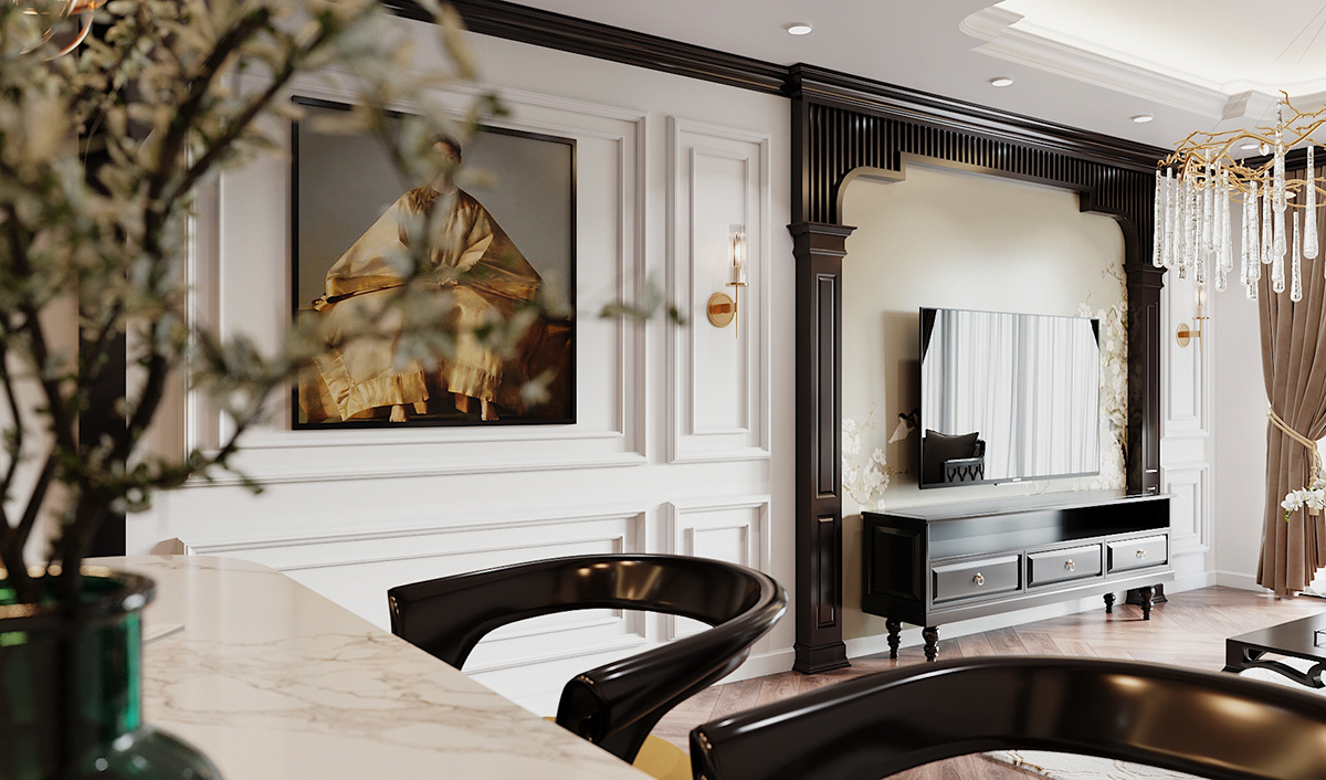 🏡 Phòng khách Indochine luxury – Sử dụng vật liệu cao cấp như đá marble, kim loại mạ vàng, tạo nên không gian xa hoa.