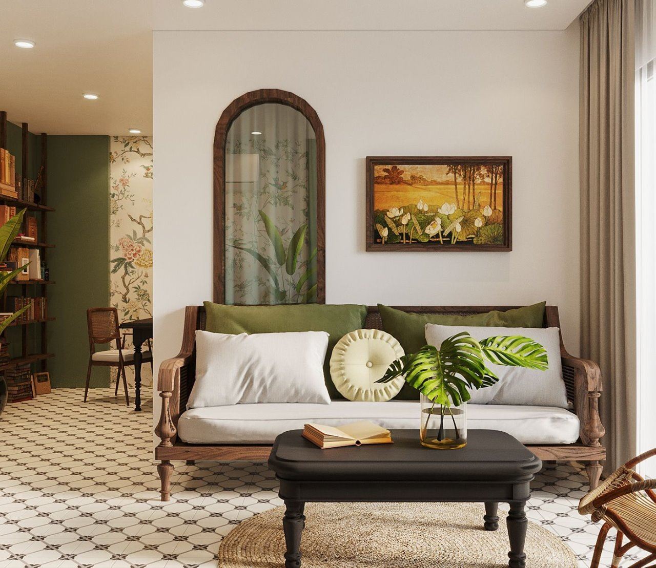 🏡 Phòng khách Indochine tối giản – Giữ nguyên nét đẹp truyền thống nhưng tinh giản chi tiết, tạo cảm giác nhẹ nhàng, thư thái.