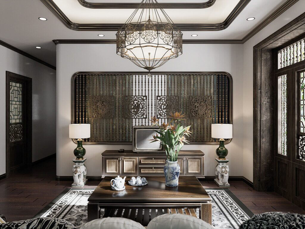 🏡 Phòng khách Indochine cổ điển – Sử dụng nội thất gỗ tự nhiên, họa tiết hoa văn truyền thống, tạo cảm giác sang trọng và ấm áp.