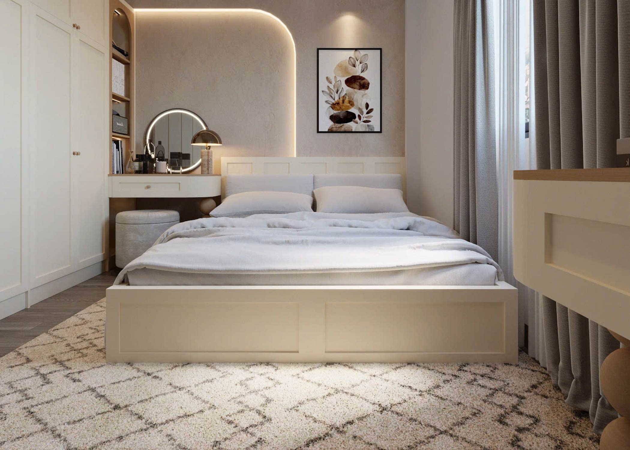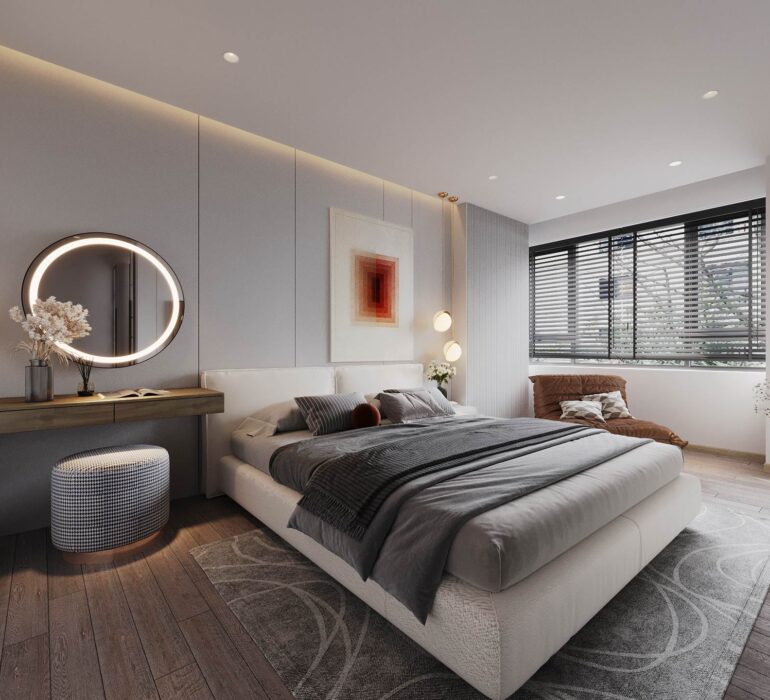 Phòng ngủ chính cần được ưu tiên sự riêng tư, thoải mái và khả năng lưu trữ. Hệ giường, tab đầu giường, bàn trang điểm, tủ áo và ánh sáng cần được bố trí khoa học để mang lại cảm giác thư giãn tối đa.