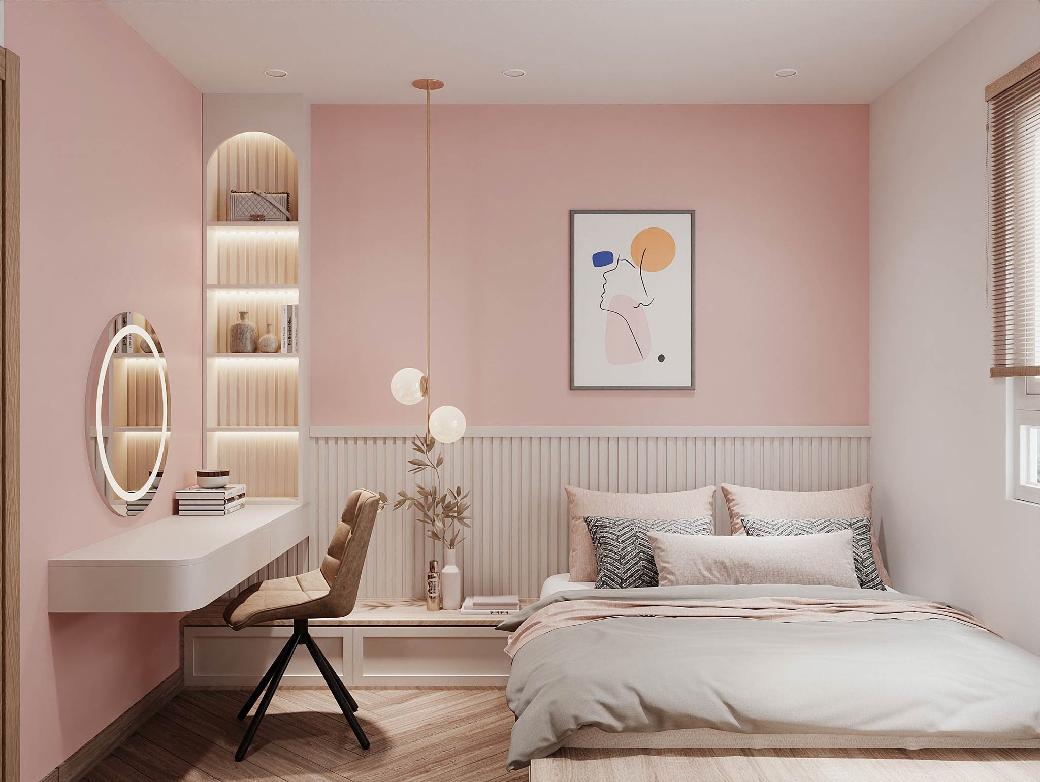 - Kính, gương, lam trang trí tăng chiều sâu không gian.