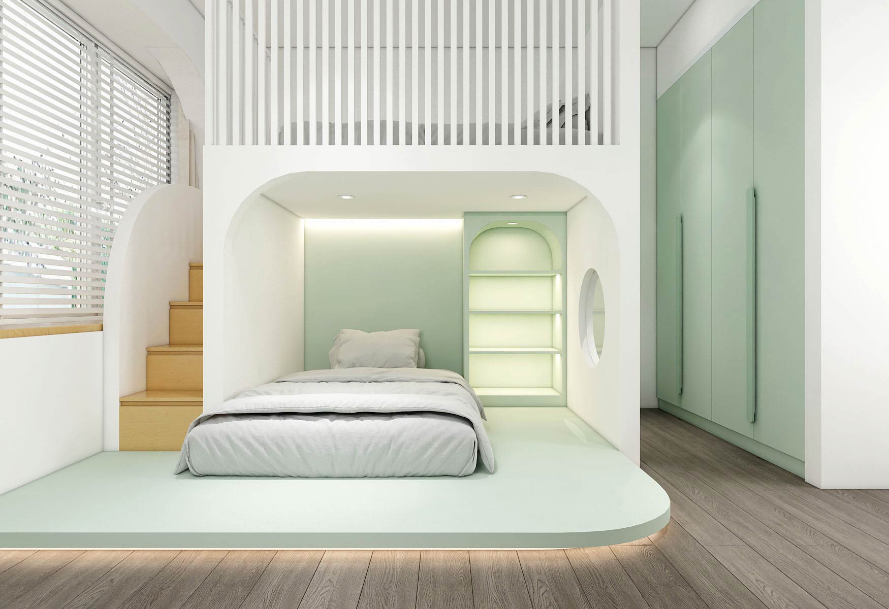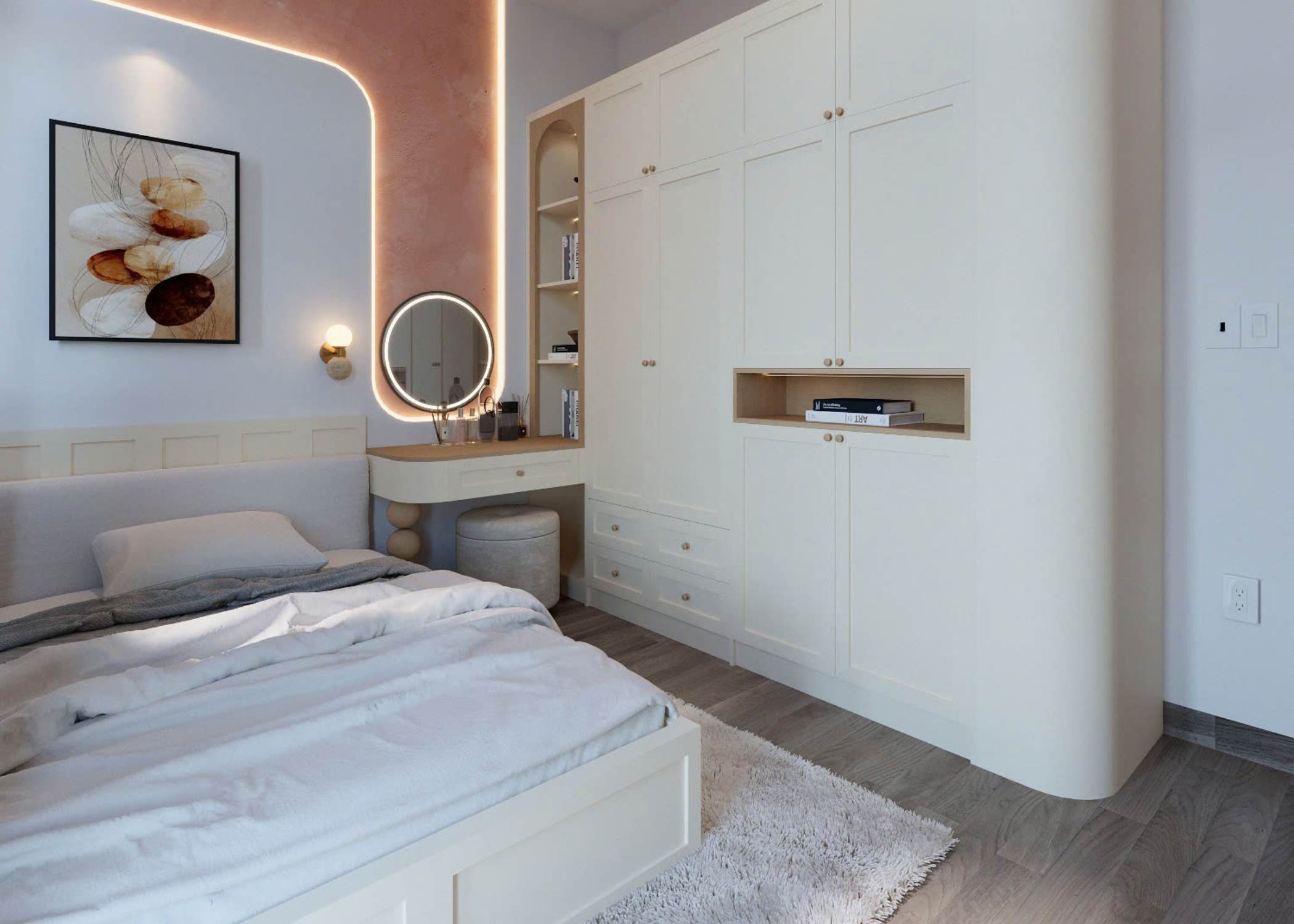 - Hệ tủ âm tường hoặc tủ kịch trần để tăng diện tích lưu trữ.