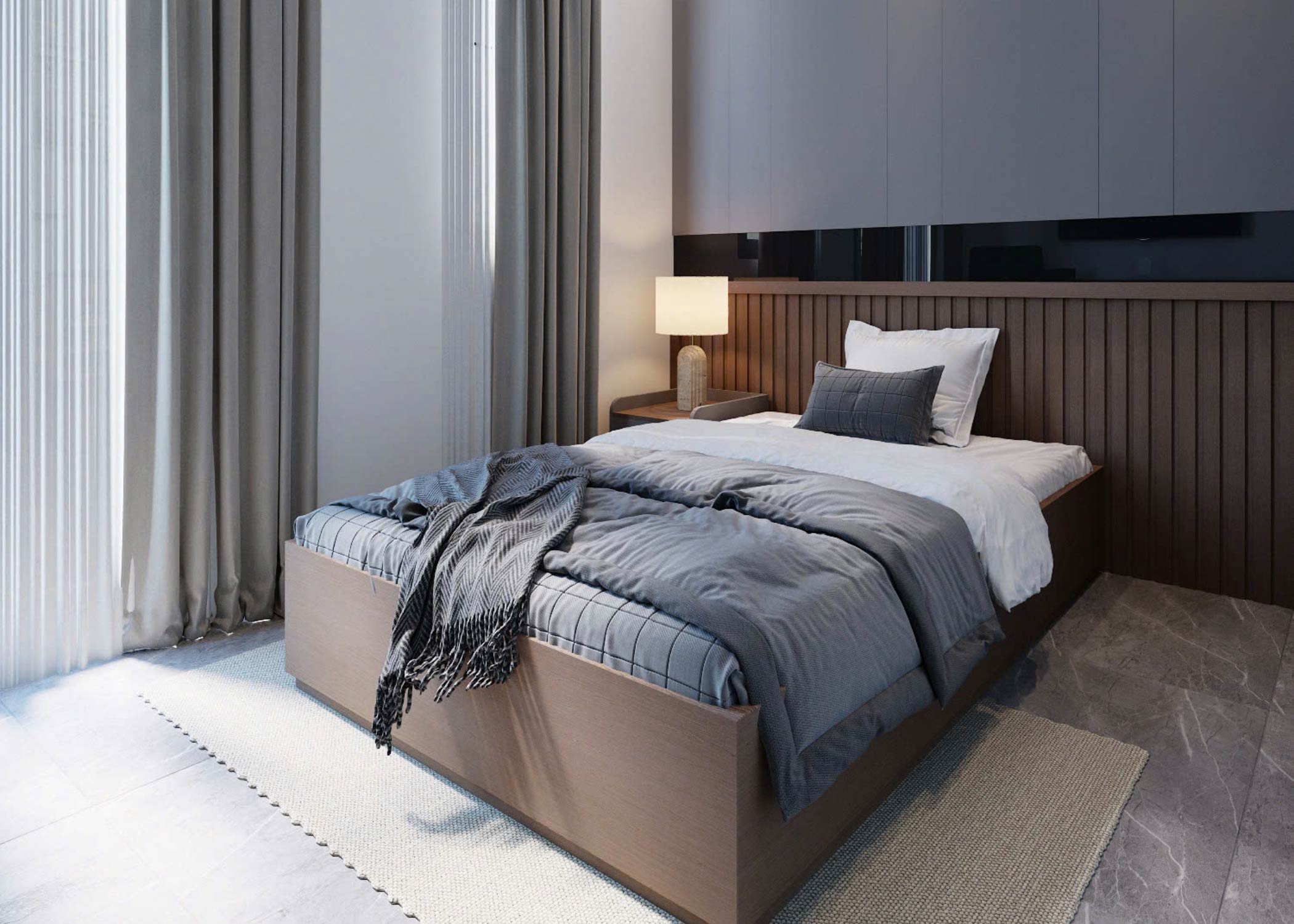 Với căn hộ chung cư 2 phòng ngủ, BLUEWOOD luôn ưu tiên khai thác tối đa ánh sáng tự nhiên thông qua cửa kính, logia và bố trí rèm phù hợp. Song song đó là hệ chiếu sáng phân lớp gồm:
