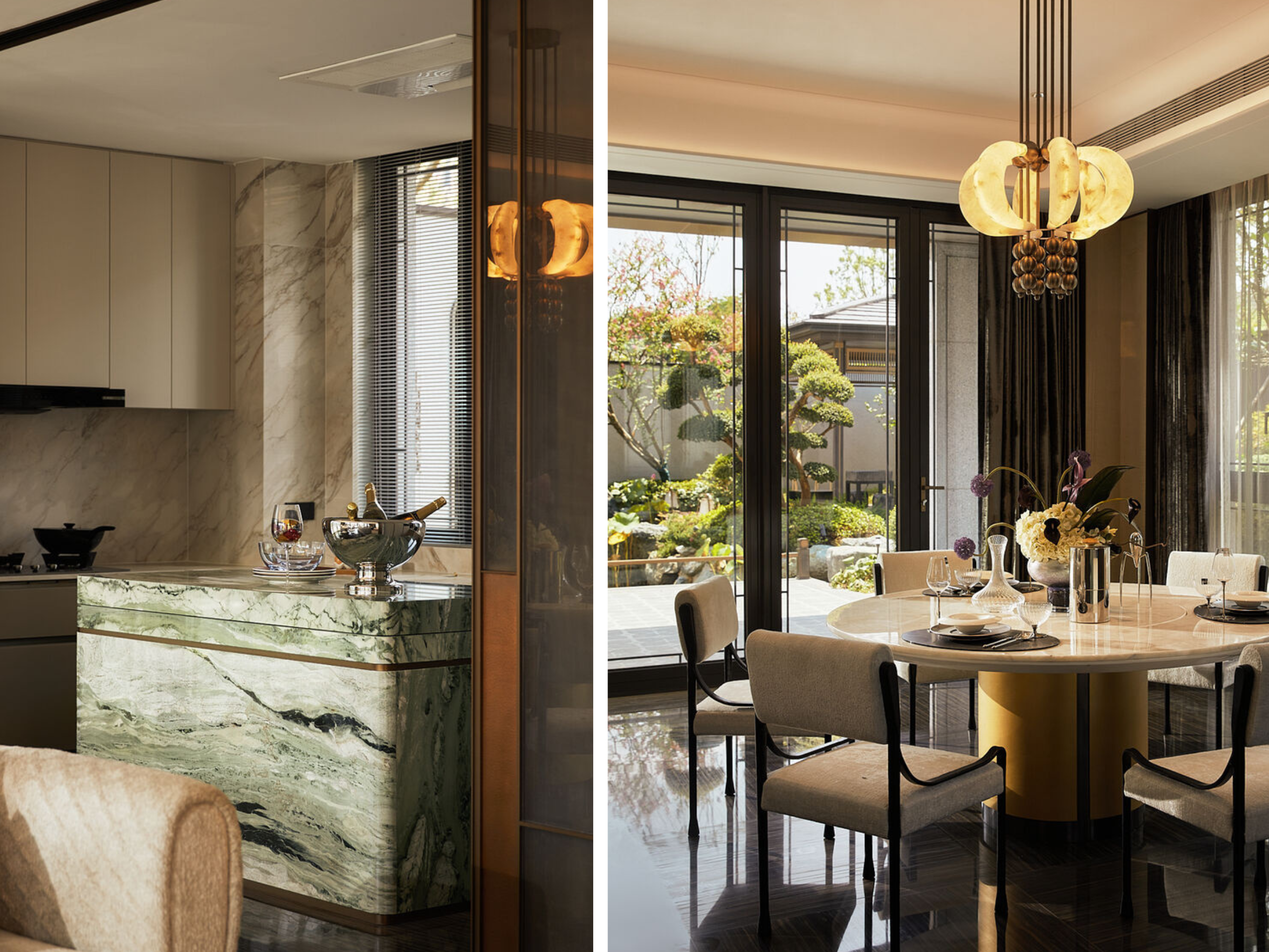 Khu vực bàn ăn được đặt tại vị trí có tầm nhìn đẹp ra sân trong, nơi ánh sáng và cây xanh tạo nên một không gian dùng bữa nhẹ nhàng, ấm cúng và đầy cảm xúc.