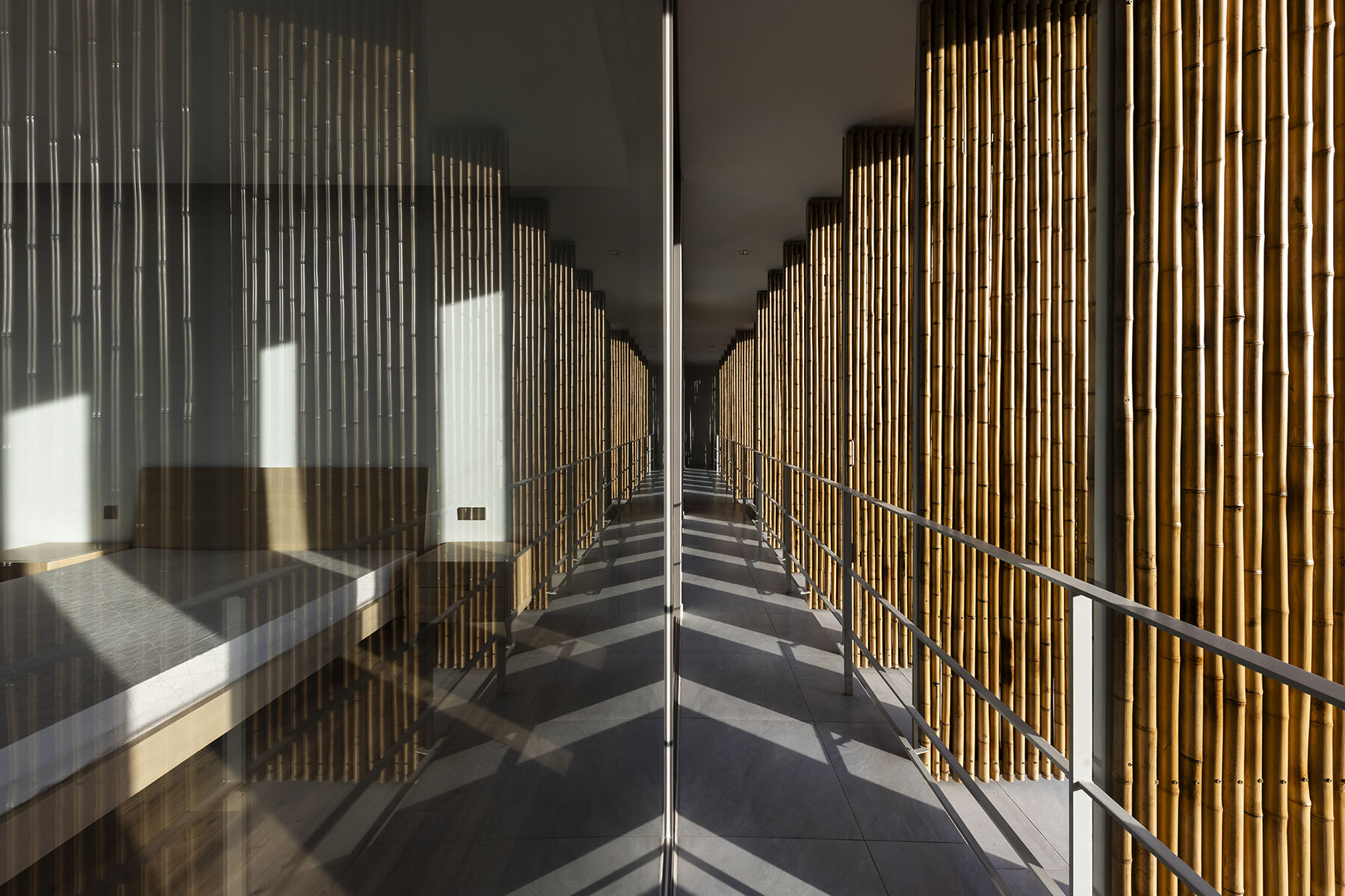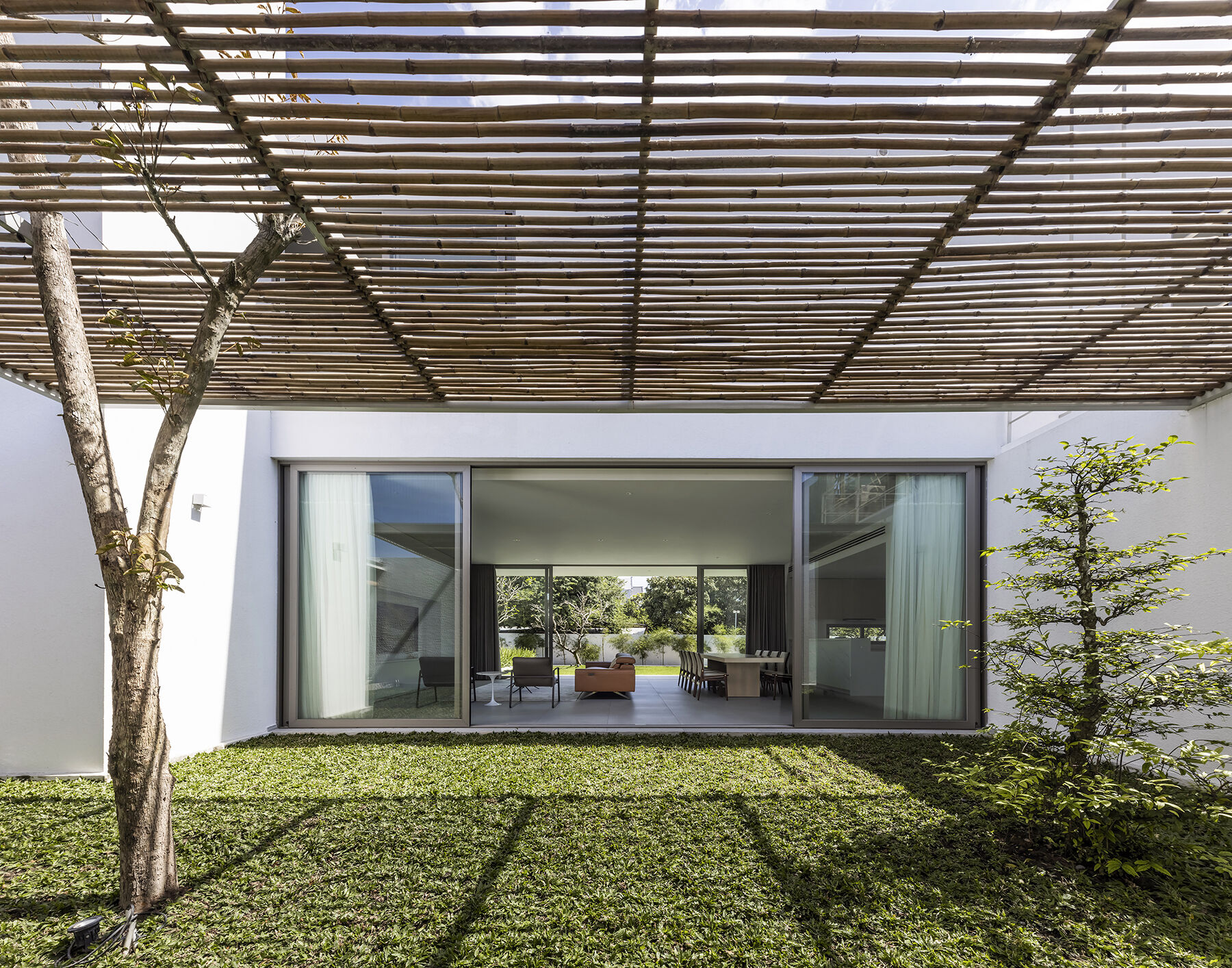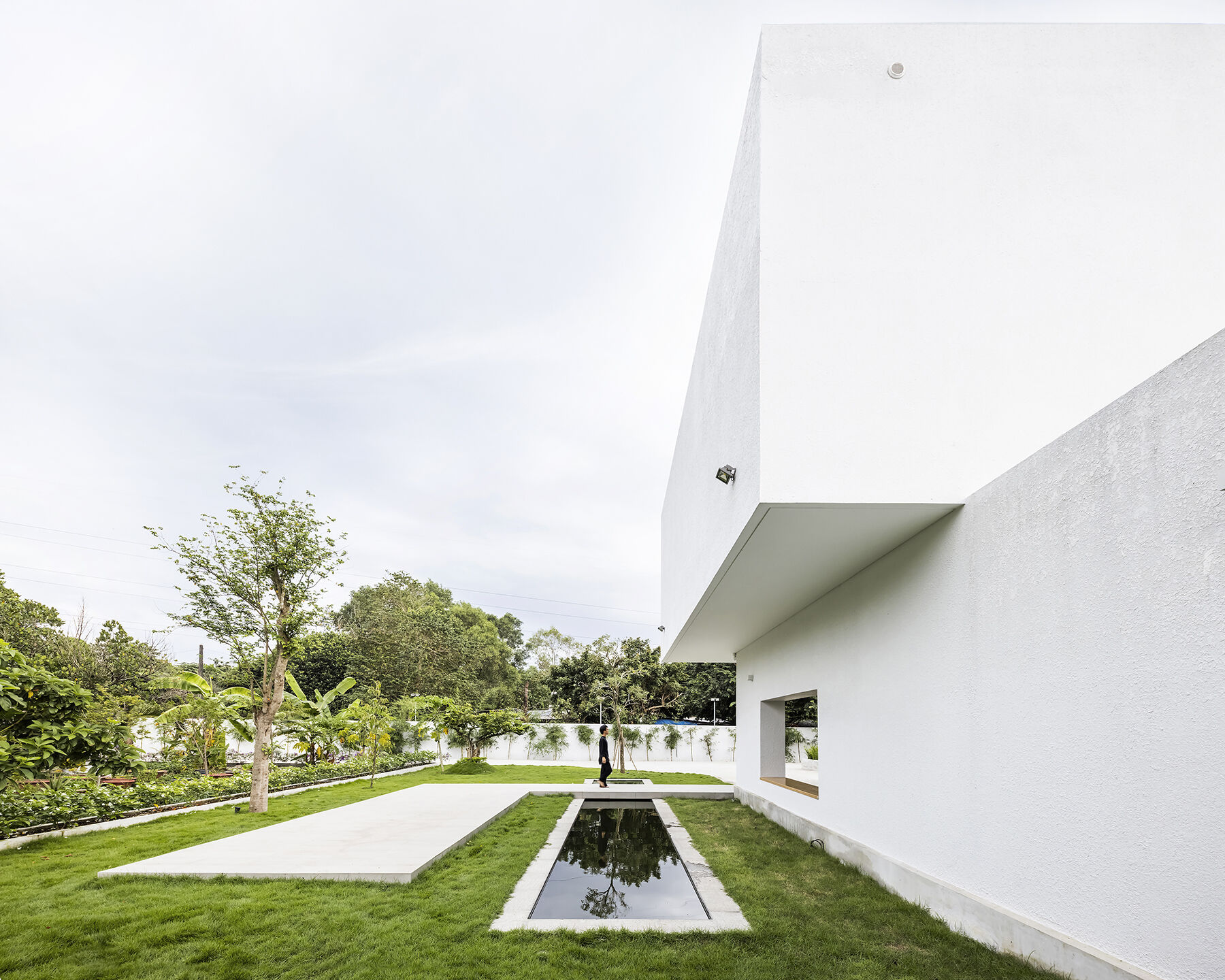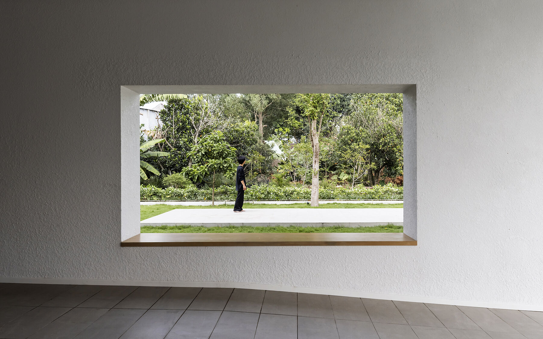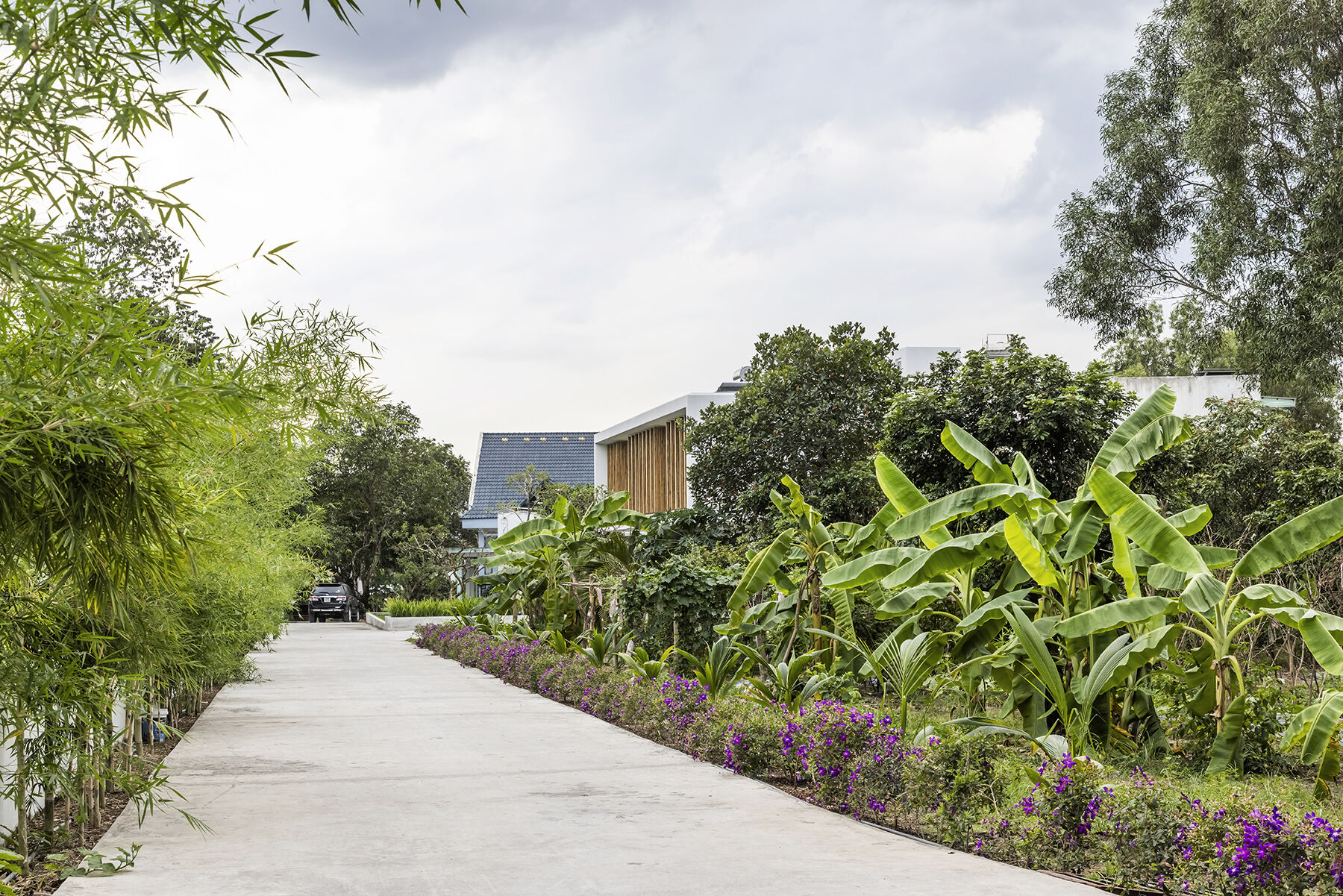 Các khối kiến trúc được bố trí lệch nhau một cách có chủ đích, hình thành nên những khoảng sân trong và khu vườn xen kẽ. Chính những khoảng “nghỉ” này giúp không gian luôn có độ thoáng, đồng thời tạo ra các lớp đệm tự nhiên giữa bên trong và bên ngoài.