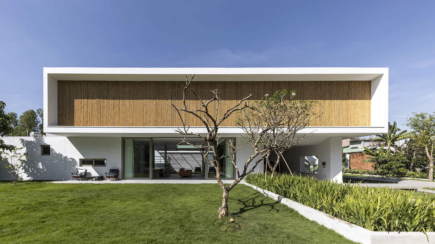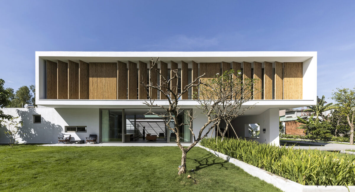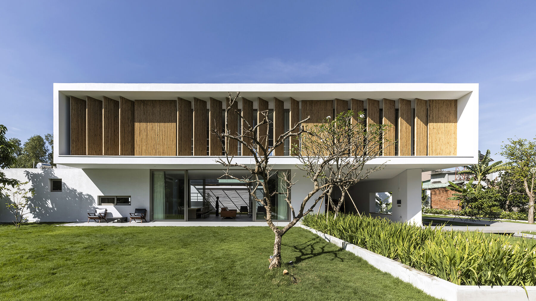 Mặt đứng của biệt thự được xử lý với các lớp vật liệu đan xen, tạo nên chiều sâu và sự chuyển động cho công trình. Hệ lam che nắng được sử dụng như một lớp “lọc ánh sáng”, vừa đảm bảo công năng vừa mang lại giá trị thẩm mỹ.