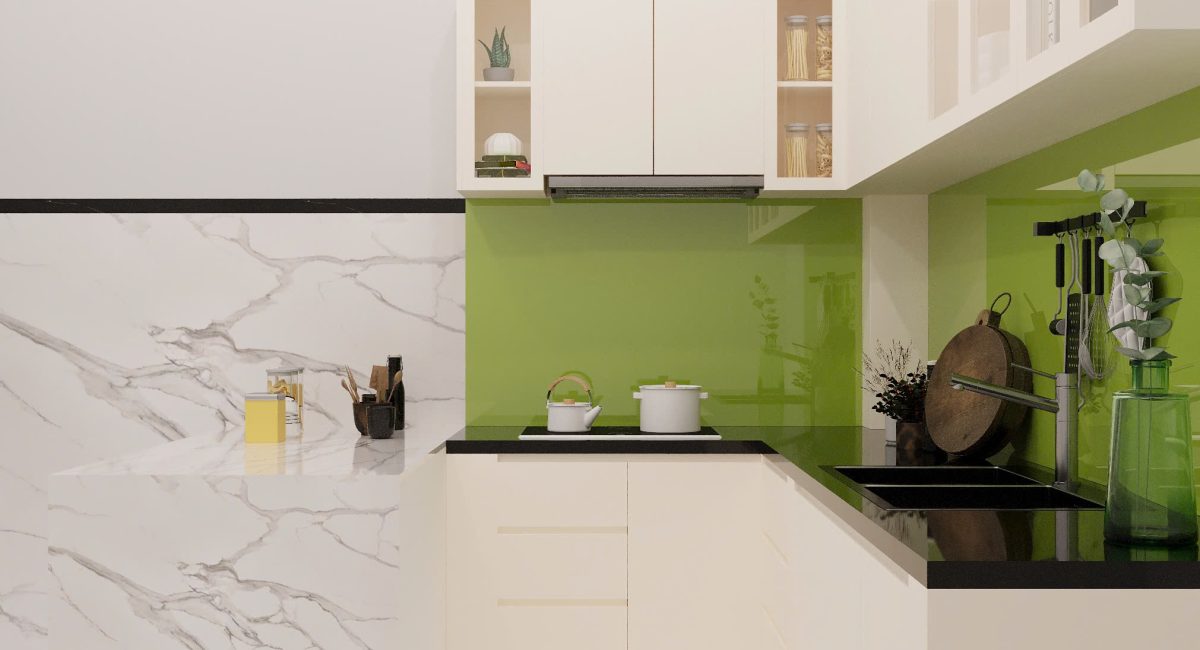Không gian bếp được làm nổi bật nhờ kính ốp bếp màu xanh lá non – màu sắc tươi mát, trẻ trung, tạo cảm giác thư giãn, sạch sẽ, đồng thời giúp phản chiếu ánh sáng, mở rộng không gian về mặt thị giác.