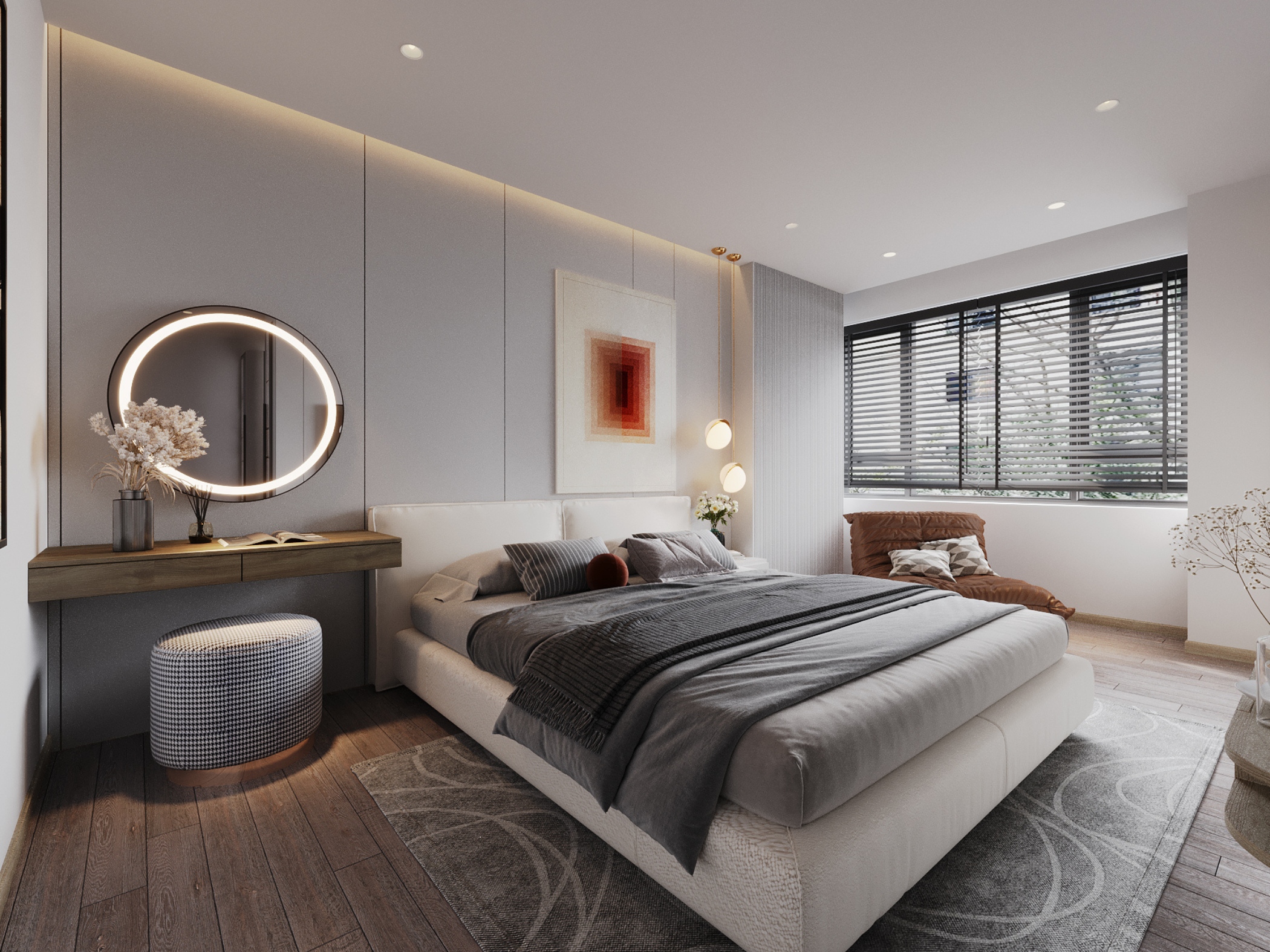 Phòng ngủ của căn hộ được thiết kế theo tinh thần tối giản, tập trung vào sự thoải mái. Gam màu trung tính tiếp tục được duy trì, kết hợp cùng ánh sáng tự nhiên để tạo nên một không gian thư giãn.