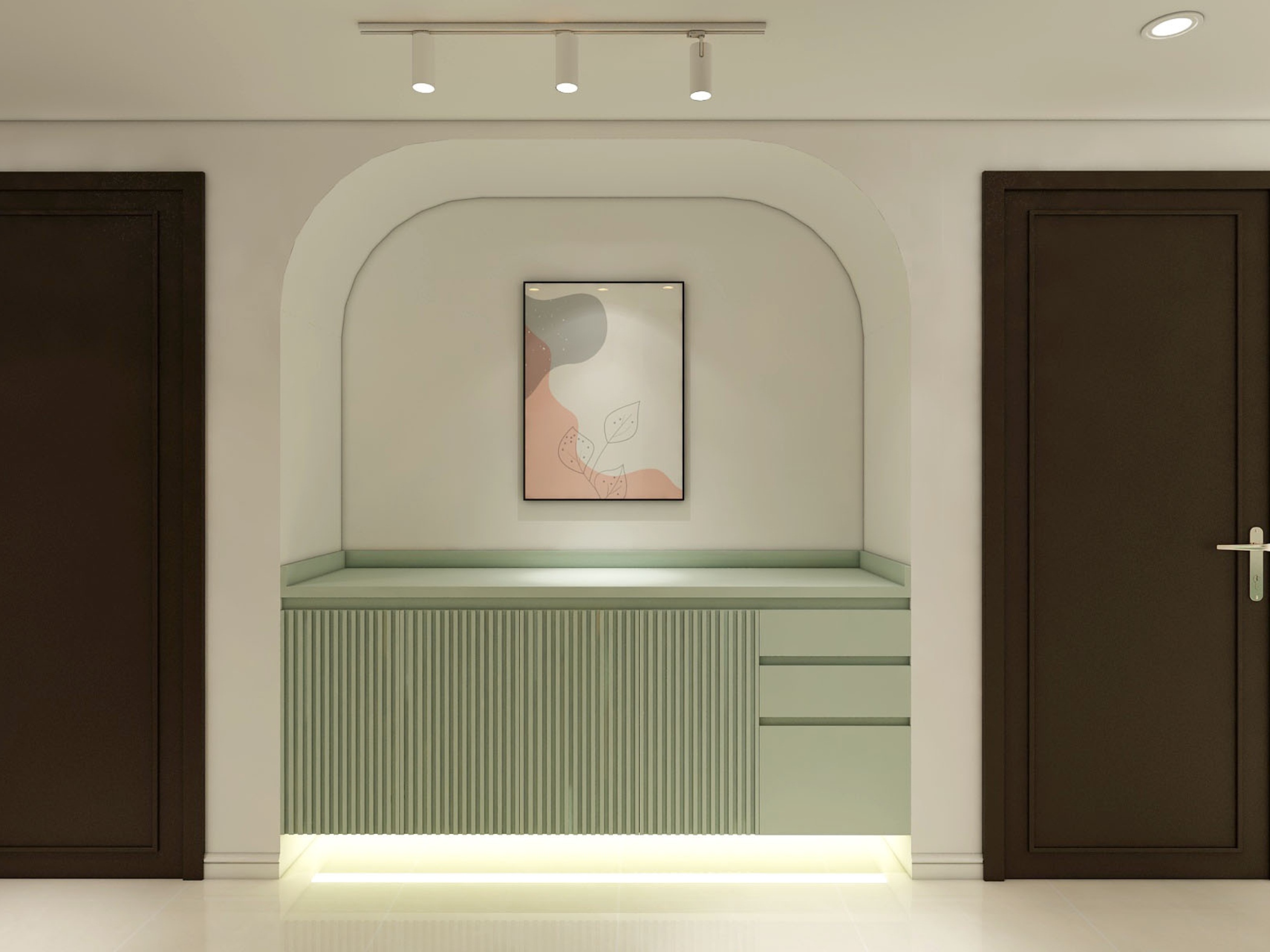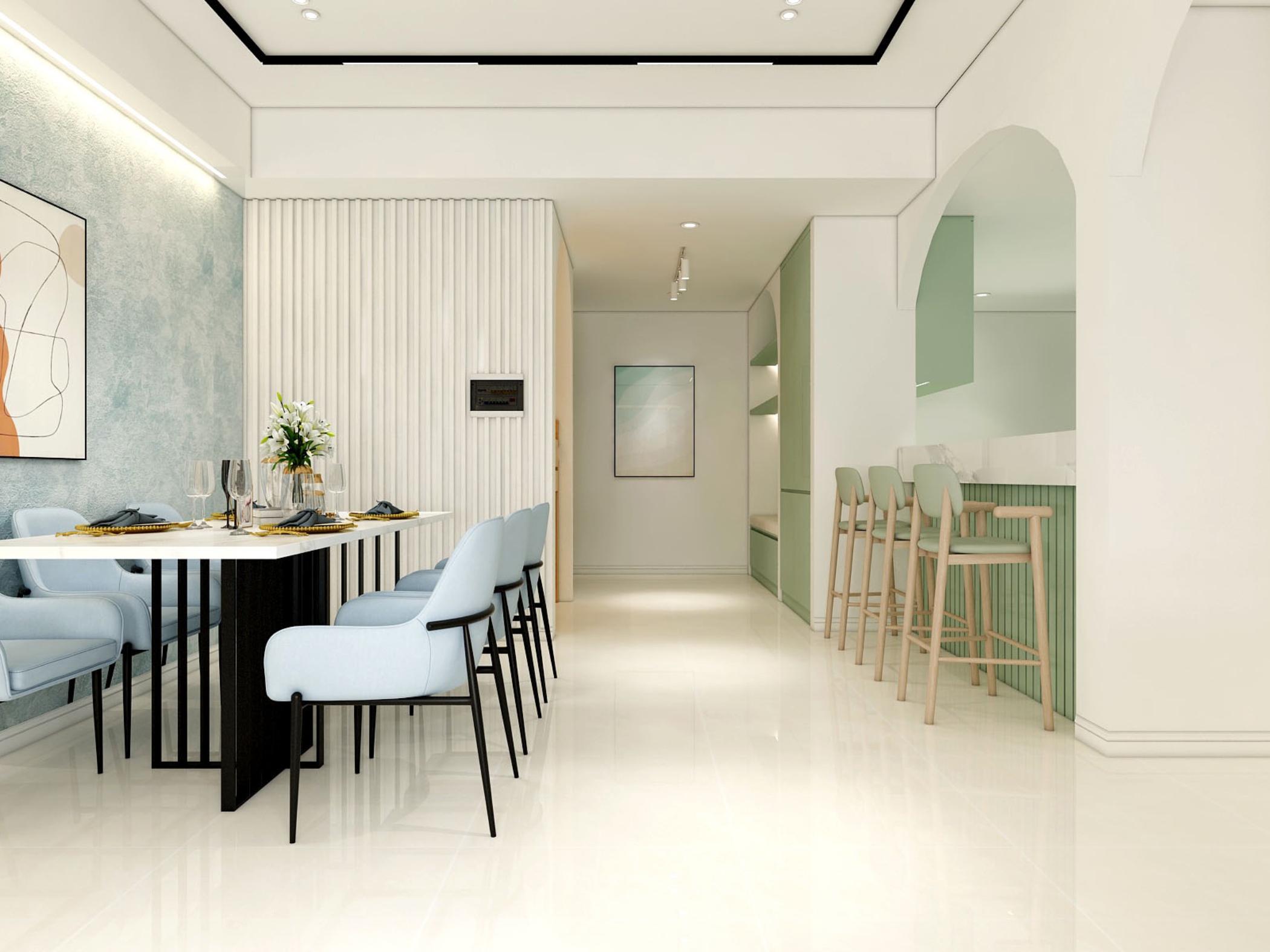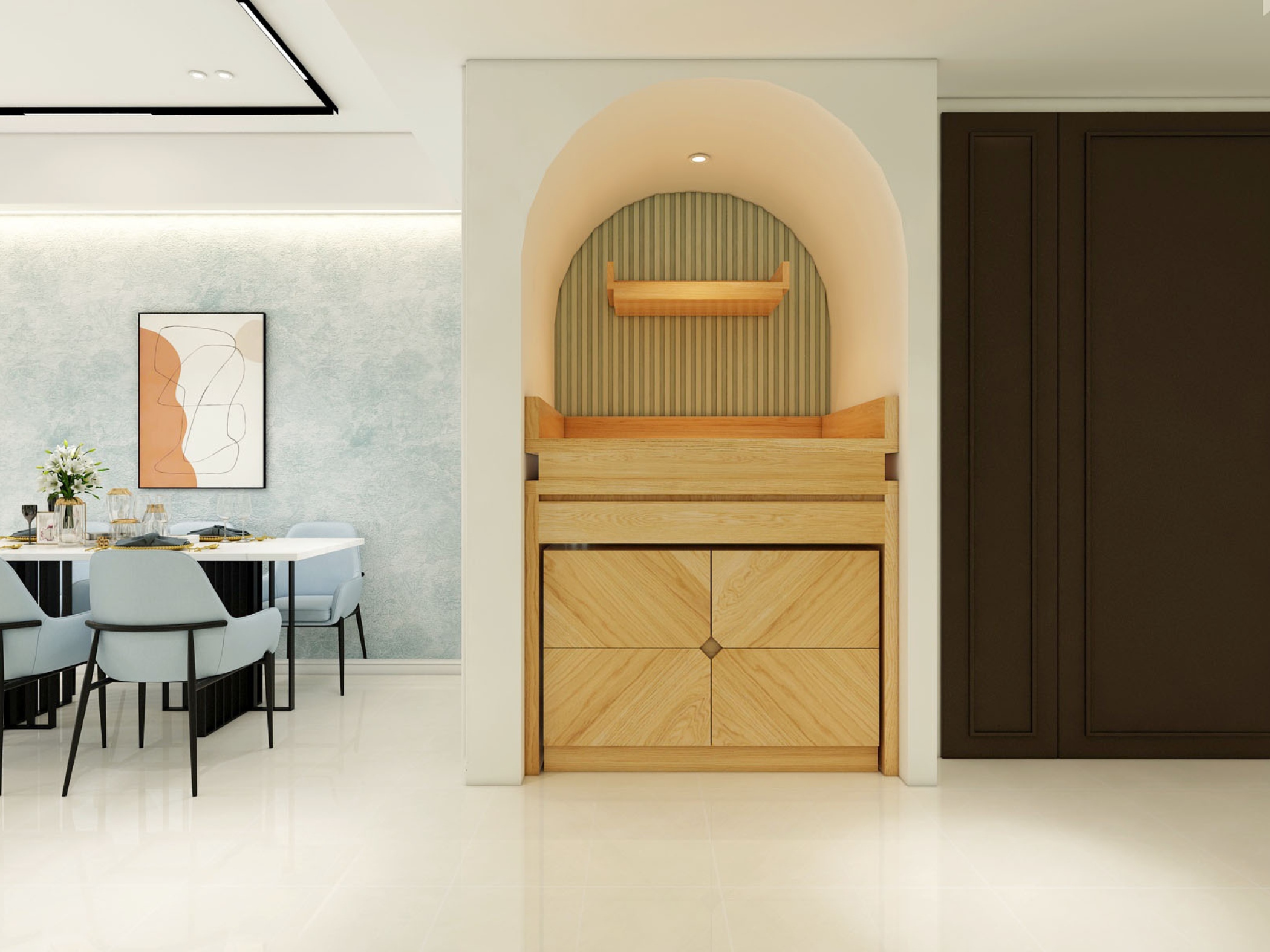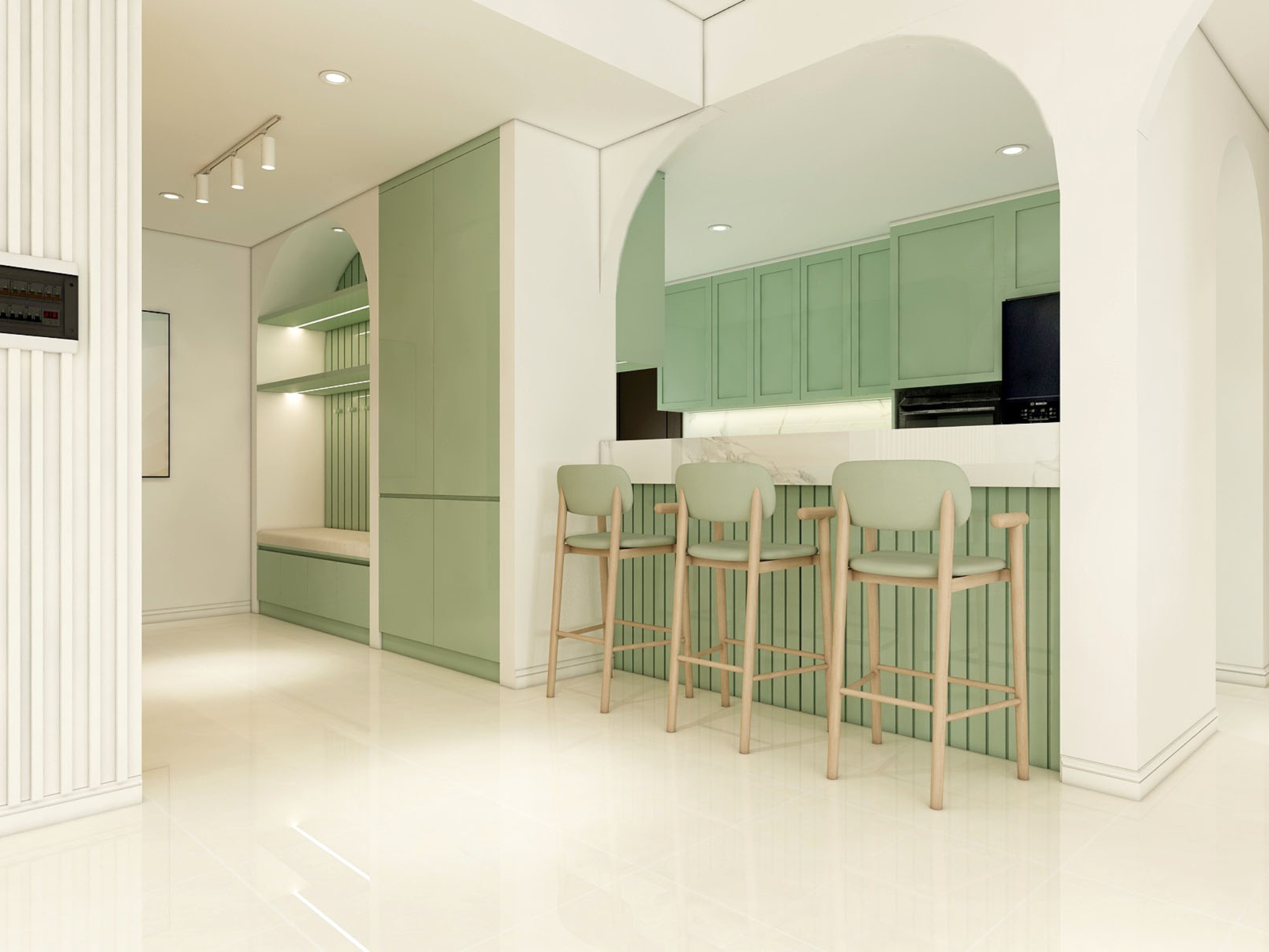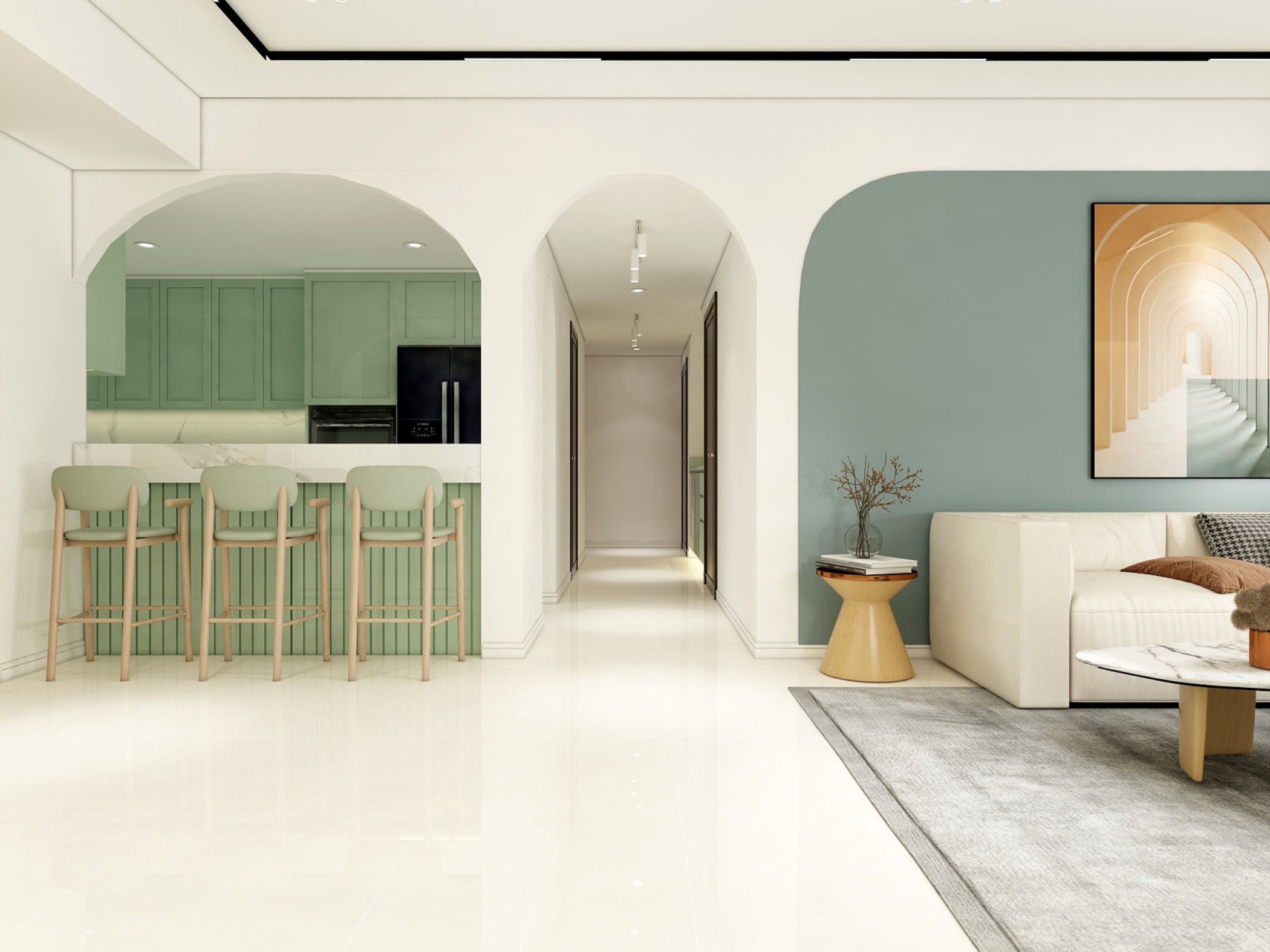 Một trong những điểm nổi bật của căn hộ là việc sử dụng các đường cong vòm xuyên suốt trong thiết kế. Từ lối vào, khu vực bếp cho đến các mảng tường trang trí, những chi tiết bo cong được xử lý khéo léo giúp không gian trở nên mềm mại, giảm bớt cảm giác cứng nhắc thường thấy.