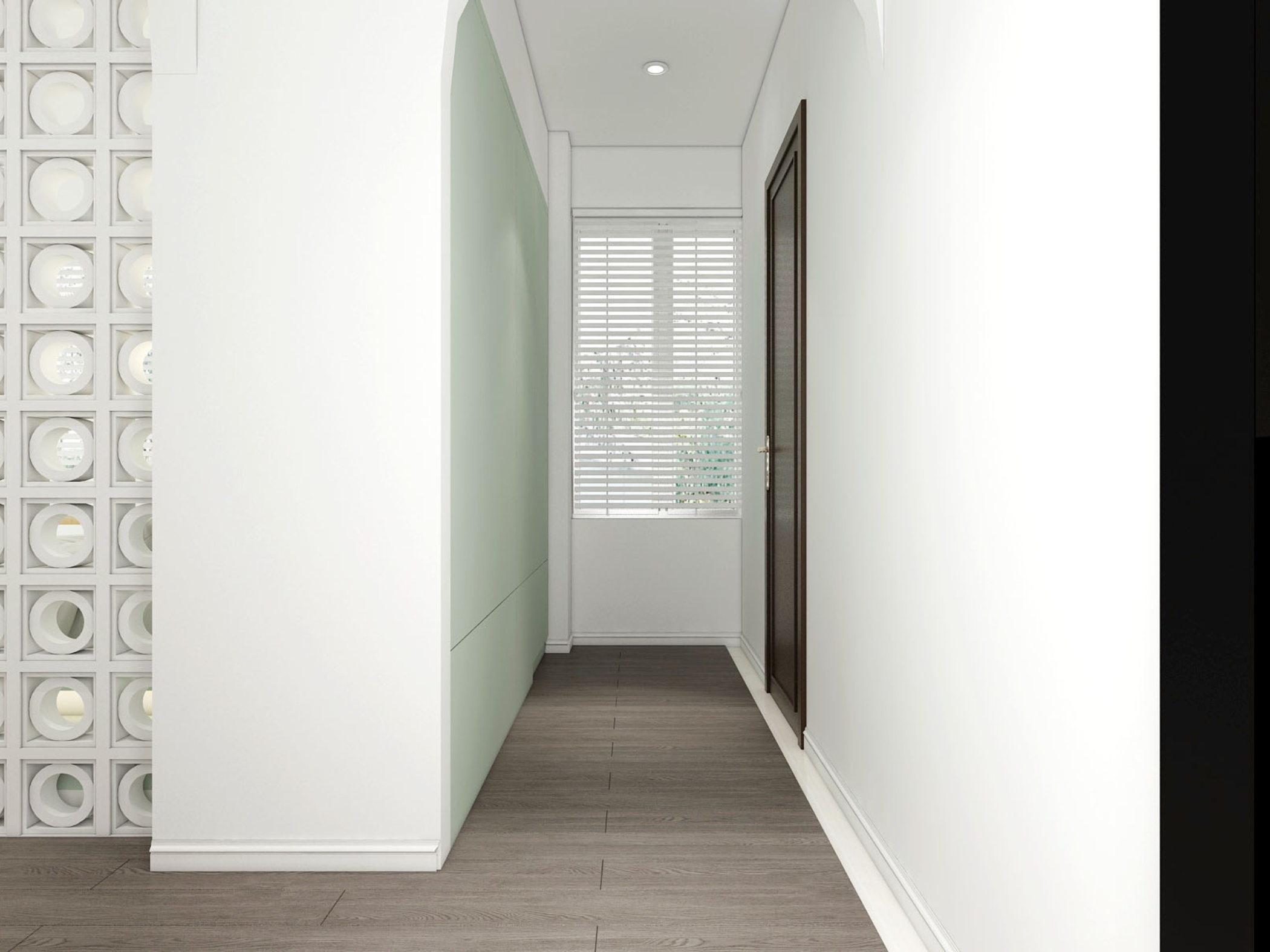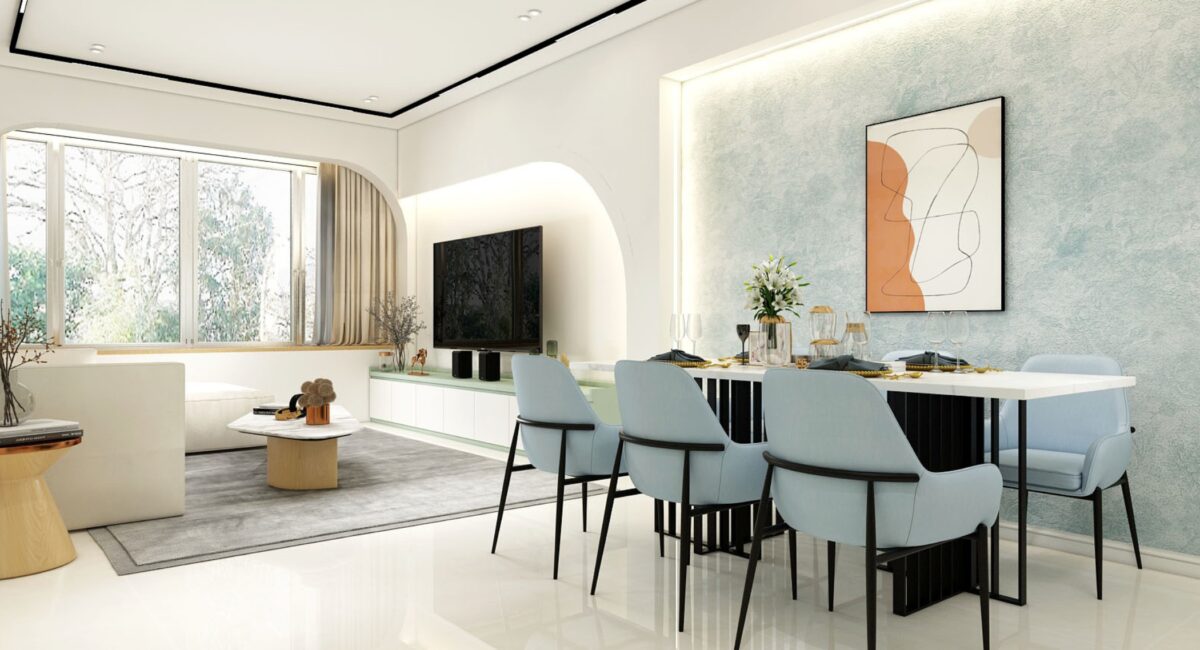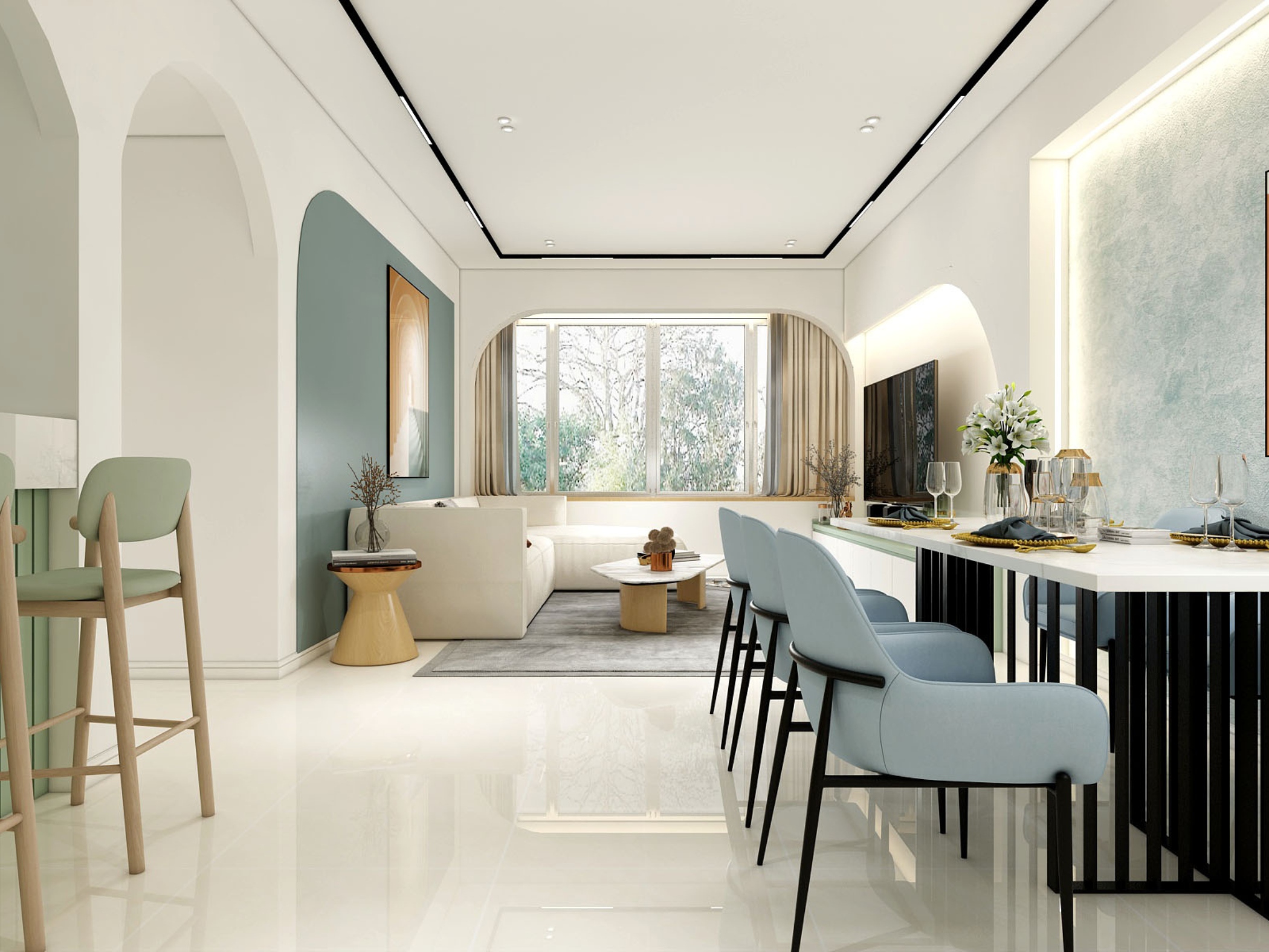Ngay từ tổng thể, căn hộ tạo ấn tượng với bảng màu sáng chủ đạo, kết hợp cùng các gam xanh pastel dịu mắt. Sự phối hợp này không chỉ mang lại cảm giác thư giãn mà còn giúp không gian trở nên rộng rãi, thoáng đãng hơn.
