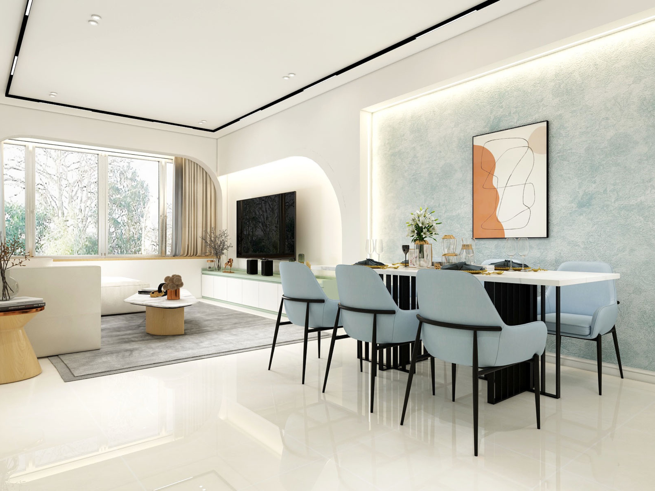 Đặc biệt, mảng tường nhấn với gam xanh nhẹ kết hợp tranh nghệ thuật trừu tượng đã trở thành điểm dừng thị giác đầy tinh tế, giúp không gian có chiều sâu mà không cần quá nhiều chi tiết trang trí.