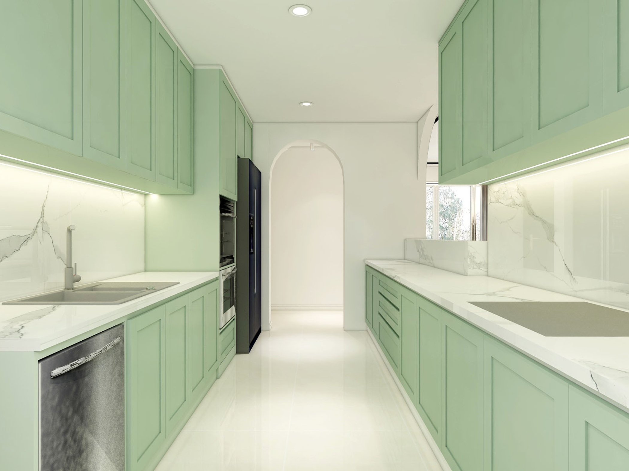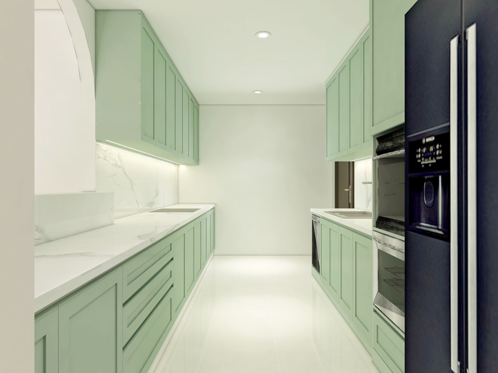 Không gian bếp được thiết kế theo dạng chữ I kết hợp đảo nhỏ, sử dụng gam xanh pastel chủ đạo. Hệ tủ bếp được thi công đồng bộ, tối giản về tay nắm, tạo nên tổng thể gọn gàng và hiện đại.