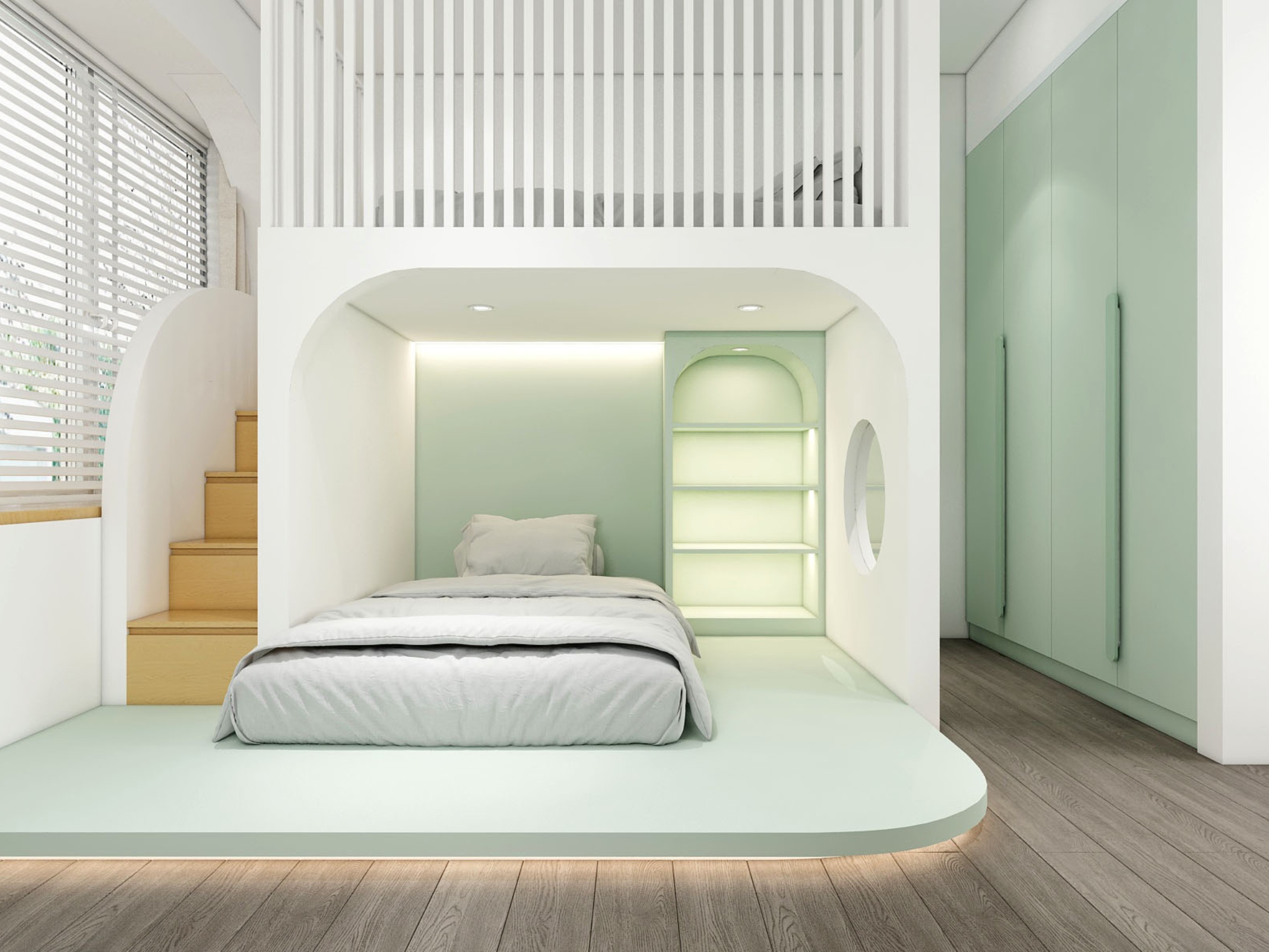 Giường ngủ thiết kế thấp, liền khối với tổng thể nội thất mang lại cảm giác hiện đại và gọn gàng. Hệ tủ quần áo âm tường giúp tối ưu diện tích, trong khi ánh sáng tự nhiên từ cửa sổ lớn góp phần tạo nên không gian nghỉ ngơi lý tưởng.