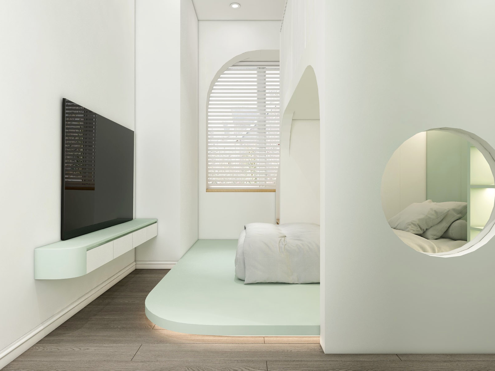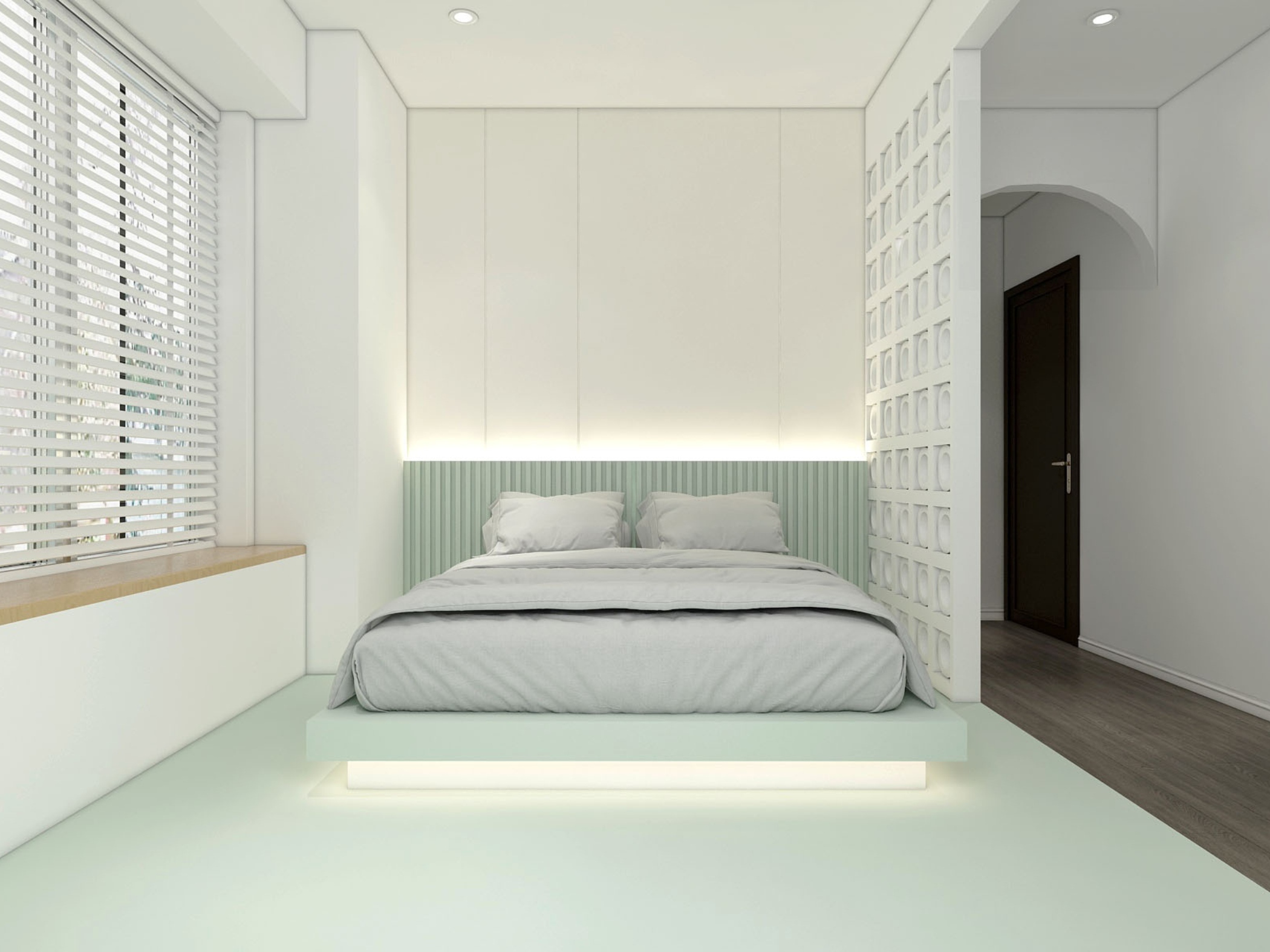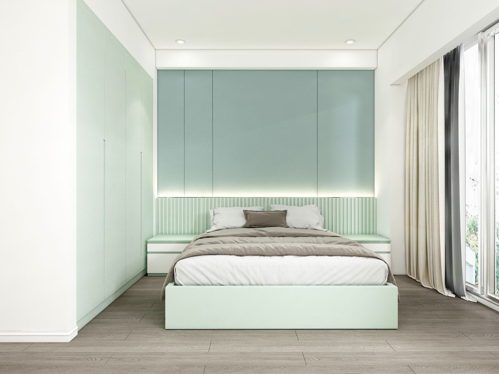 Phòng ngủ trong căn hộ được thiết kế theo hướng tối giản, ưu tiên sự thoải mái. Gam màu xanh nhạt tiếp tục được sử dụng, kết hợp với sàn gỗ ấm áp giúp cân bằng thị giác.