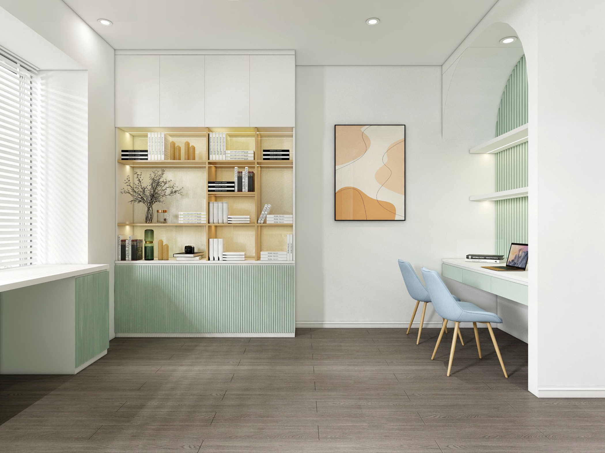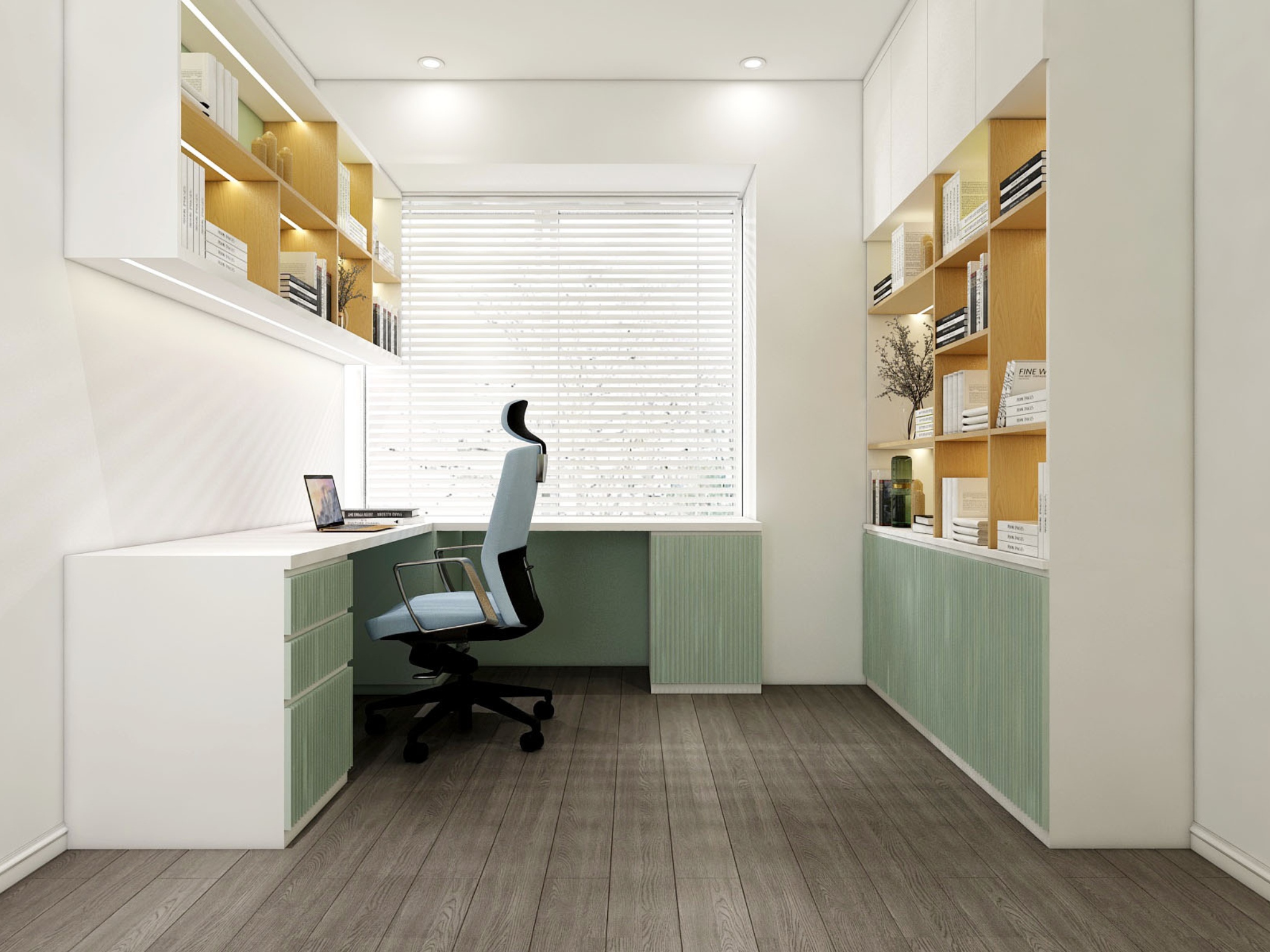 Sự kết hợp giữa màu trắng, xanh pastel và chất liệu gỗ tạo nên một môi trường làm việc nhẹ nhàng, giúp tăng sự tập trung nhưng không gây cảm giác áp lực.
