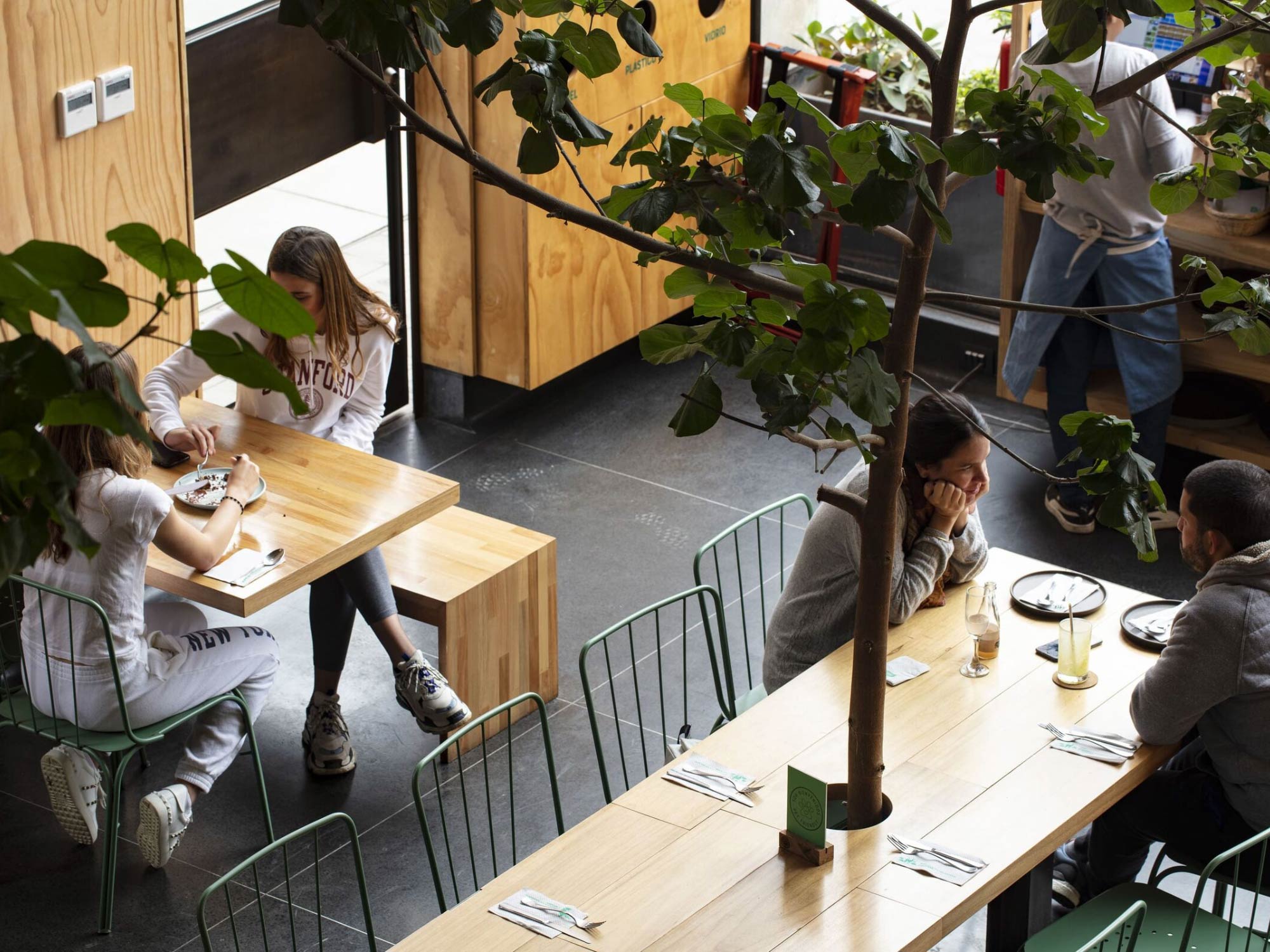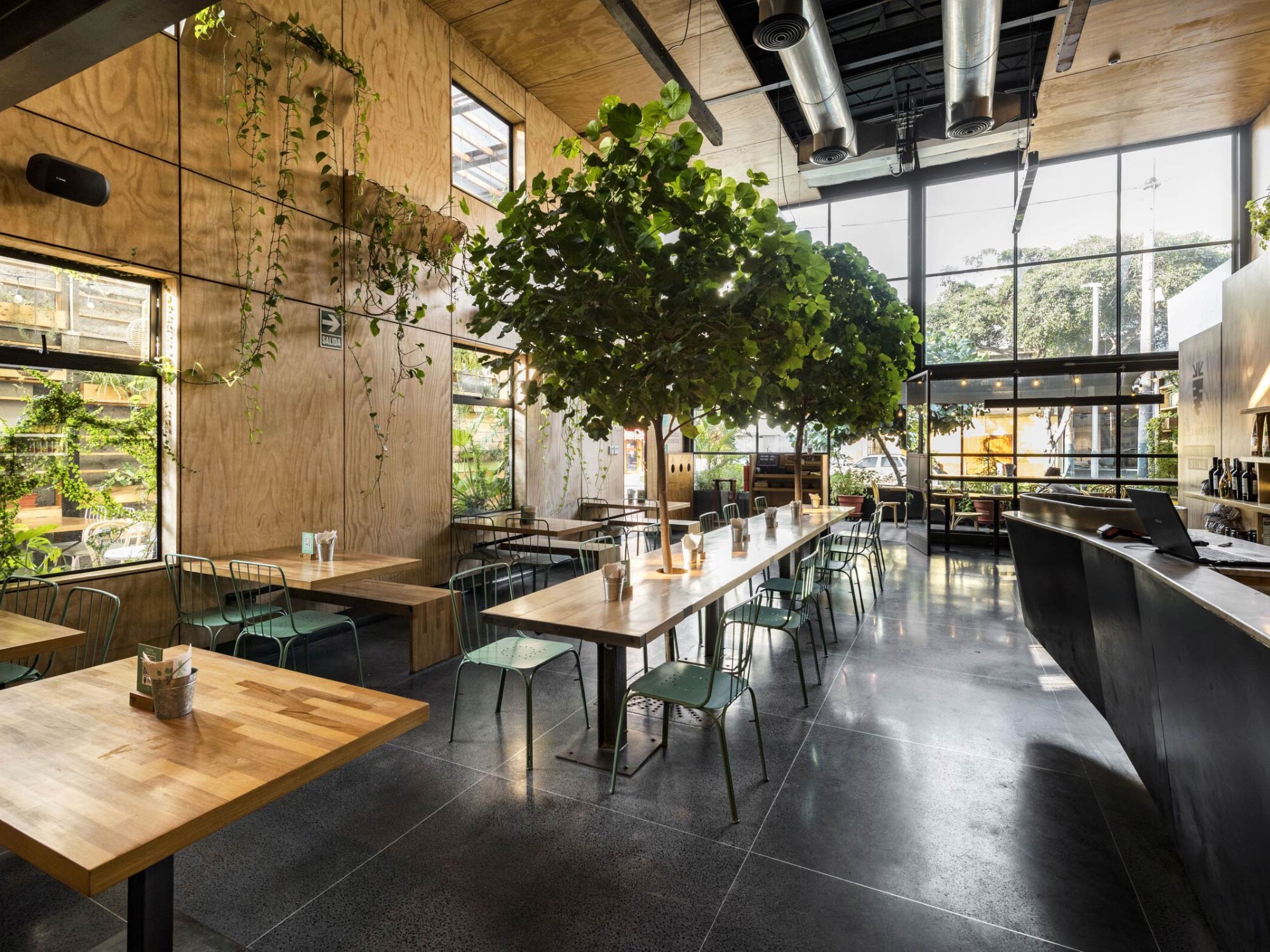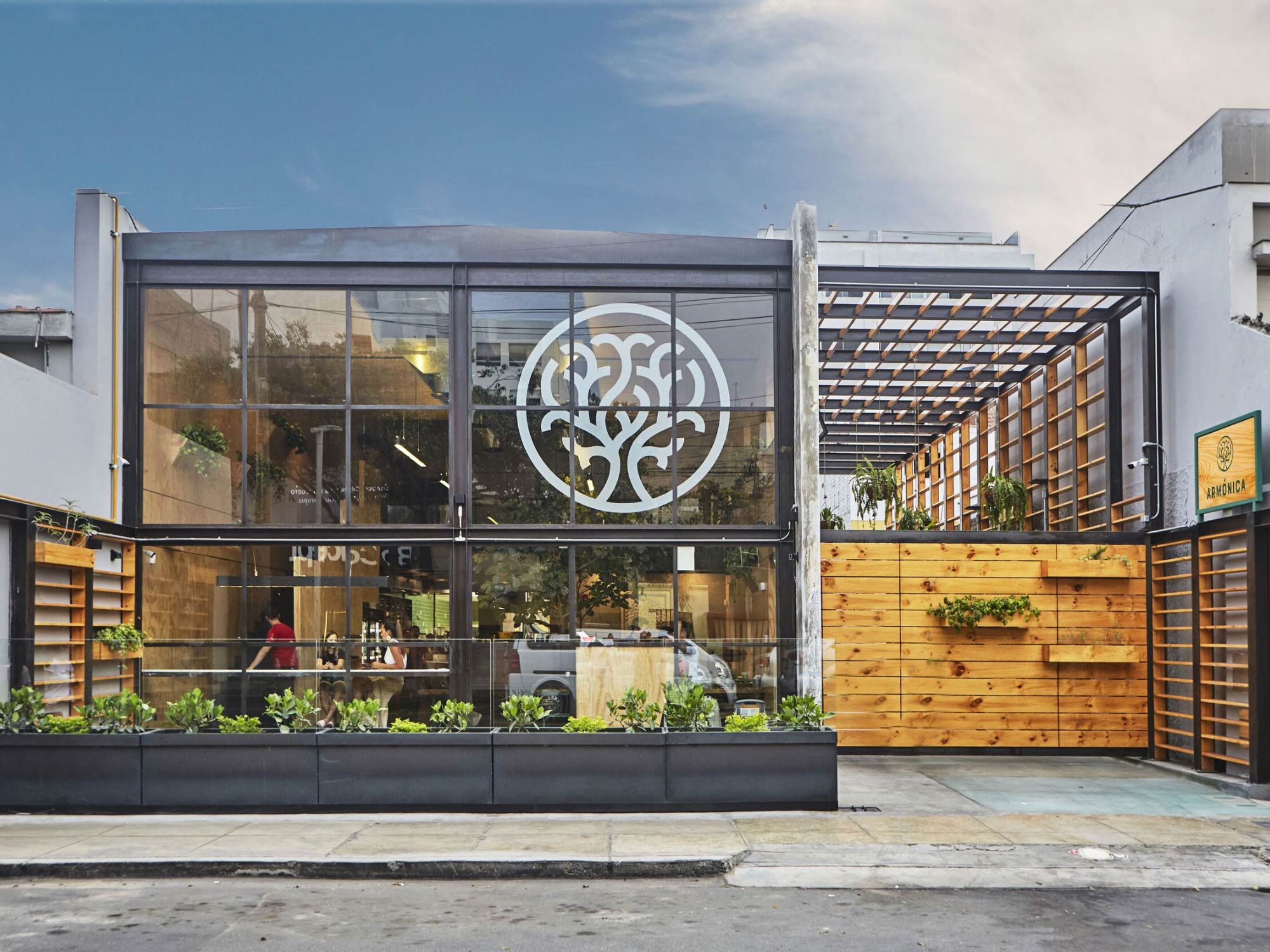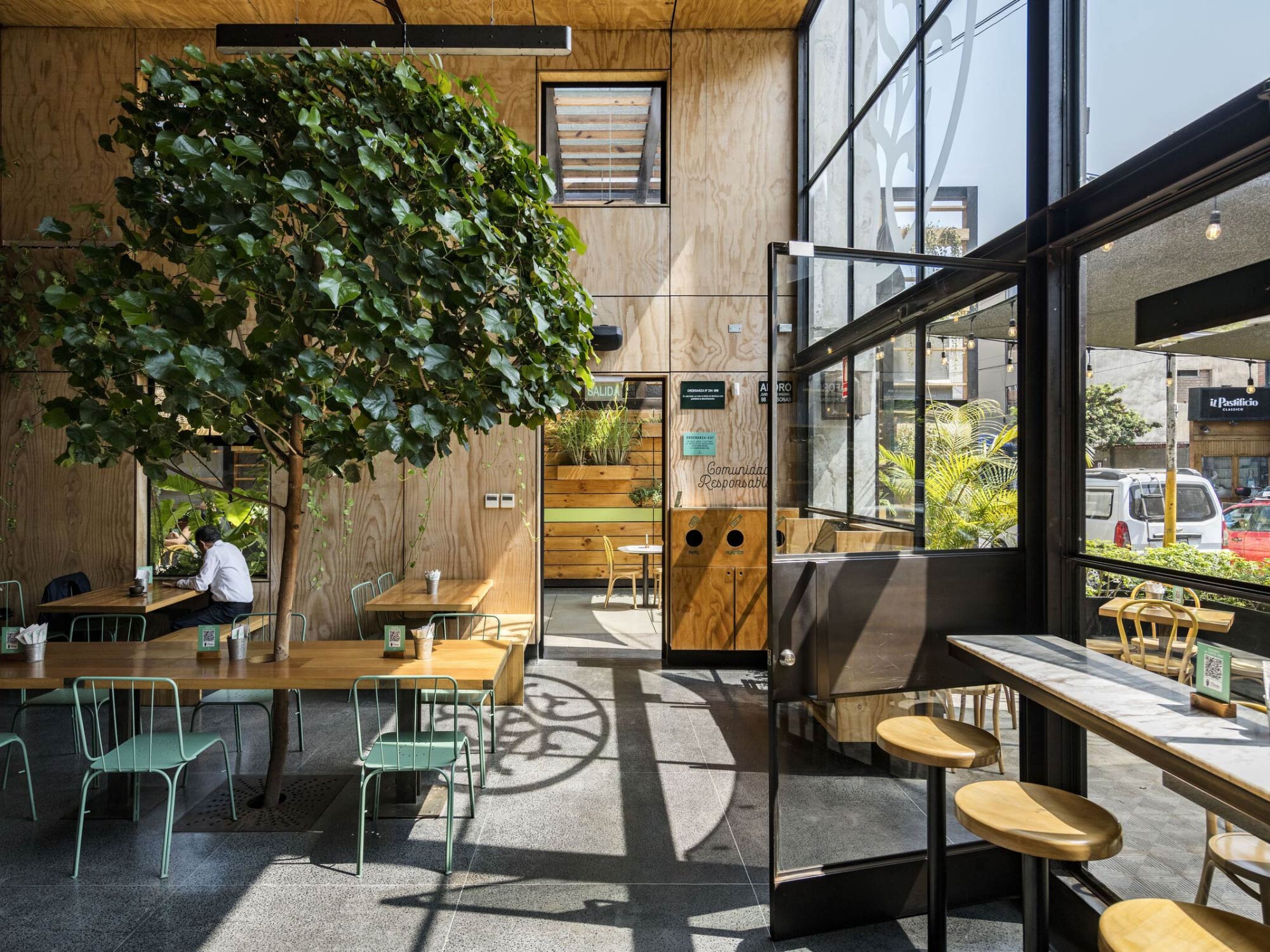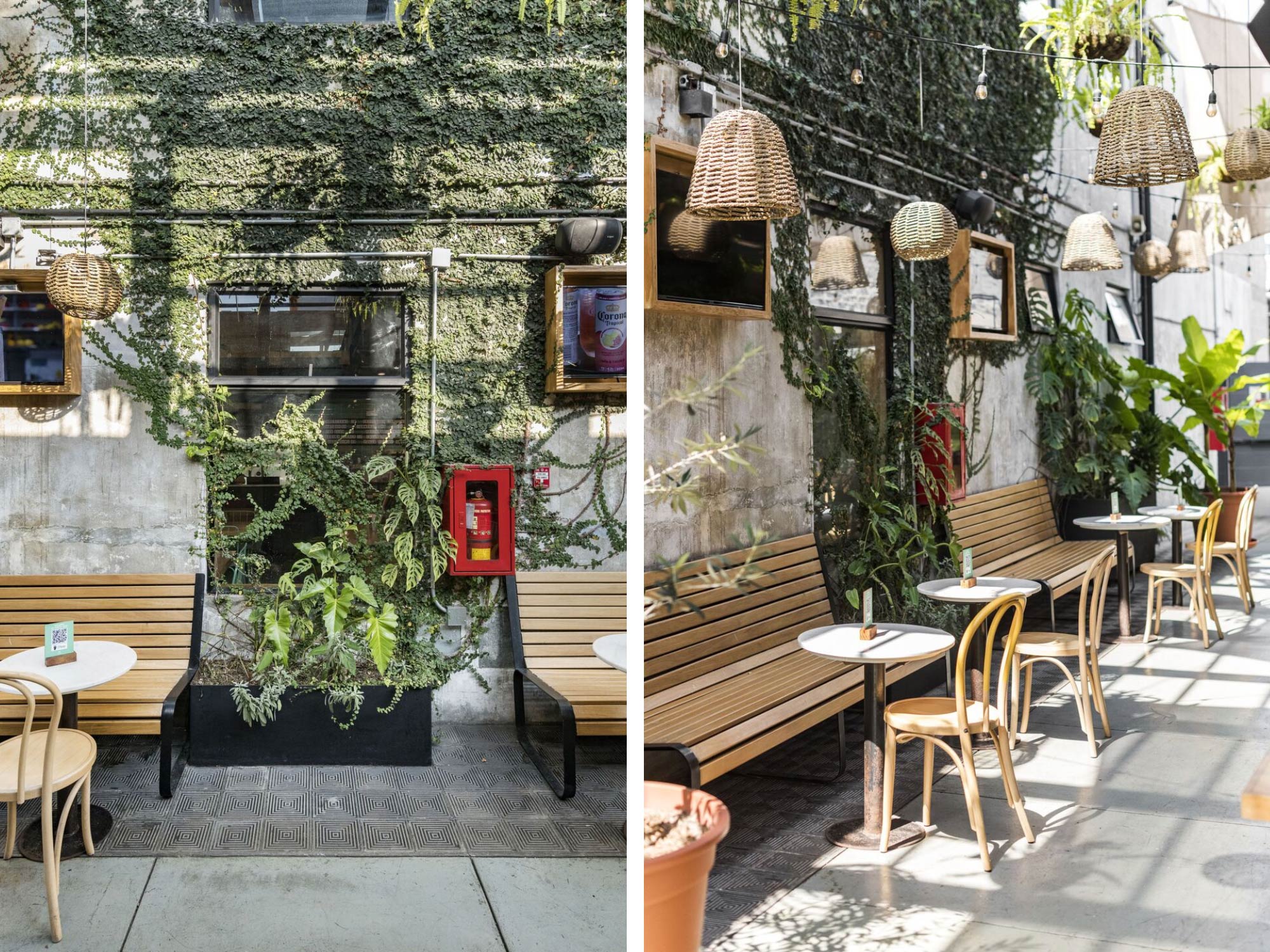 Một trong những điểm đáng chú ý nhất của công trình là việc xử lý mặt đứng bằng cách “lùi vào” thay vì bám sát ranh đất. Quyết định này giúp mở rộng khu vực terrace, tạo thêm không gian sử dụng ngoài trời đồng thời tăng tương tác với đường phố. Kết hợp với hệ façade kính lớn, công trình đạt được độ “mở” cao, xóa nhòa ranh giới giữa bên trong và bên ngoài. Đây là giải pháp vừa mang tính kiến trúc, vừa mang giá trị kinh doanh – khi không gian trở nên thu hút và dễ tiếp cận hơn với khách hàng.