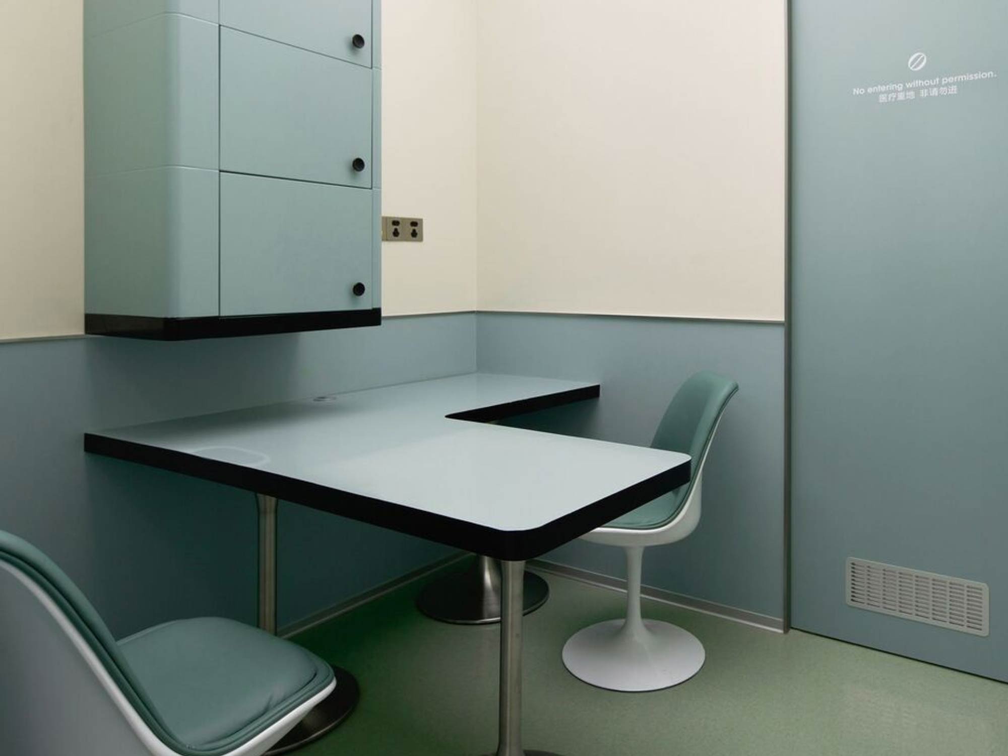 Tầng dưới mang hơi hướng cổ điển với sàn gạch xương cá và tông xanh đậm, gợi nhớ đến các cửa hàng cao cấp châu Âu. Trong khi đó, các tầng trên chuyển dần sang sắc trắng và xanh lạnh, phù hợp với không gian y tế và chăm sóc thú cưng.
