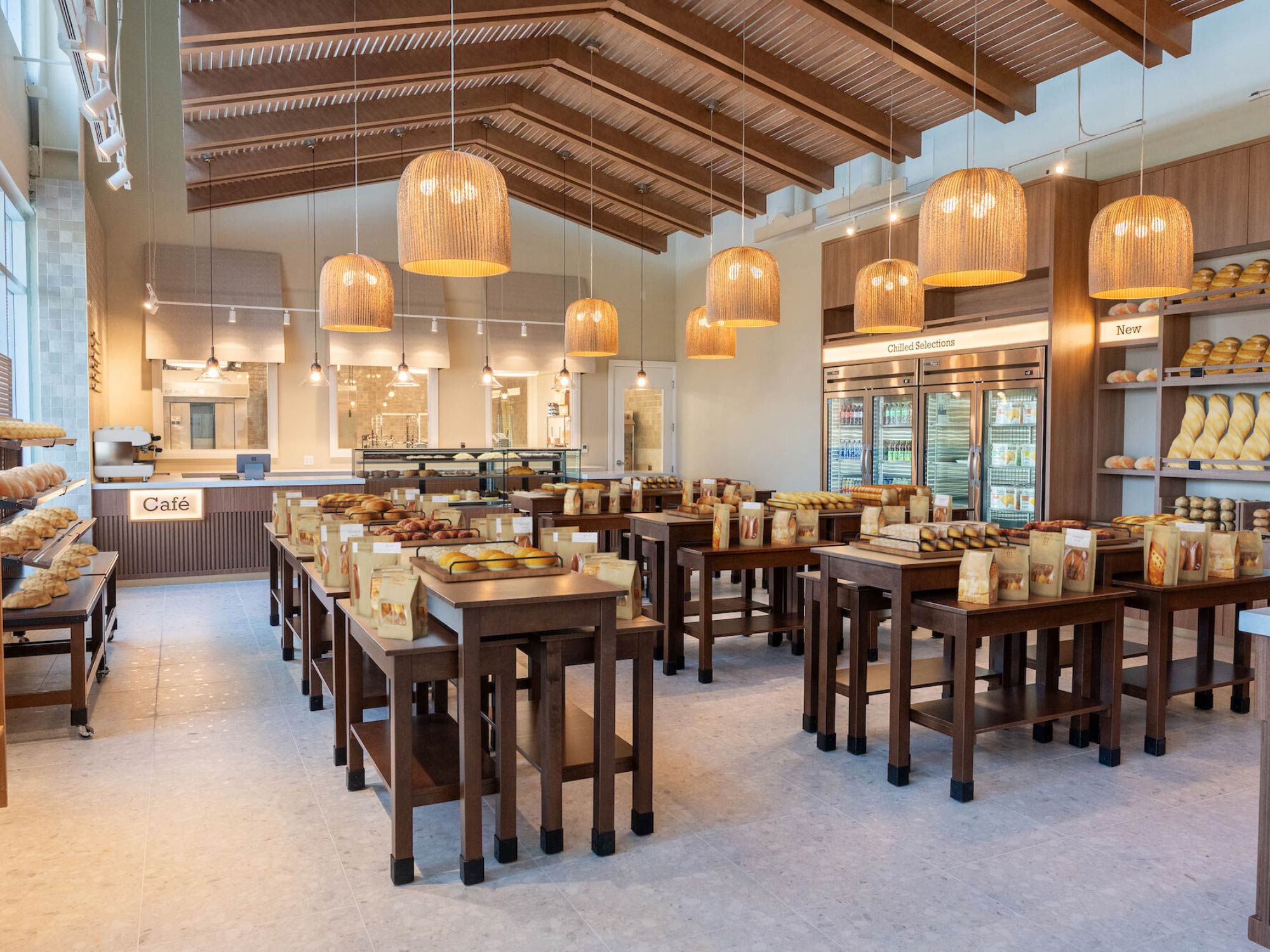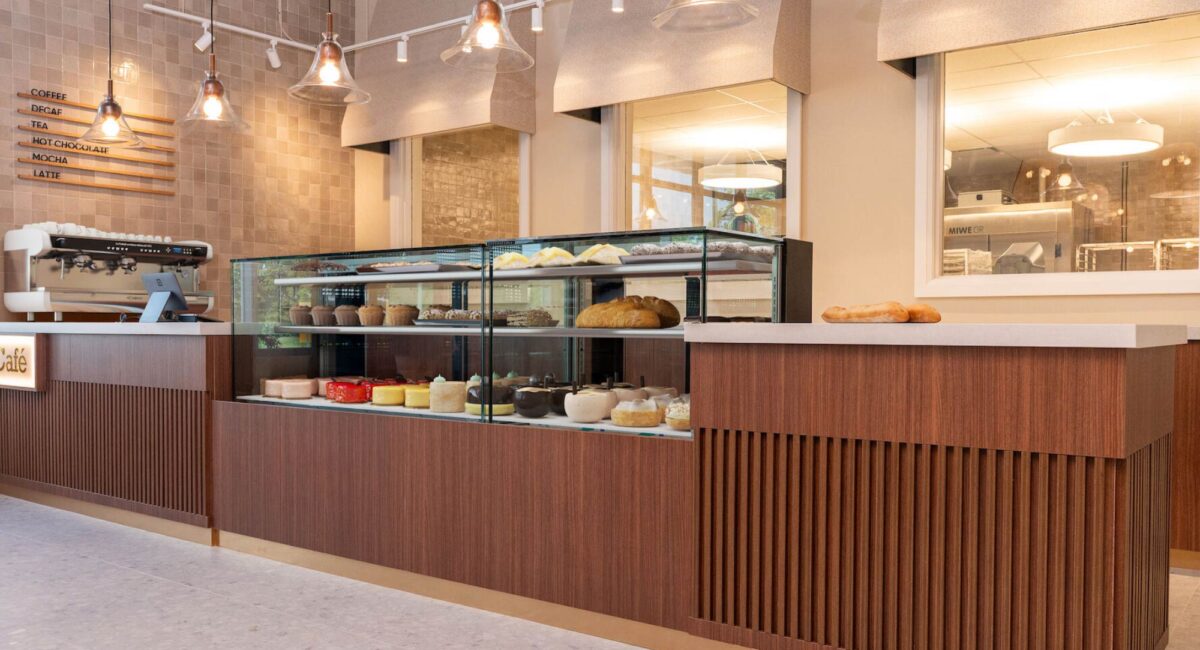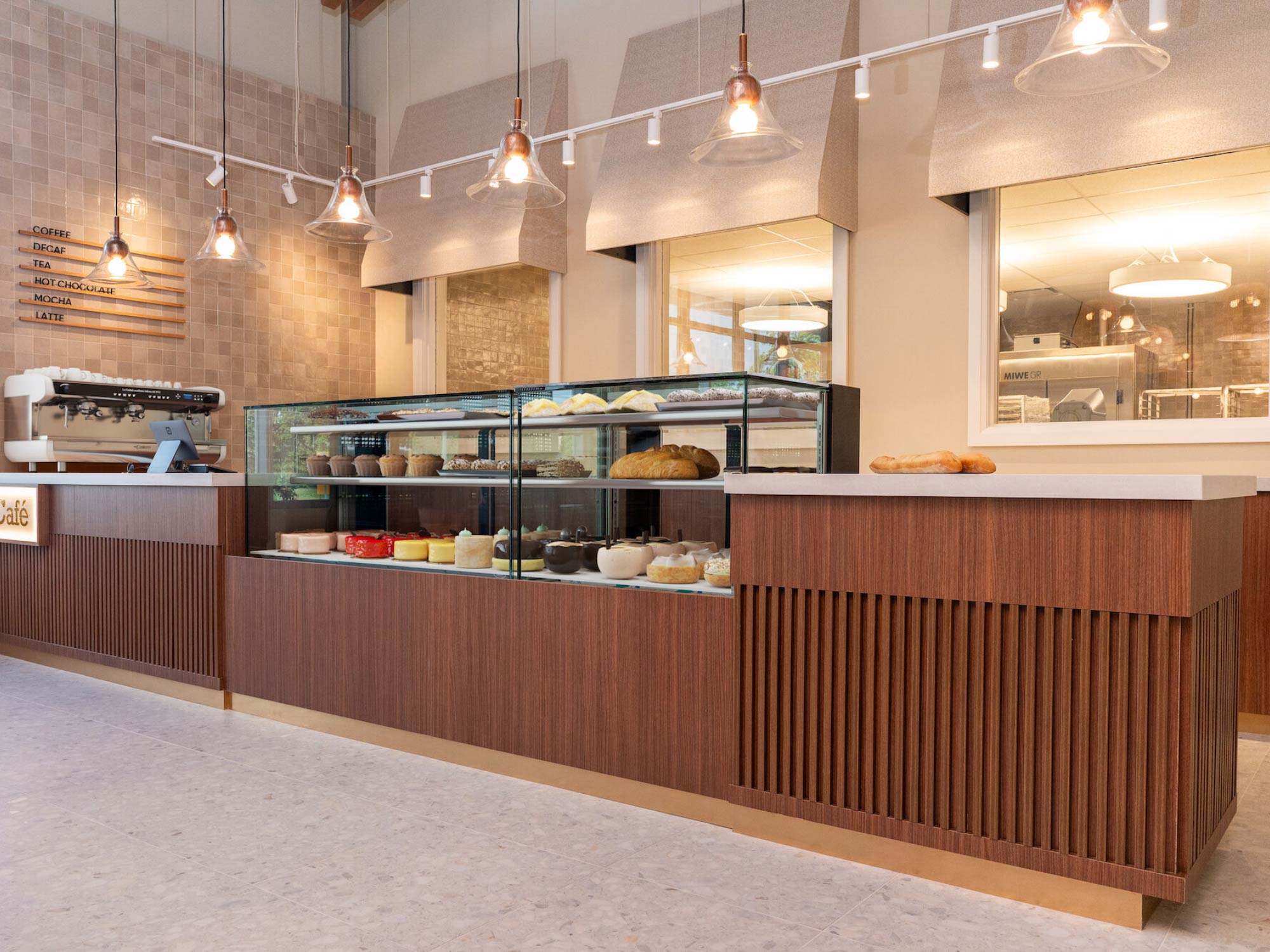 Mặt bằng được tổ chức theo dạng mở, với khu vực trưng bày bánh đặt ở trung tâm, quầy phục vụ bố trí phía sau và các kệ tường chạy dọc hai bên. Cách bố trí này giúp khách hàng dễ dàng tiếp cận sản phẩm từ nhiều hướng, đồng thời tối ưu luồng di chuyển mà không gây cảm giác chật chội. BLUEWOOD chủ động tạo khoảng thở giữa các cụm bàn trưng bày để không gian luôn thông thoáng, đồng thời giữ được nhịp điệu thị giác xuyên suốt.