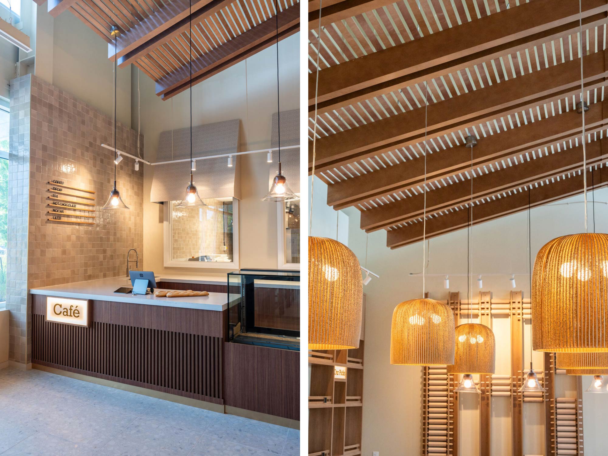Một trong những điểm nhấn quan trọng của công trình là hệ lam gỗ được sử dụng xuyên suốt từ quầy bar, mảng tường đến trần. Các chi tiết được lặp lại có chủ đích, tạo nên nhịp điệu thị giác đồng nhất và tăng chiều sâu không gian. Hệ lam không chỉ mang tính trang trí mà còn giúp phân tách không gian một cách mềm mại, tránh sự cứng nhắc của các vách ngăn truyền thống. Đây là cách BLUEWOOD sử dụng thiết kế để vừa đảm bảo công năng, vừa nâng cao giá trị thẩm mỹ.