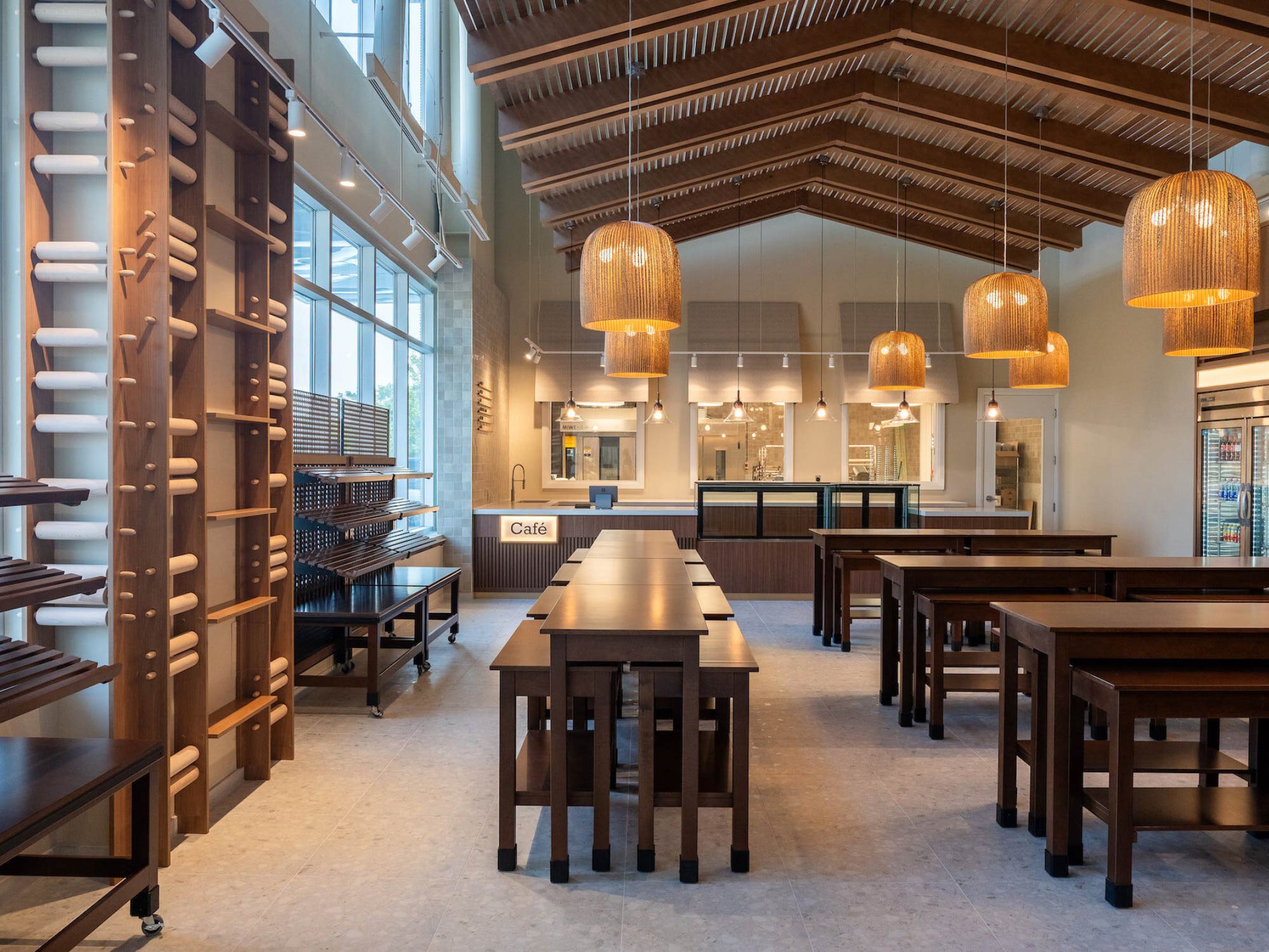 Trần cao được tận dụng tối đa với hệ khung gỗ chạy dọc theo mái, tạo cảm giác không gian rộng rãi và thoáng đãng hơn. Các thanh gỗ được bố trí theo dạng nan, vừa giúp giảm cảm giác trống trải, vừa tạo hiệu ứng ánh sáng và bóng đổ thú vị. Đây là giải pháp thiết kế mang tính kỹ thuật nhưng đồng thời cũng là yếu tố tạo nên bản sắc riêng cho công trình.