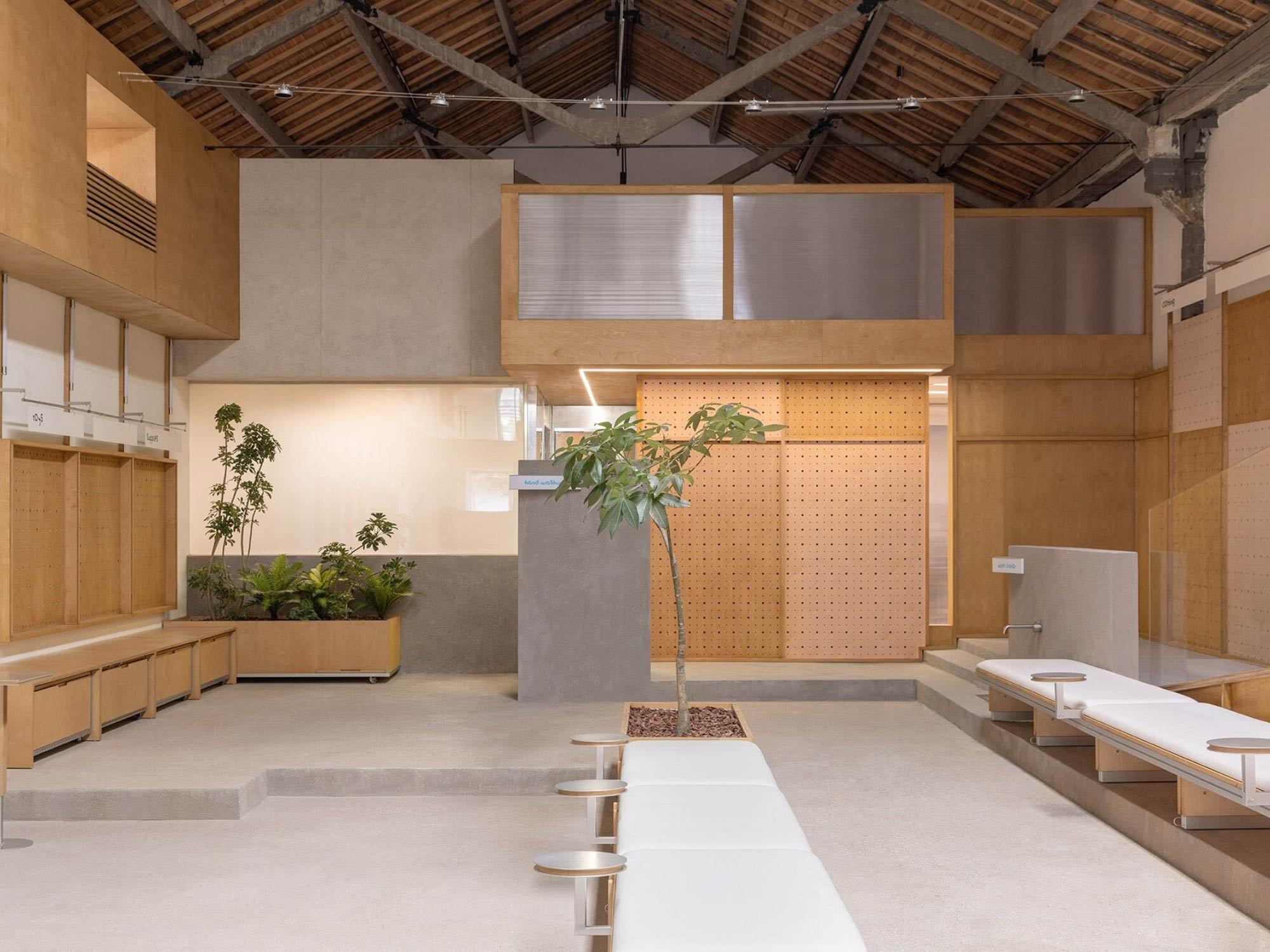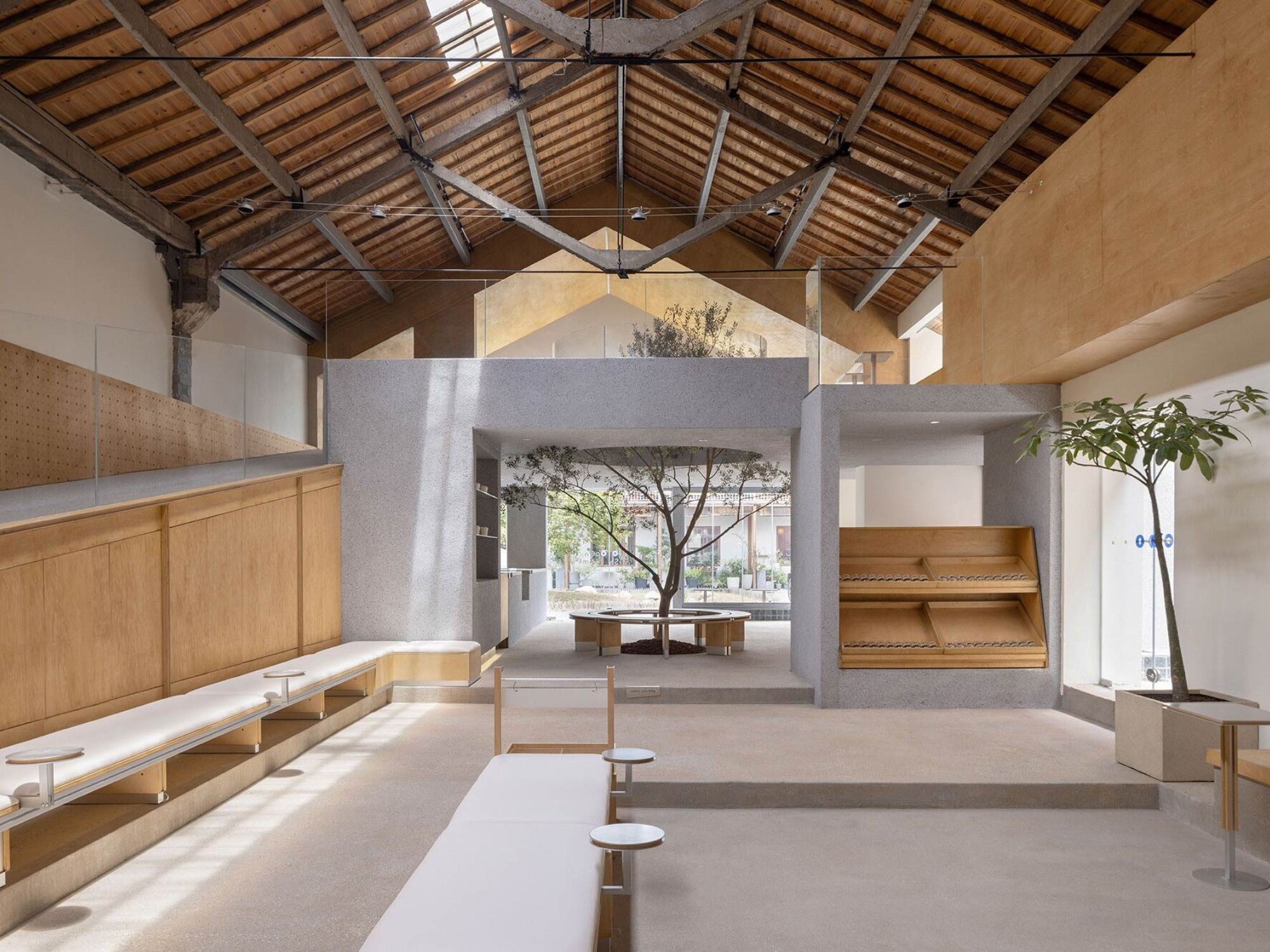 Một trong những điểm nổi bật của Healing Pets là cách xử lý mối quan hệ giữa kiến trúc hiện hữu và yếu tố thiết kế mới. Thay vì xóa bỏ hoàn toàn cấu trúc cũ, BLUEWOOD lựa chọn giữ lại những thành phần giá trị như hệ mái và kết cấu chính, sau đó tích hợp các lớp không gian mới vào bên trong.