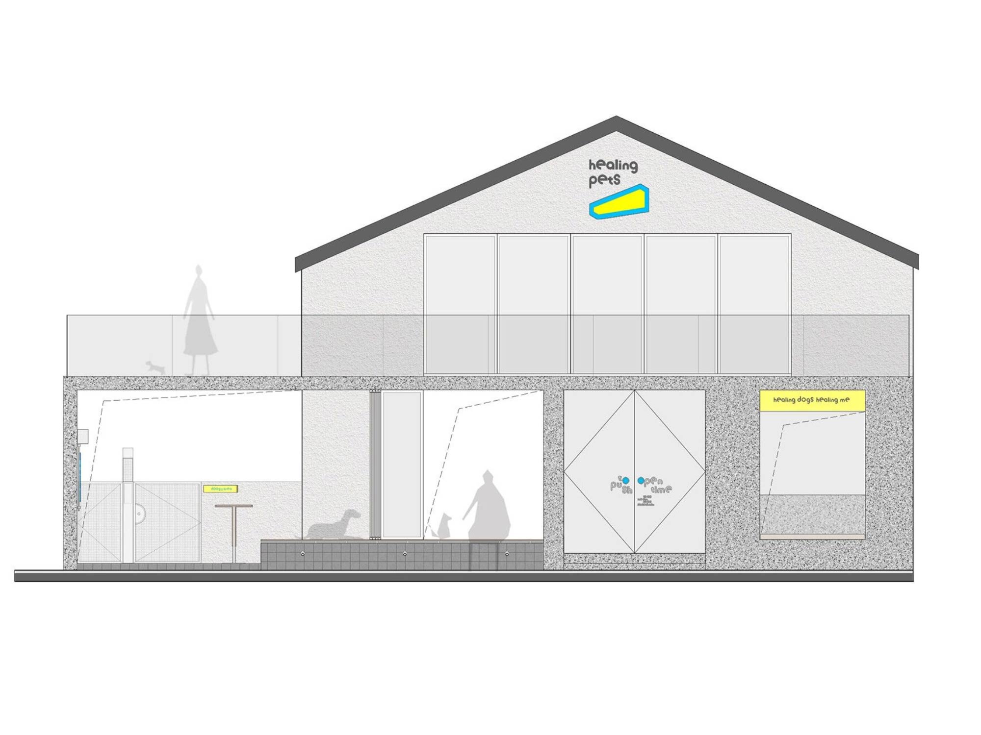 Healing Pets được tổ chức theo một cấu trúc không gian mở, với dòng di chuyển liên tục xuyên suốt từ khu vực đầu vào đến các khu chức năng phía sau. Không gian được chia thành ba lớp chính: khu đón tiếp kết hợp café, khu hoạt động trung tâm và khu chức năng chuyên sâu.
