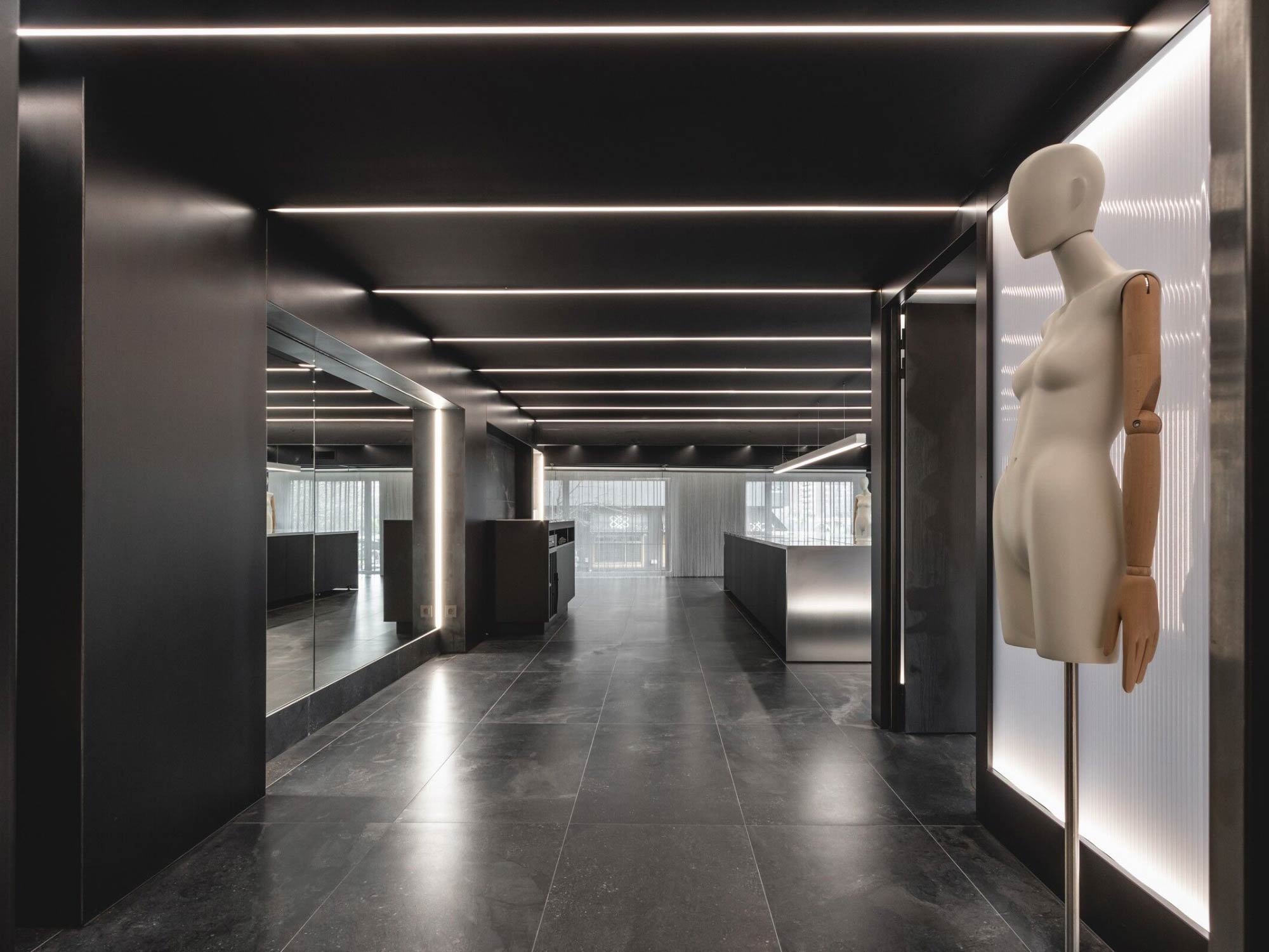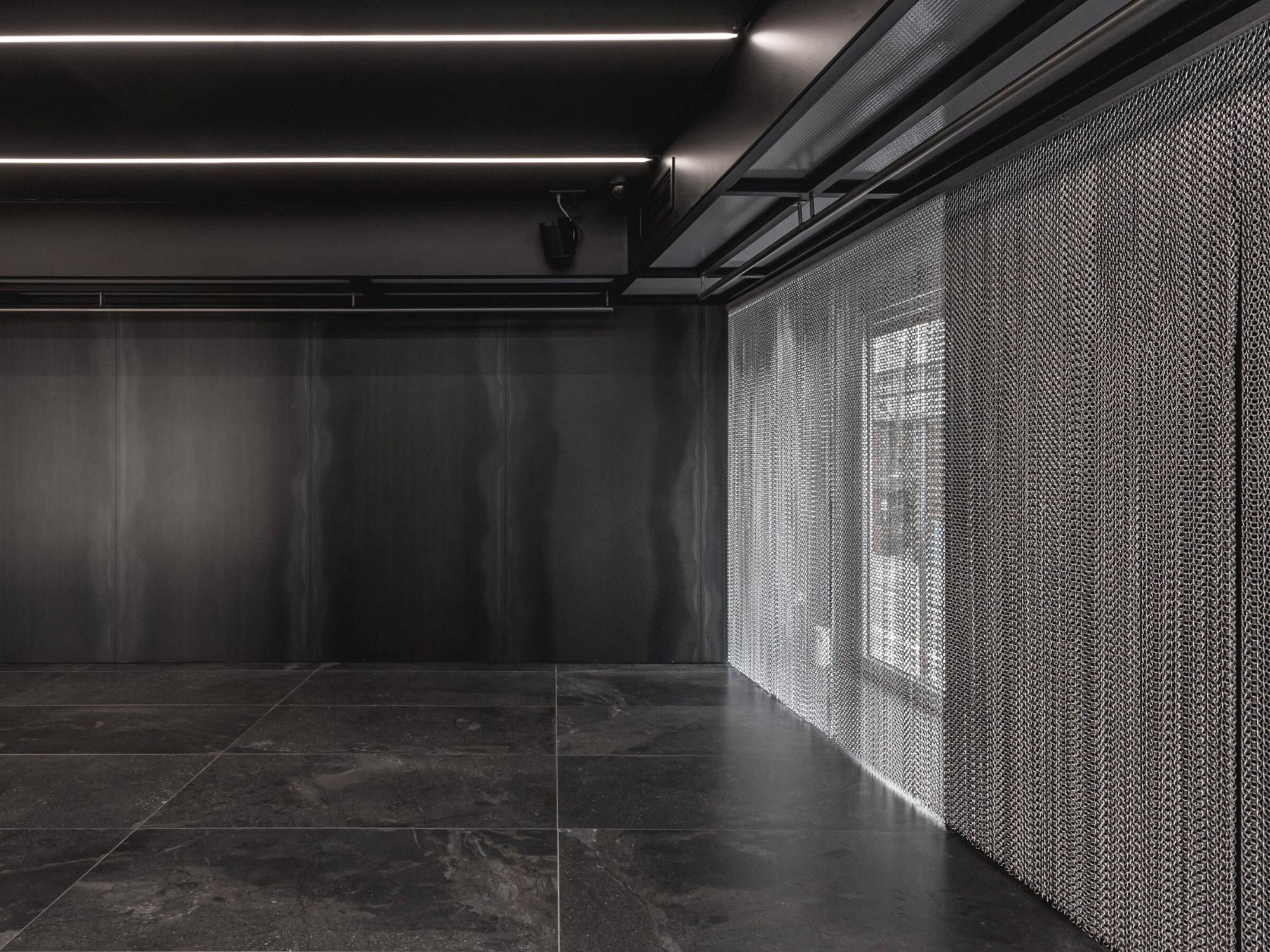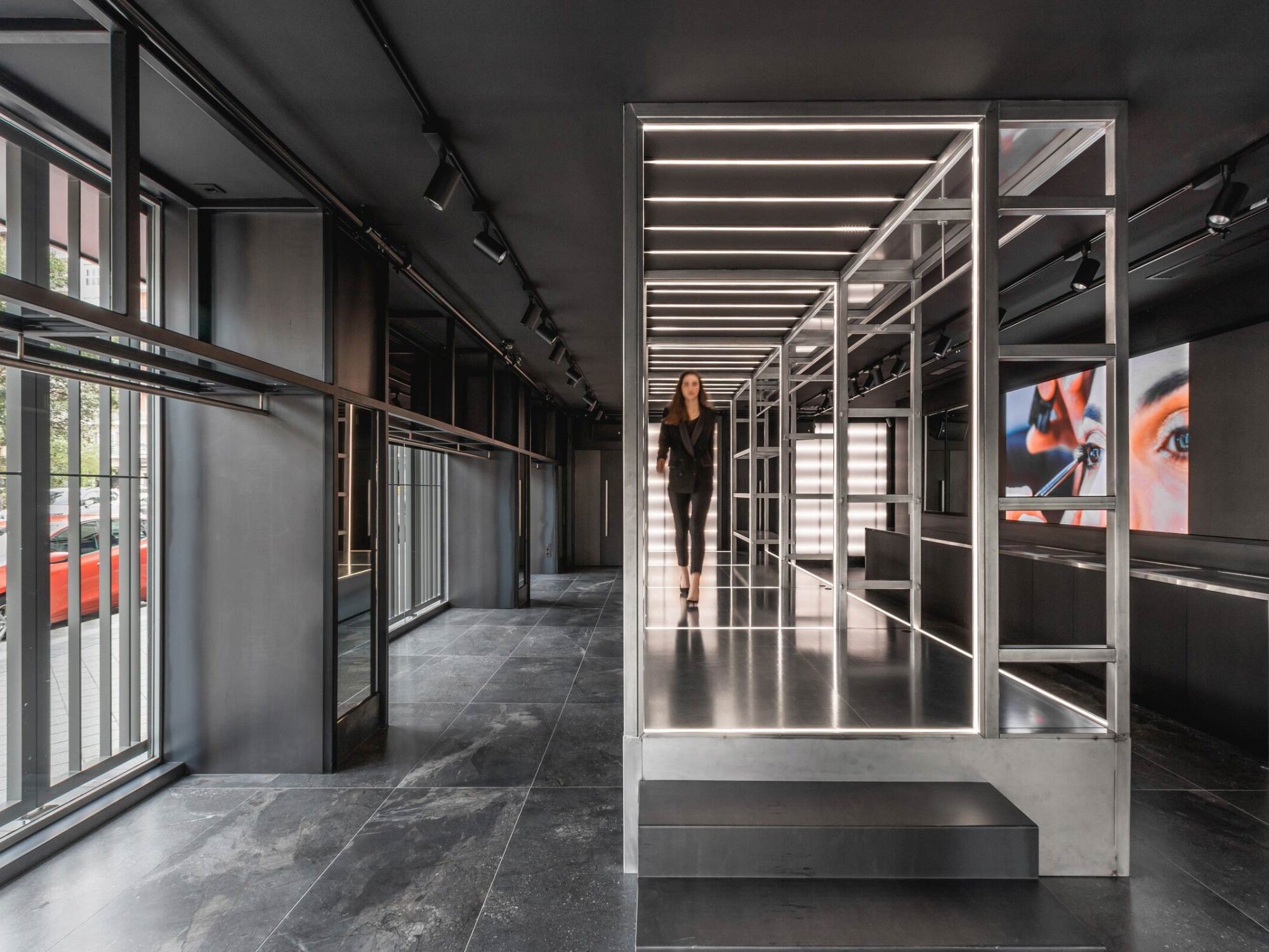 Thiết kế mặt tiền đóng vai trò như một lớp chuyển tiếp giữa không gian bên trong và môi trường bên ngoài. Hệ lam kim loại không chỉ tạo nên nhận diện kiến trúc đặc trưng mà còn giúp kiểm soát ánh sáng và tầm nhìn. Từ góc nhìn đô thị, cửa hàng hiện lên như một khối kiến trúc có chiều sâu, vừa thu hút vừa giữ được sự bí ẩn. Khi tiến gần, lớp vỏ này dần mở ra, cho phép người dùng khám phá không gian bên trong theo từng bước, tạo nên một trải nghiệm tiếp cận mang tính dẫn dắt.