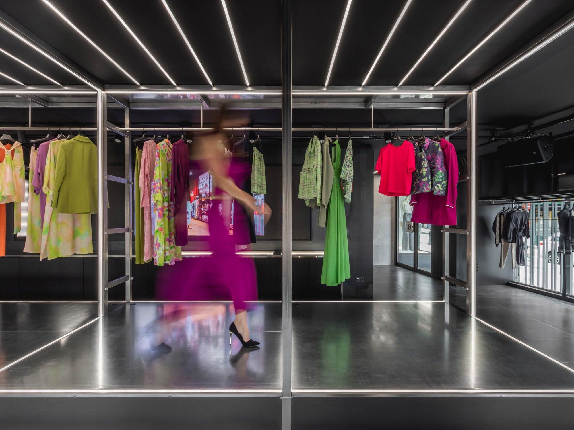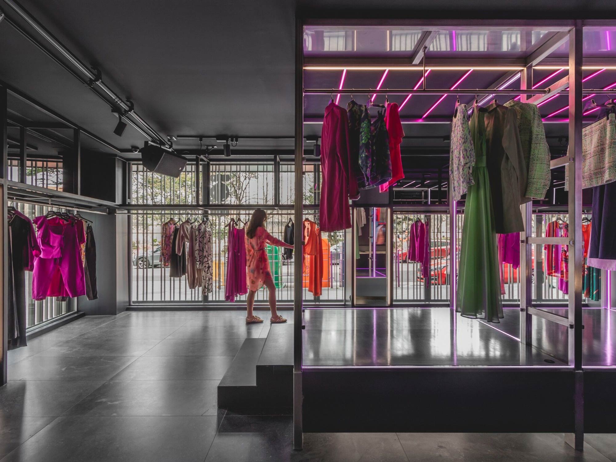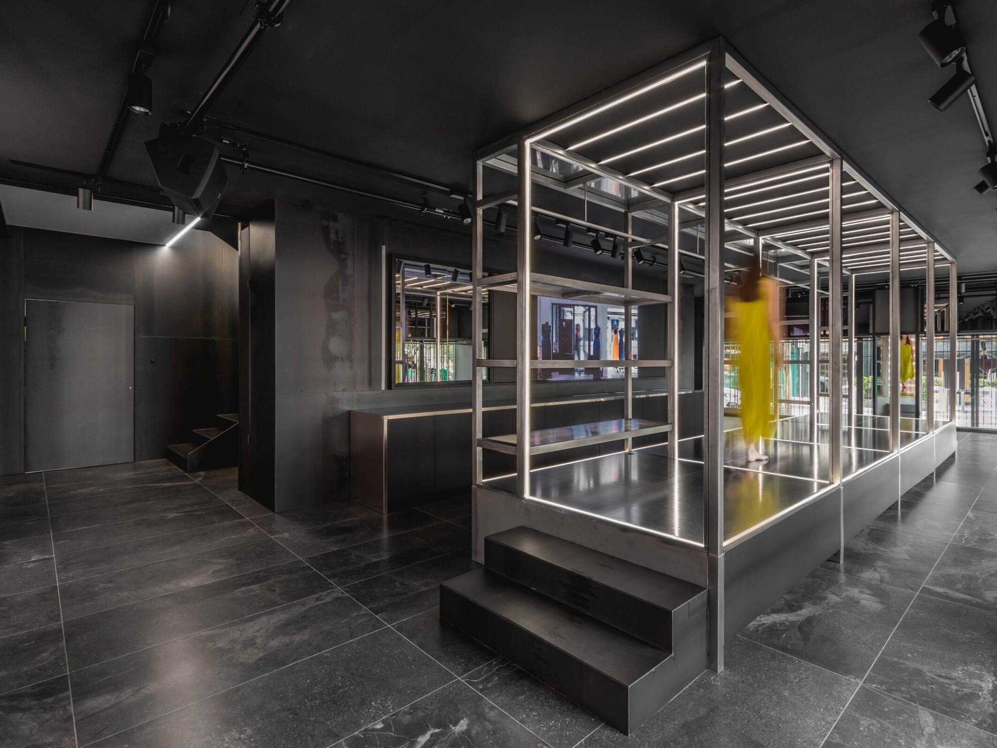 Thiết kế nội thất sử dụng hệ kết cấu kim loại và các bề mặt nâng – hạ như một công cụ tạo hình chủ đạo, mang lại cảm giác chuyển động cho không gian. Những bậc thang, sàn nâng và cấu trúc phân tầng không chỉ đóng vai trò trưng bày mà còn gợi liên tưởng đến một sân khấu thời trang thu nhỏ. Tại đây, khách hàng không chỉ là người quan sát mà trở thành một phần của không gian trình diễn, nơi việc lựa chọn và thử trang phục mang tính tương tác và trải nghiệm cao. Ngôn ngữ hình khối vì thế không chỉ mang tính thẩm mỹ mà còn định hình cách con người sử dụng không gian.
