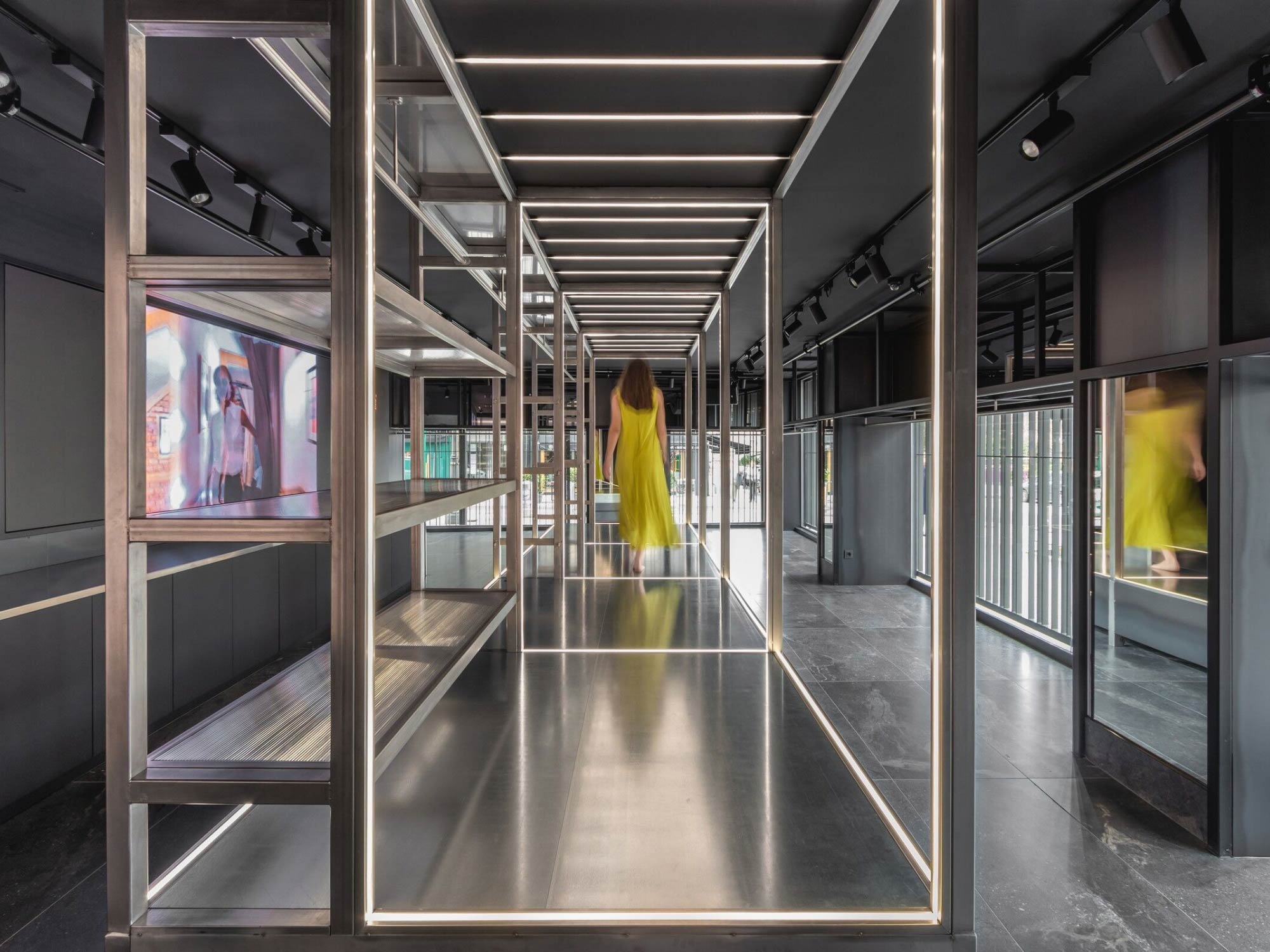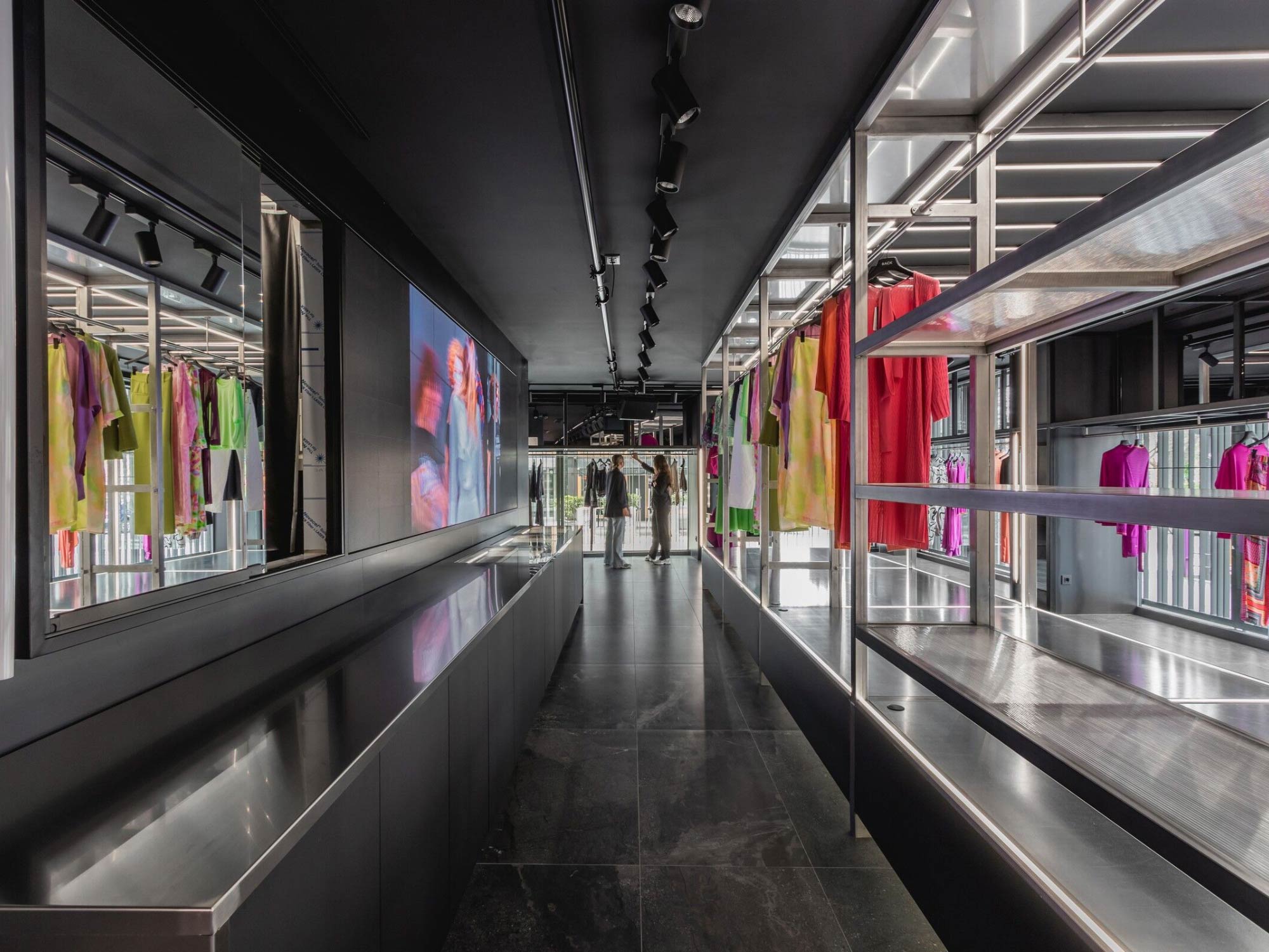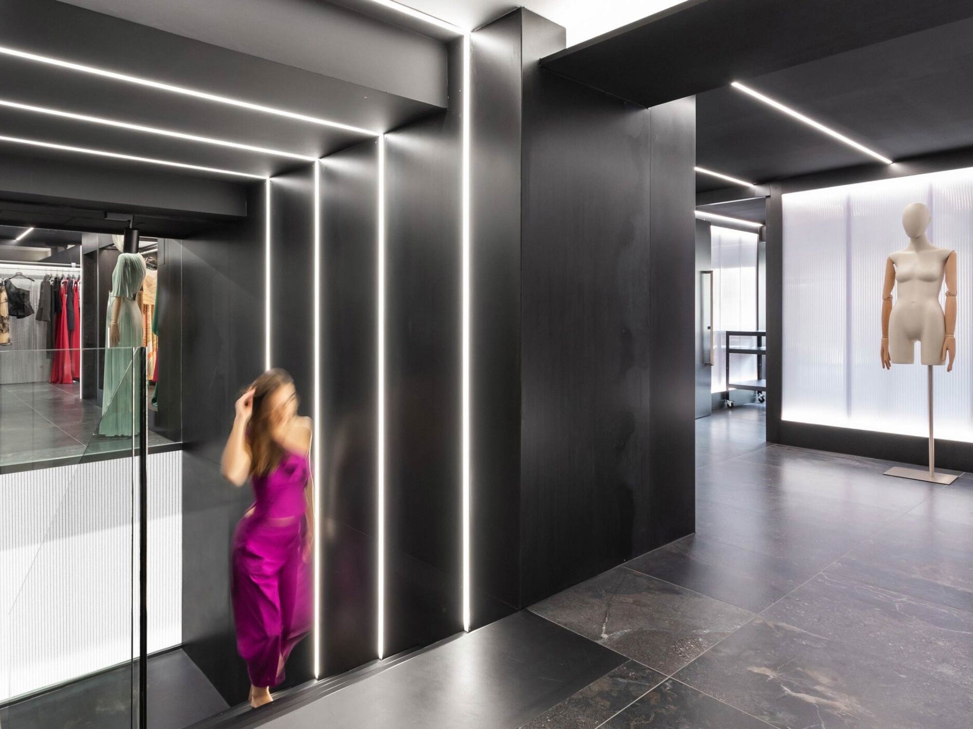 Thiết kế nội thất sử dụng hệ kết cấu kim loại và các bề mặt nâng – hạ như một công cụ tạo hình chủ đạo, mang lại cảm giác chuyển động cho không gian. Những bậc thang, sàn nâng và cấu trúc phân tầng không chỉ đóng vai trò trưng bày mà còn gợi liên tưởng đến một sân khấu thời trang thu nhỏ. Tại đây, khách hàng không chỉ là người quan sát mà trở thành một phần của không gian trình diễn, nơi việc lựa chọn và thử trang phục mang tính tương tác và trải nghiệm cao. Ngôn ngữ hình khối vì thế không chỉ mang tính thẩm mỹ mà còn định hình cách con người sử dụng không gian.