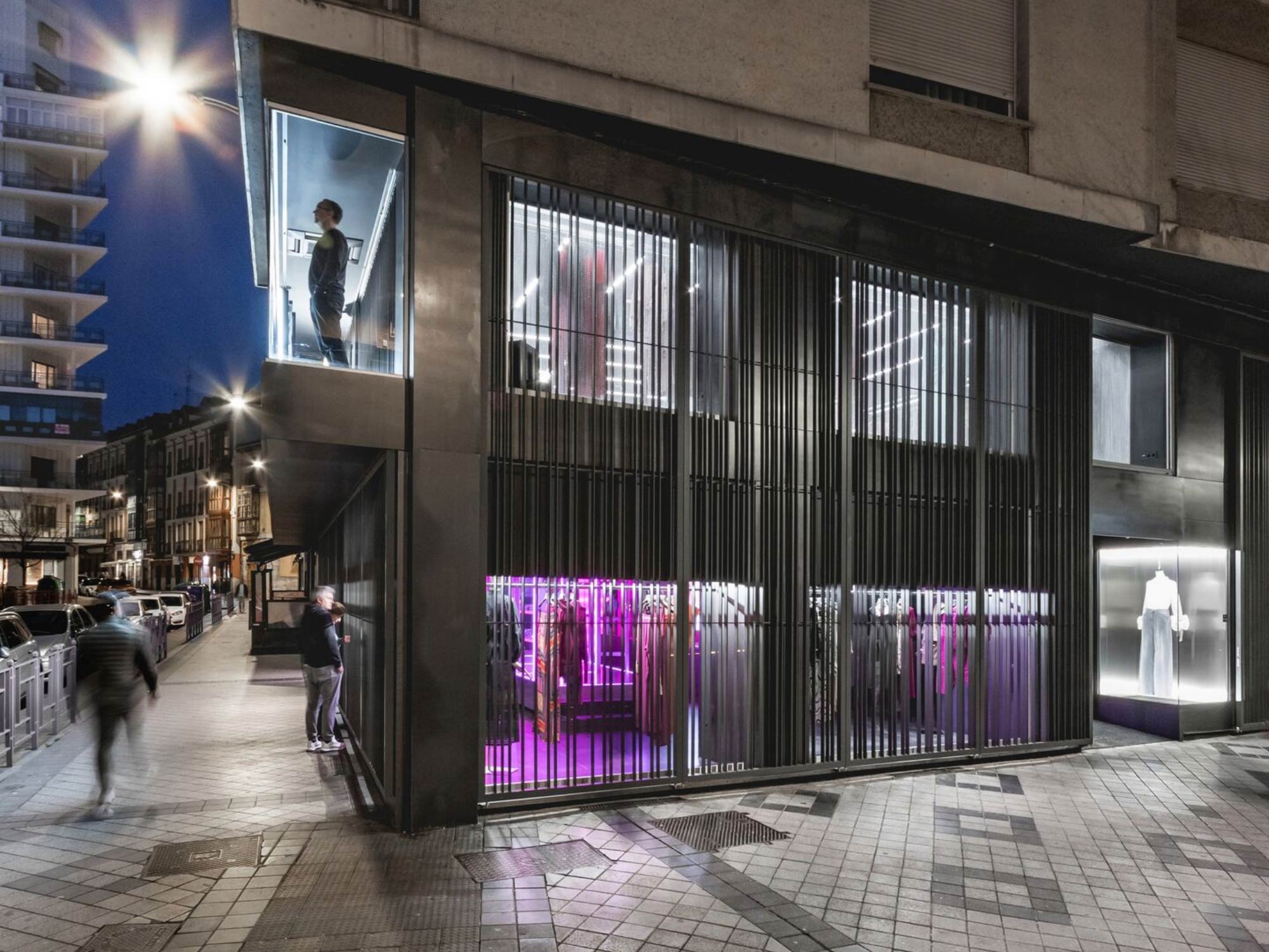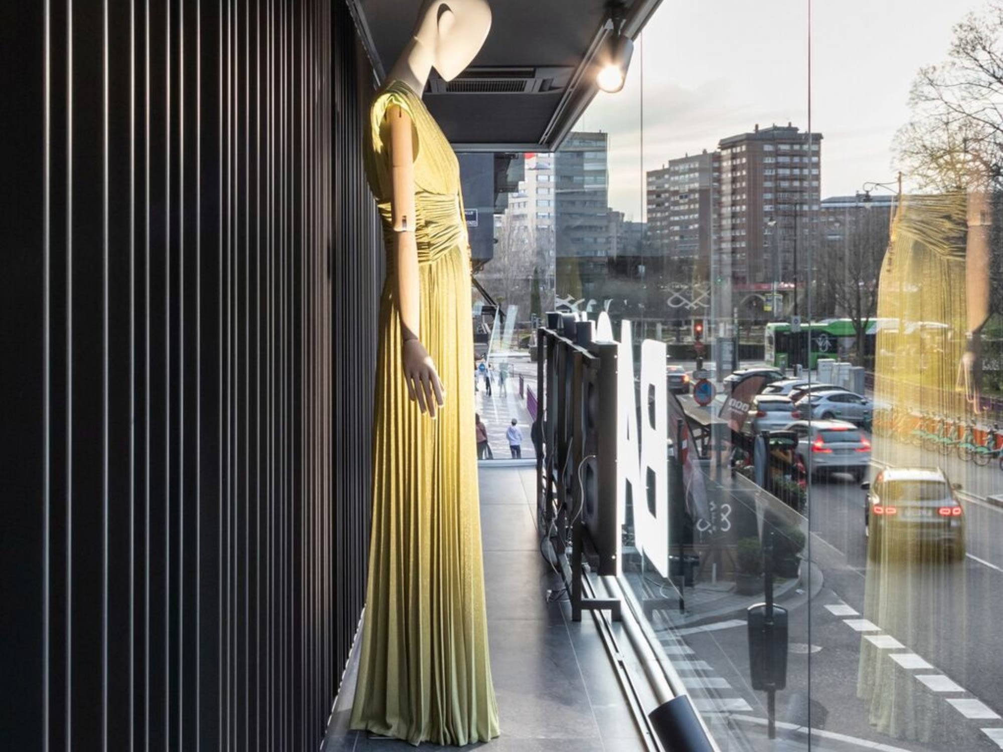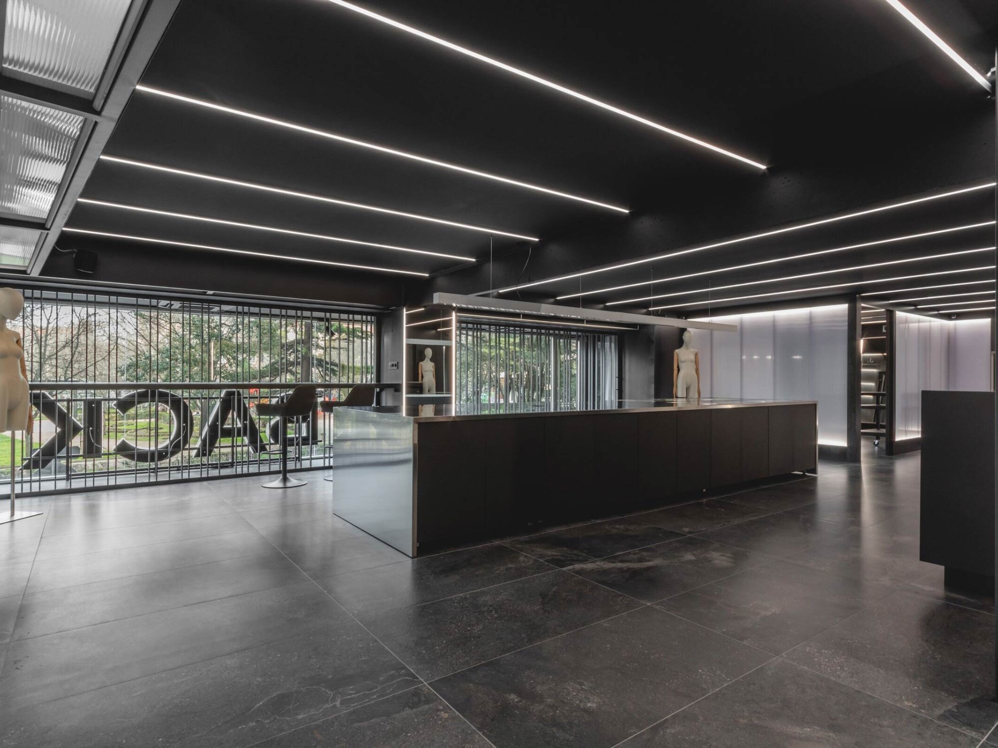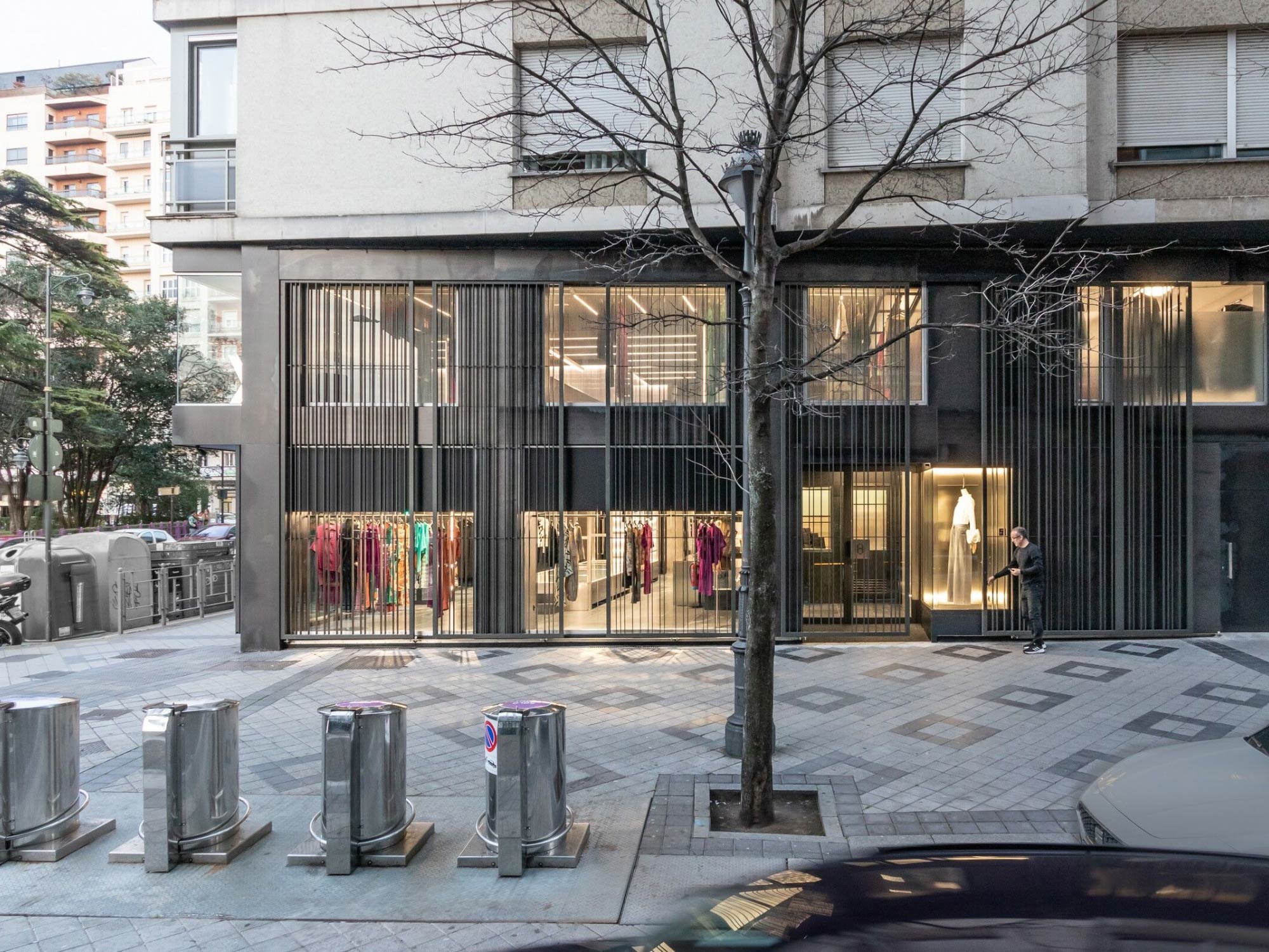 Shop thời trang Back Poniente được đặt trong một bối cảnh đô thị đặc biệt, nơi không gian thương mại tiếp giáp trực tiếp với quảng trường và công viên mở. Với hai mặt tiền kính lớn, công trình sở hữu điều kiện ánh sáng tự nhiên dồi dào và khả năng kết nối mạnh mẽ với môi trường xung quanh. Tuy nhiên, thay vì khai thác triệt để sự phô bày, BLUEWOOD lựa chọn một hướng tiếp cận có kiểm soát, nhằm điều tiết tầm nhìn và cảm xúc của người dùng. Thiết kế vì thế không đơn thuần là mở rộng không gian mà tập trung vào việc tạo ra các lớp trải nghiệm có chiều sâu, cân bằng giữa tính công cộng và sự riêng tư cần thiết trong môi trường bán lẻ thời trang.