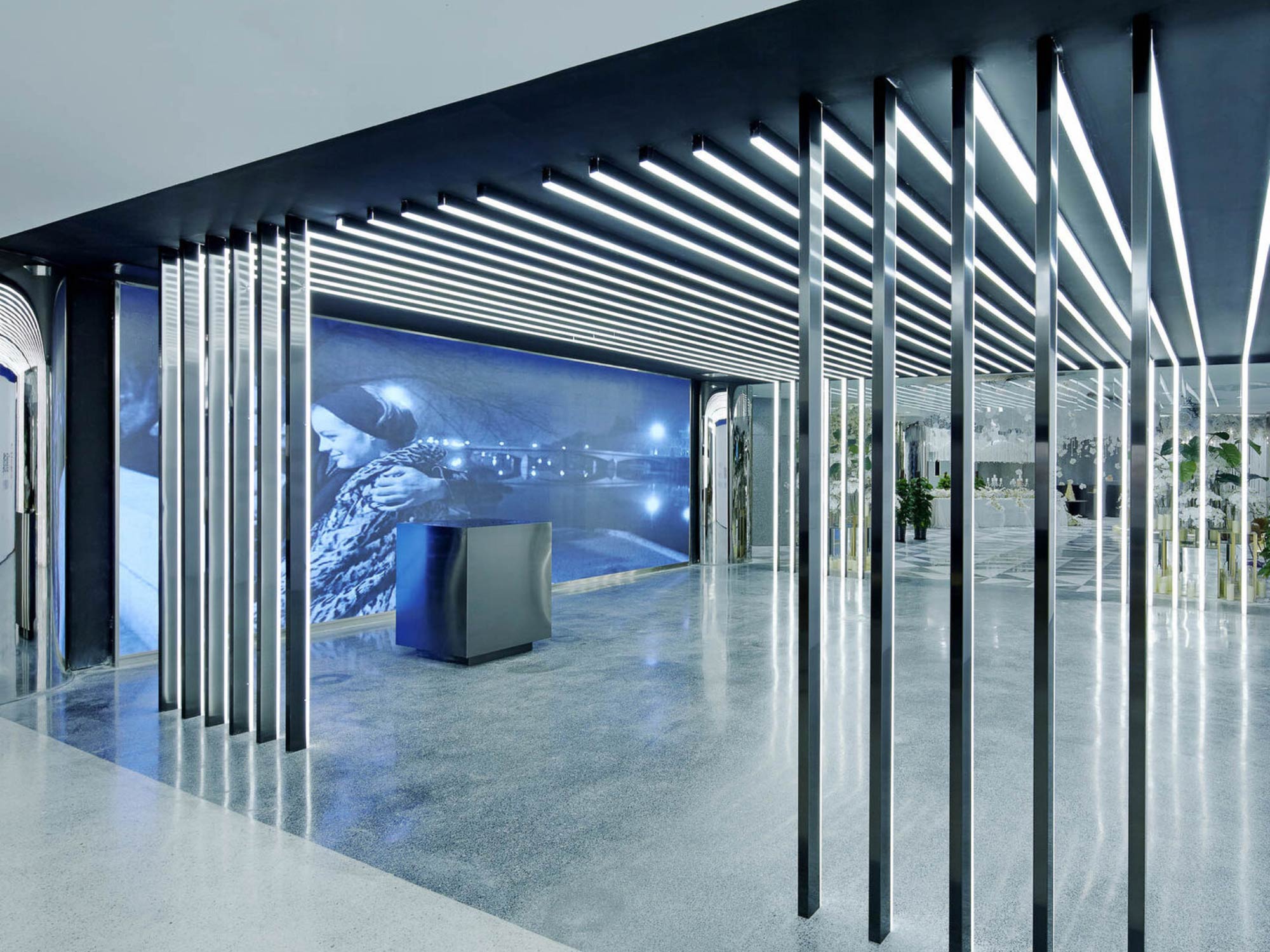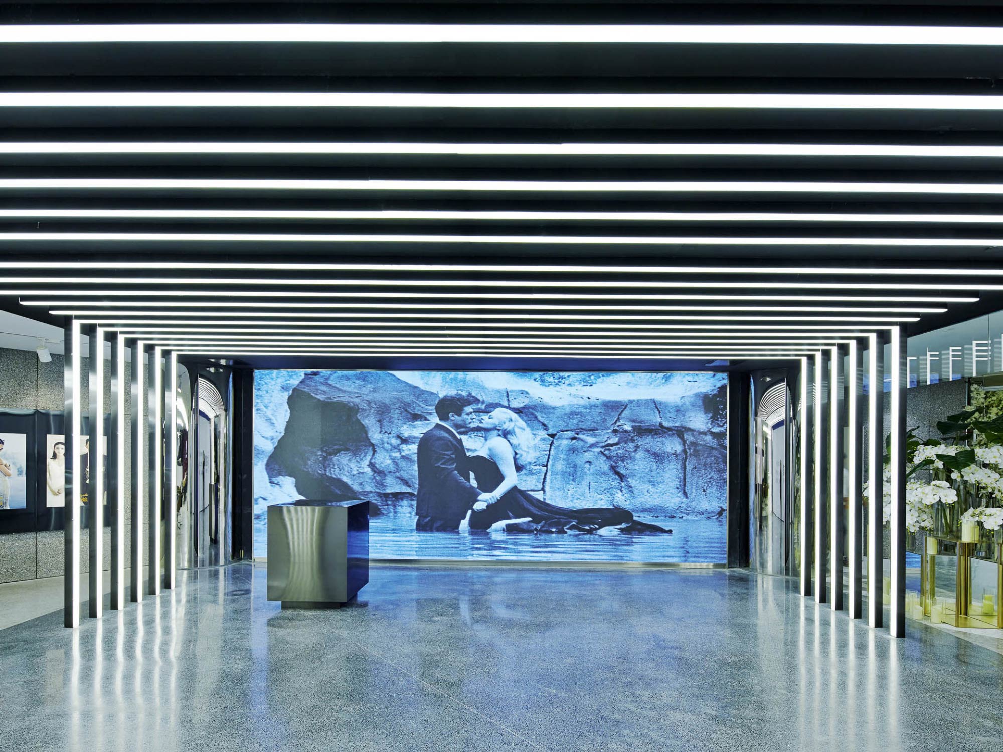 Các khu vực trưng bày sử dụng ánh sáng có kiểm soát để làm nổi bật chi tiết sản phẩm, trong khi khu vực trung tâm sử dụng ánh sáng động từ màn hình LED để tạo hiệu ứng thị giác mạnh mẽ.