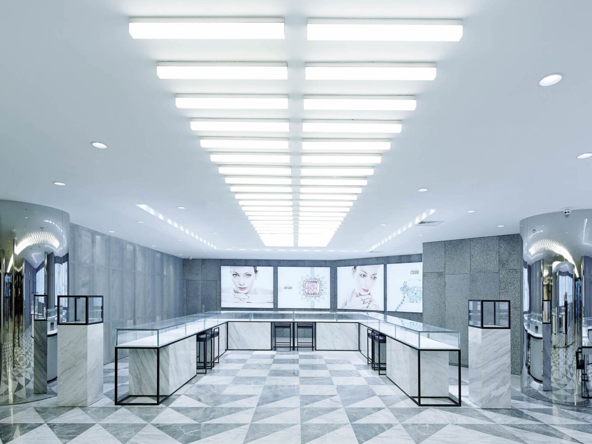 Bề mặt terrazzo với các biến thể màu sắc được sử dụng để tạo nhịp điệu thị giác, trong khi kim loại và kính giúp tăng cường hiệu ứng phản chiếu, làm nổi bật sản phẩm trưng bày.