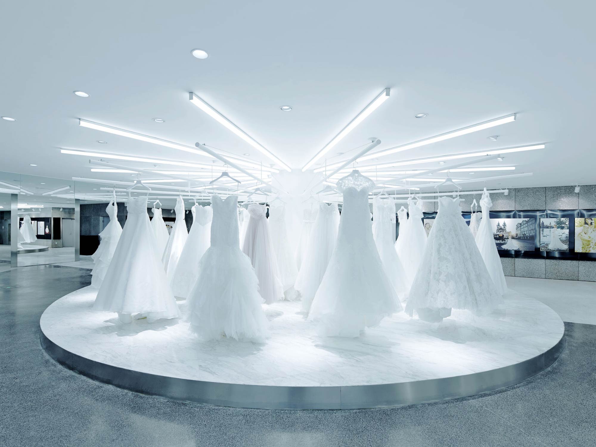 Sự tương phản giữa vật liệu cứng và các yếu tố mềm mại của váy cưới tạo nên một đối thoại thú vị, giúp sản phẩm trở nên nổi bật hơn trong không gian.