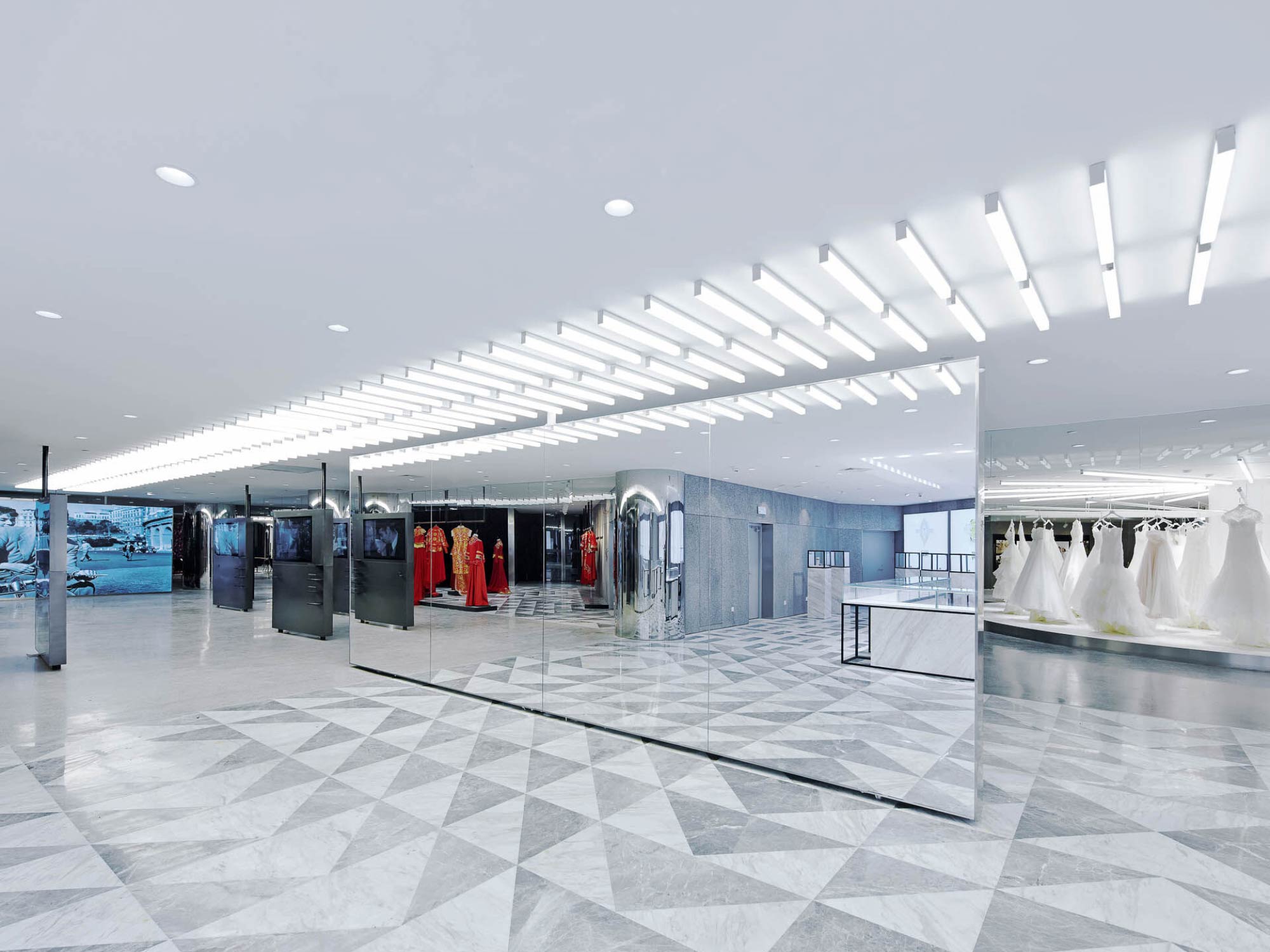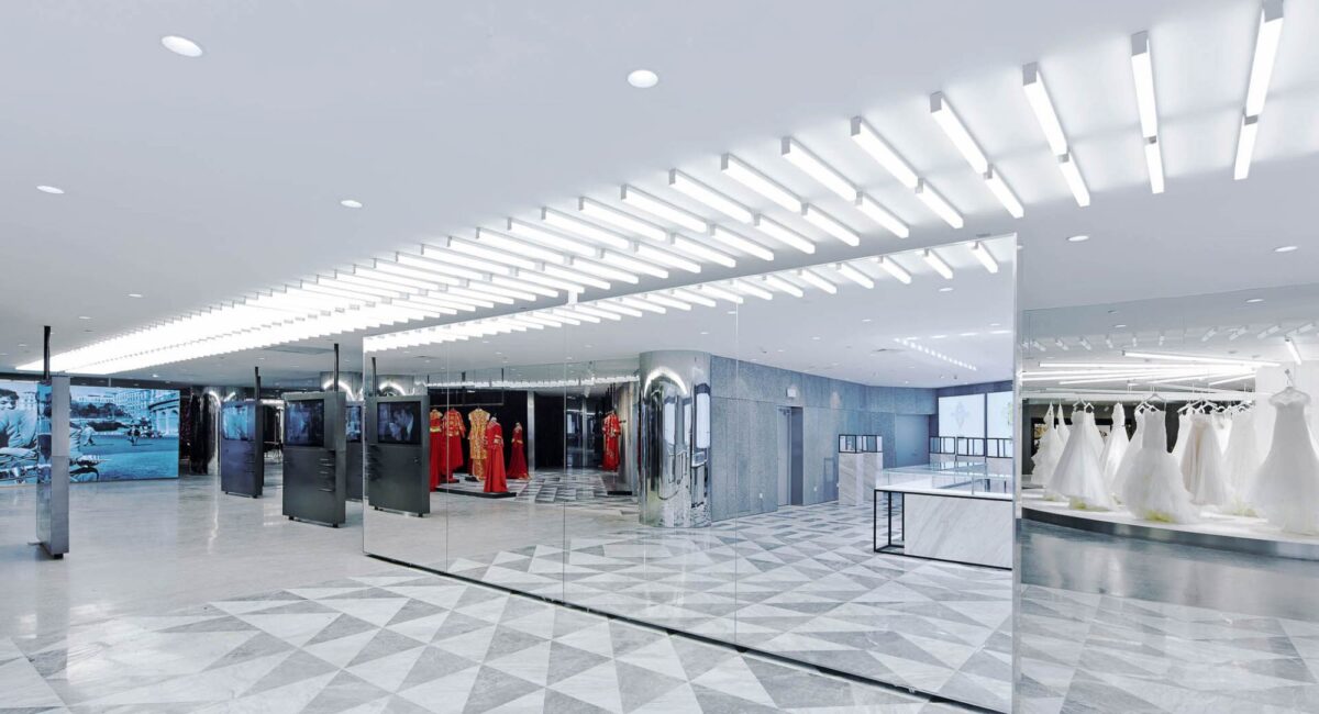 Không gian dự án Jiuxi được tổ chức theo một cấu trúc rõ ràng nhưng không cứng nhắc, trong đó các khu vực chức năng được liên kết thông qua một hệ thống di chuyển mạch lạc. Các khu trưng bày váy cưới, trang sức và khu trang điểm được bố trí như những “module” độc lập nhưng vẫn nằm trong một tổng thể thống nhất.