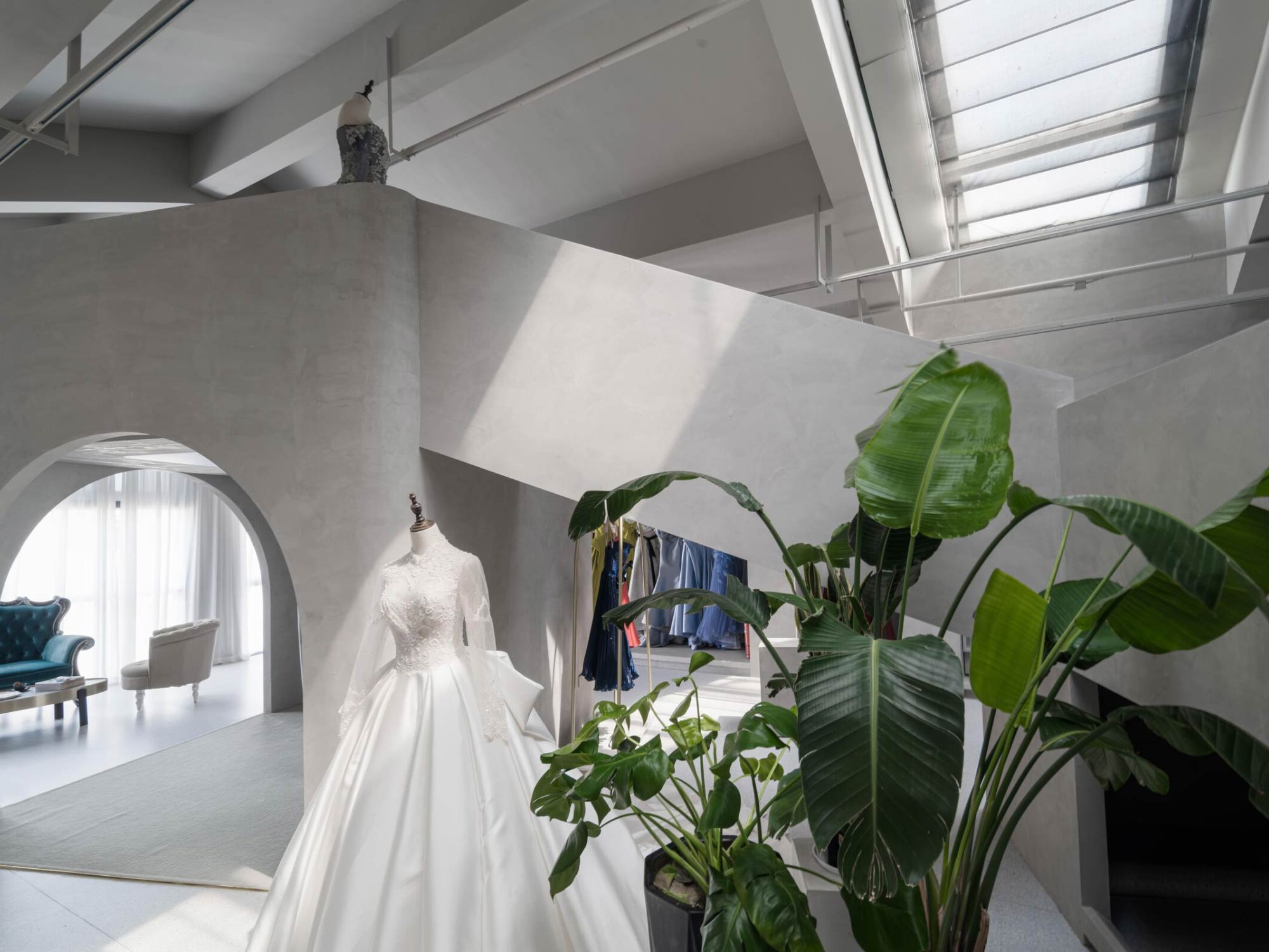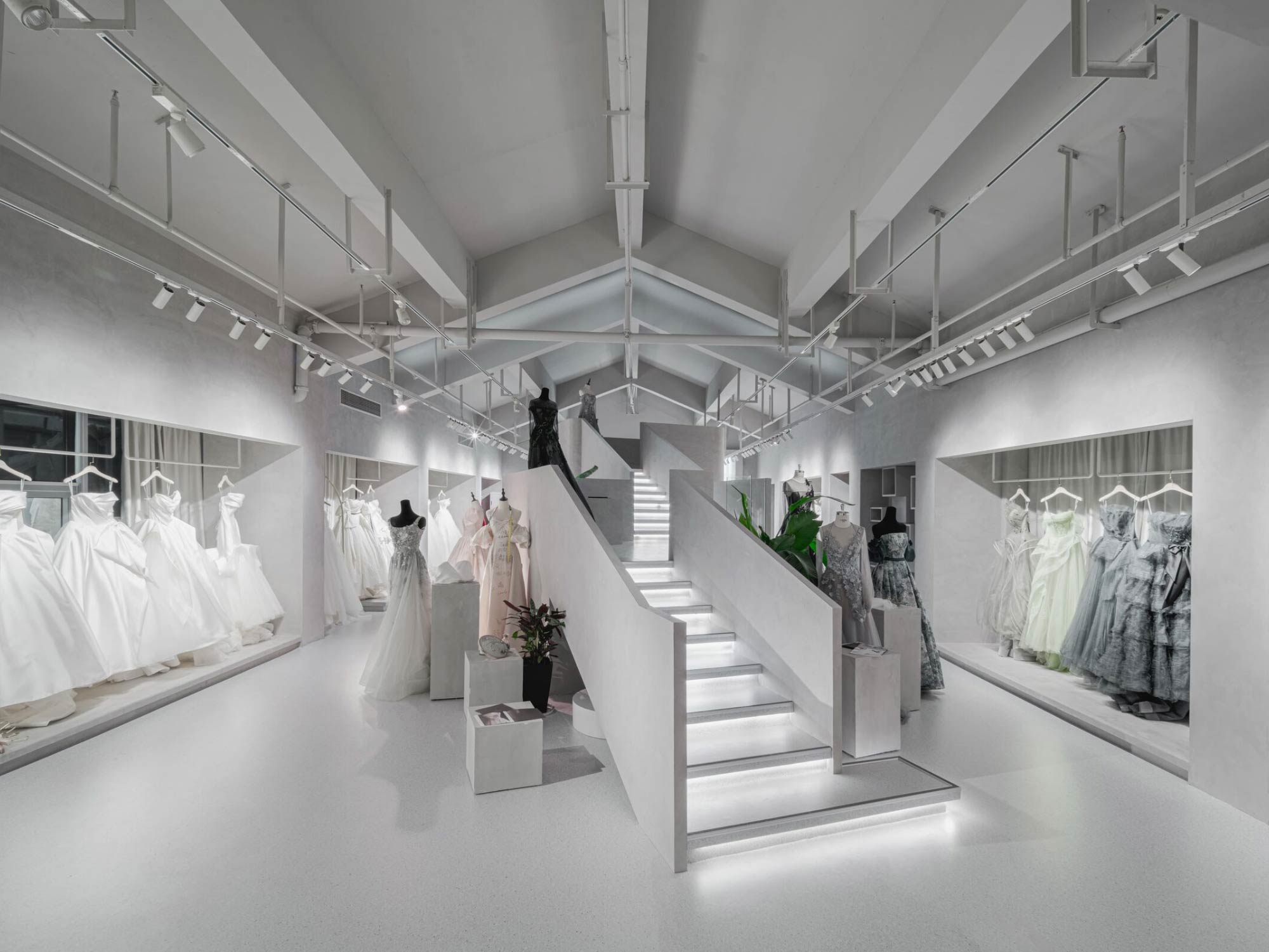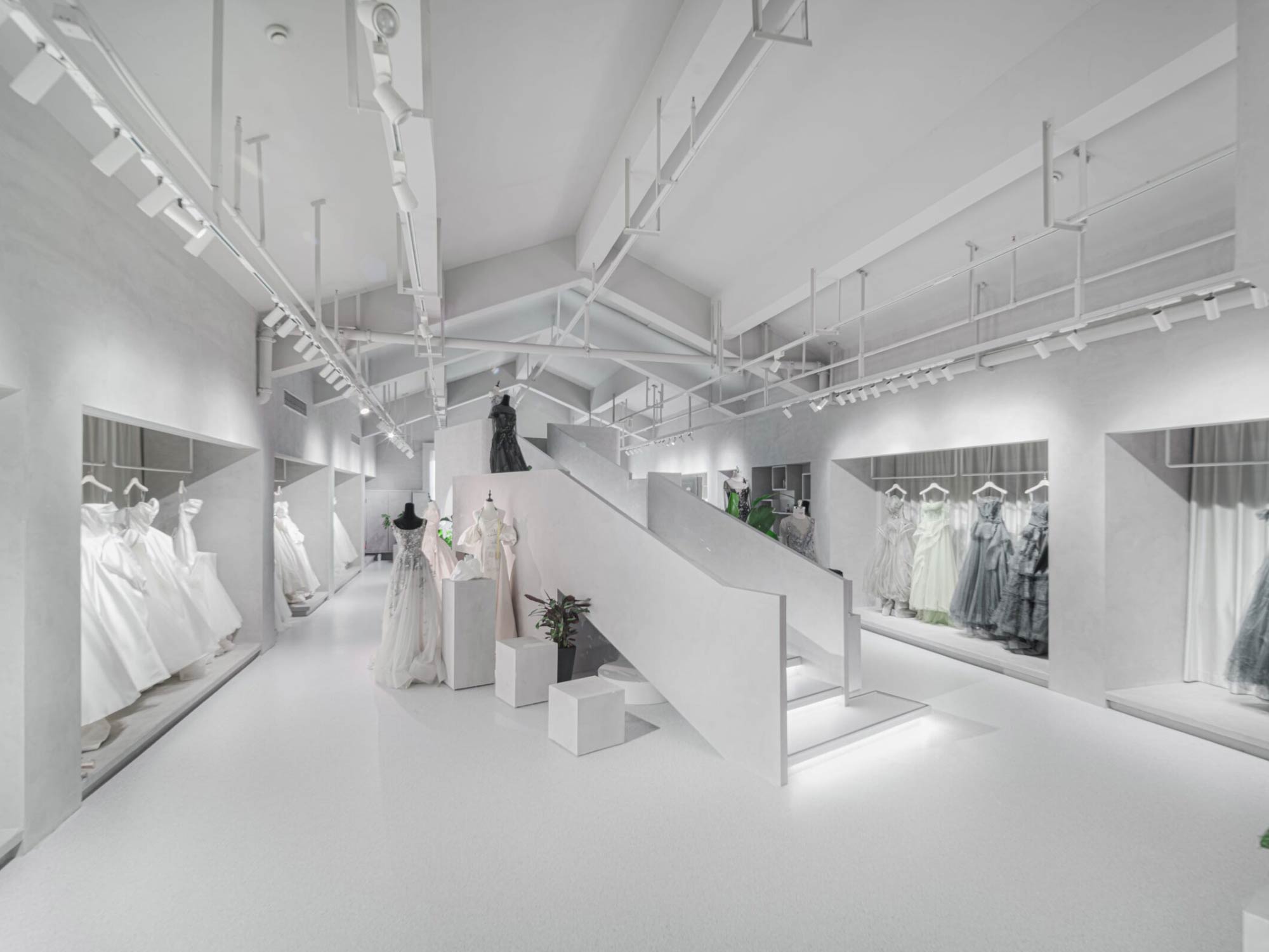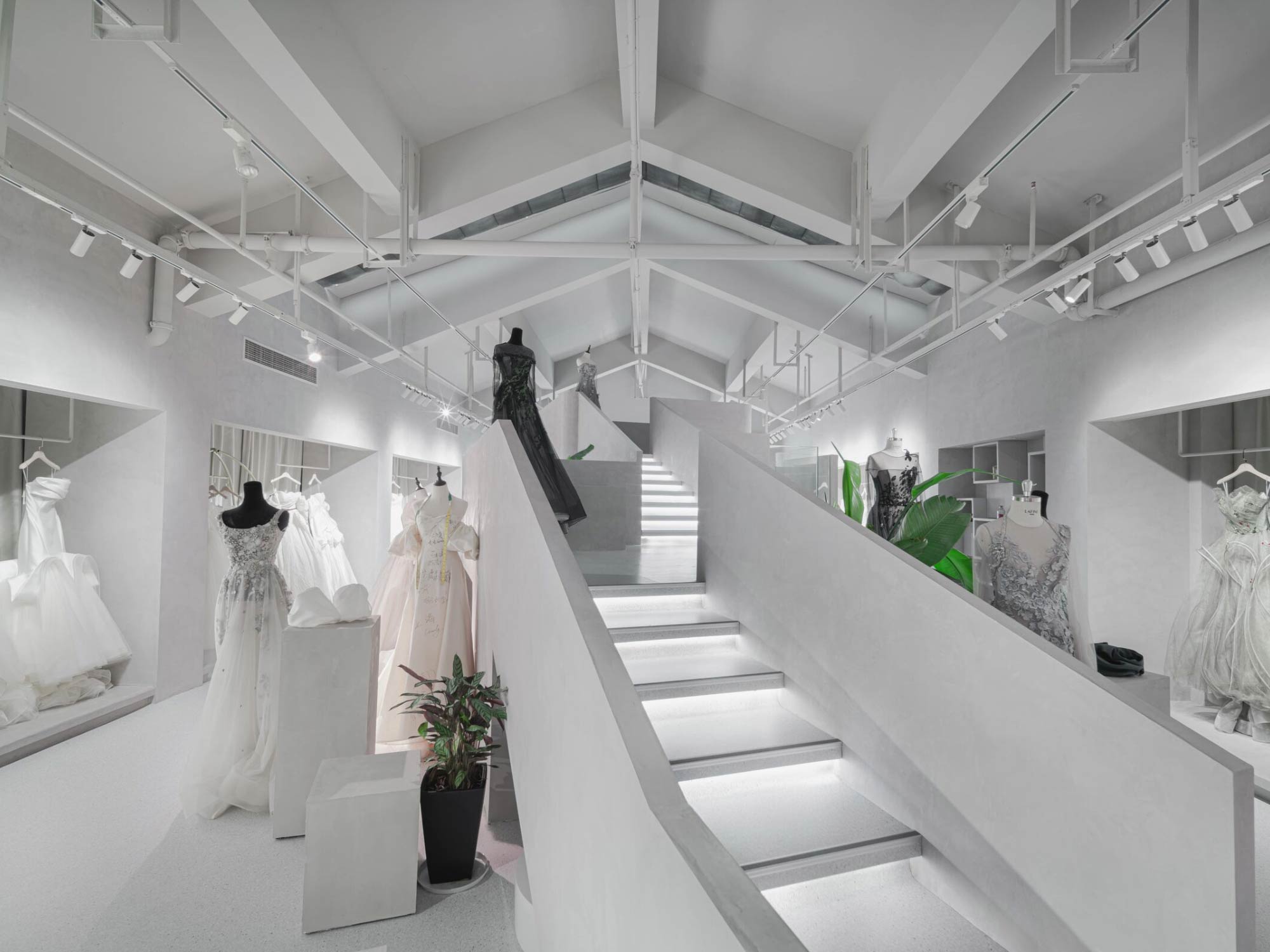 Hệ mái dốc giúp tạo ra các lớp không gian chồng lên nhau, trong khi chiều cao lớn cho phép phát triển các điểm nhìn đa tầng. Điều này đặc biệt hiệu quả trong việc trưng bày váy cưới – một loại sản phẩm cần không gian thoáng và chiều cao để thể hiện hết vẻ đẹp.