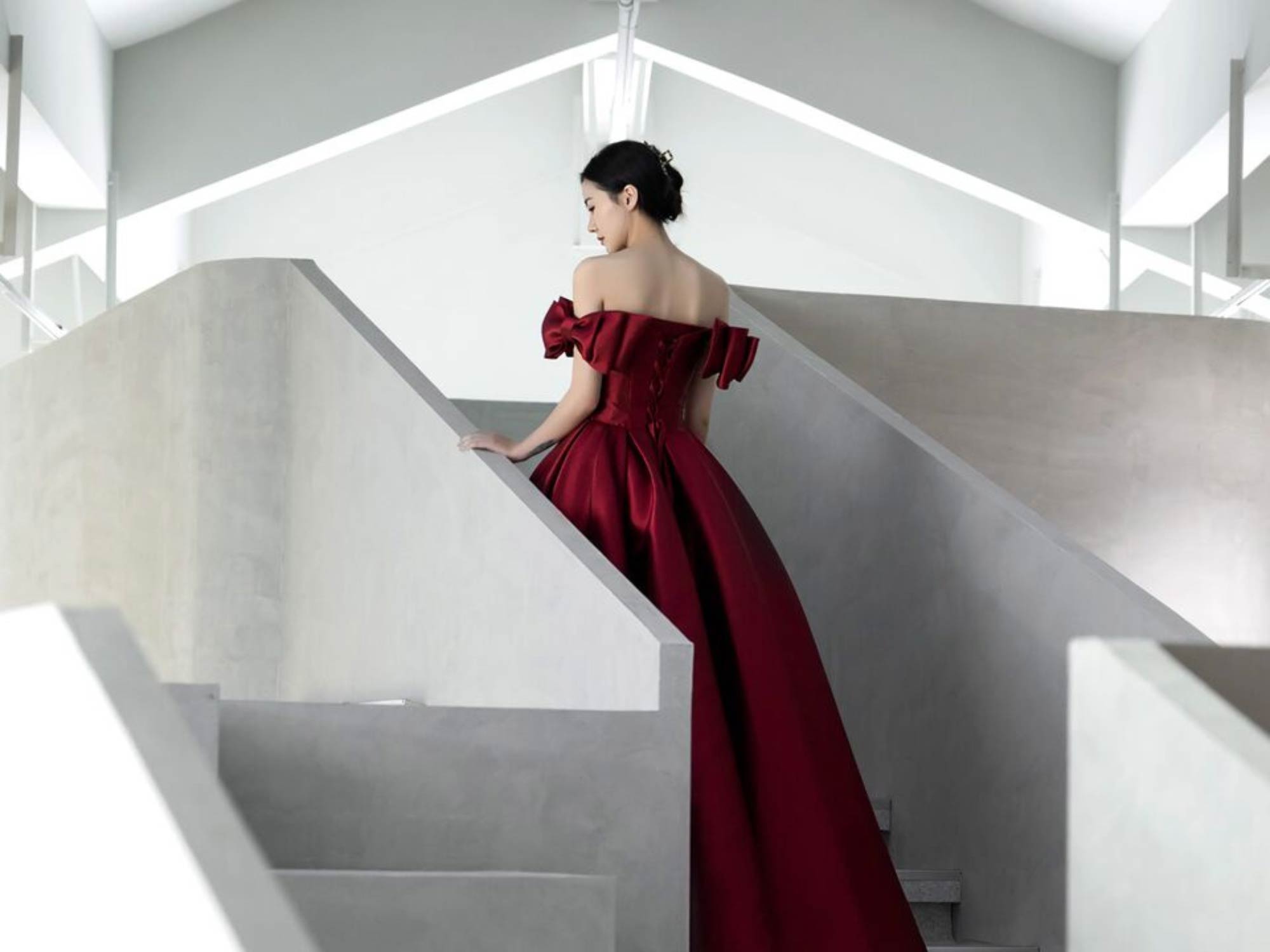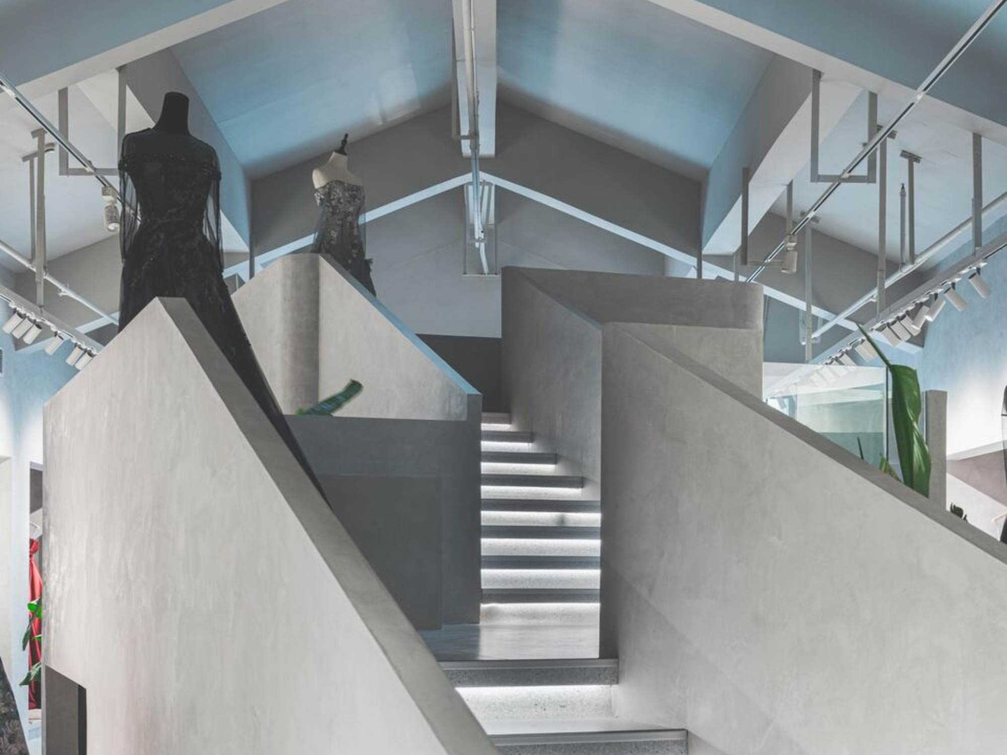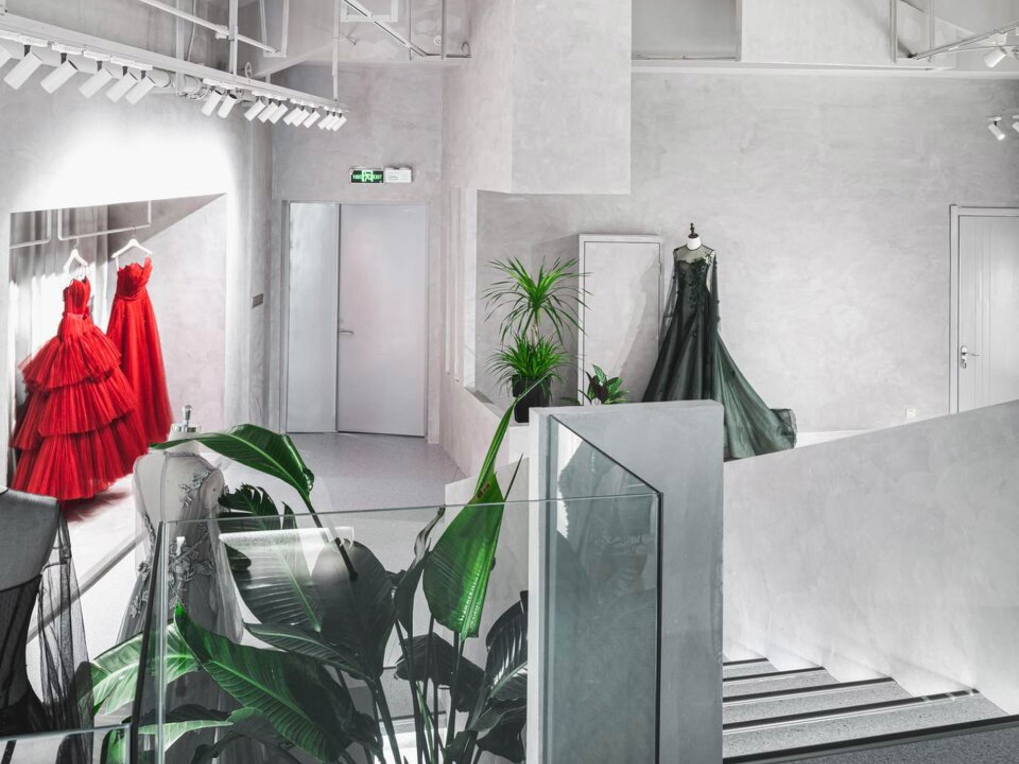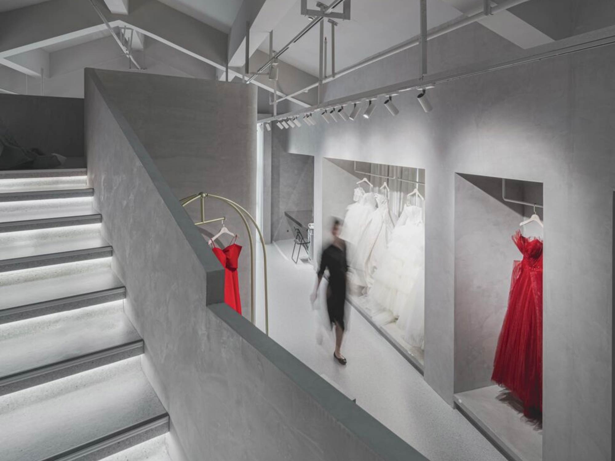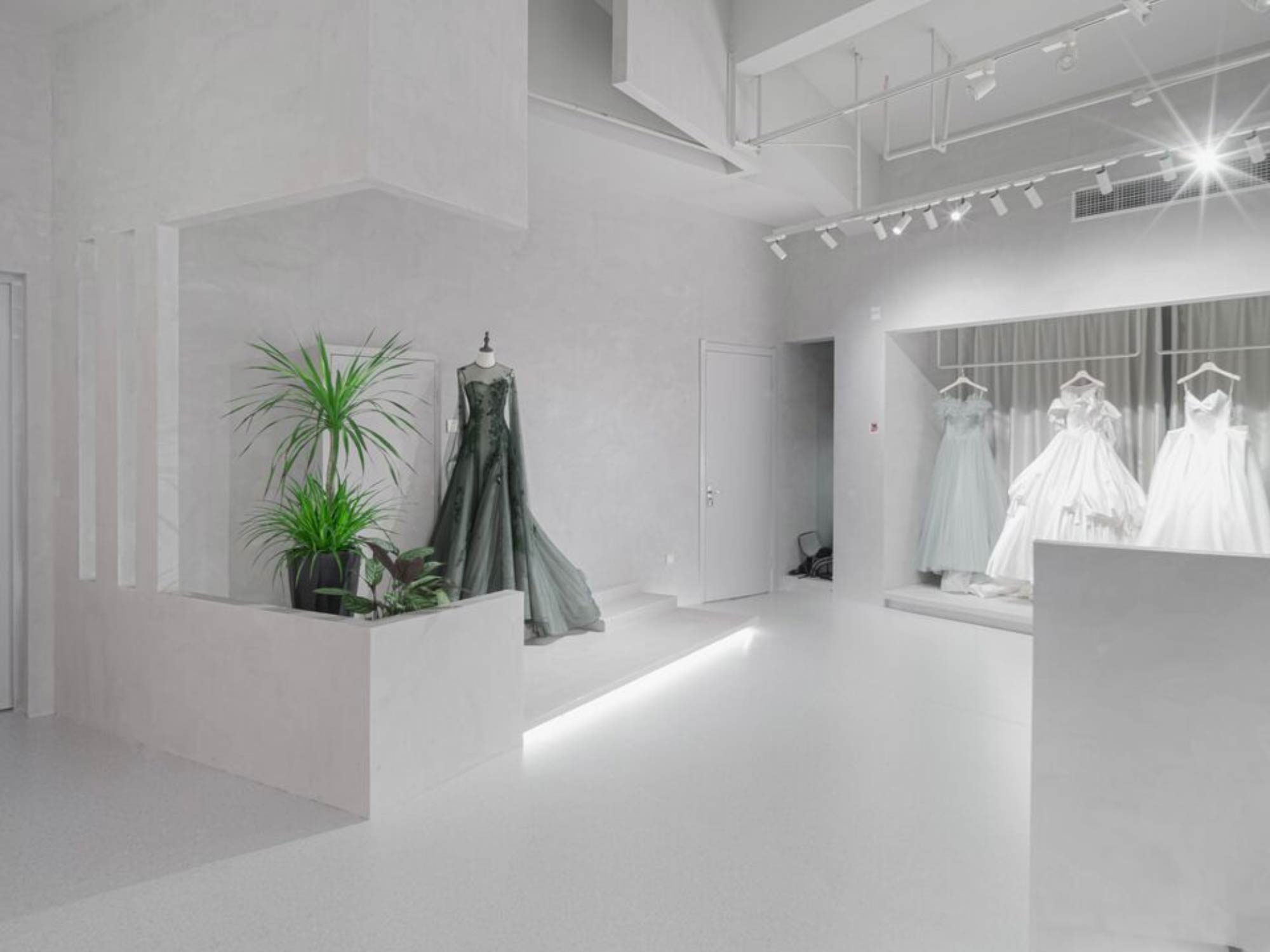 Hệ mái dốc giúp tạo ra các lớp không gian chồng lên nhau, trong khi chiều cao lớn cho phép phát triển các điểm nhìn đa tầng. Điều này đặc biệt hiệu quả trong việc trưng bày váy cưới – một loại sản phẩm cần không gian thoáng và chiều cao để thể hiện hết vẻ đẹp.