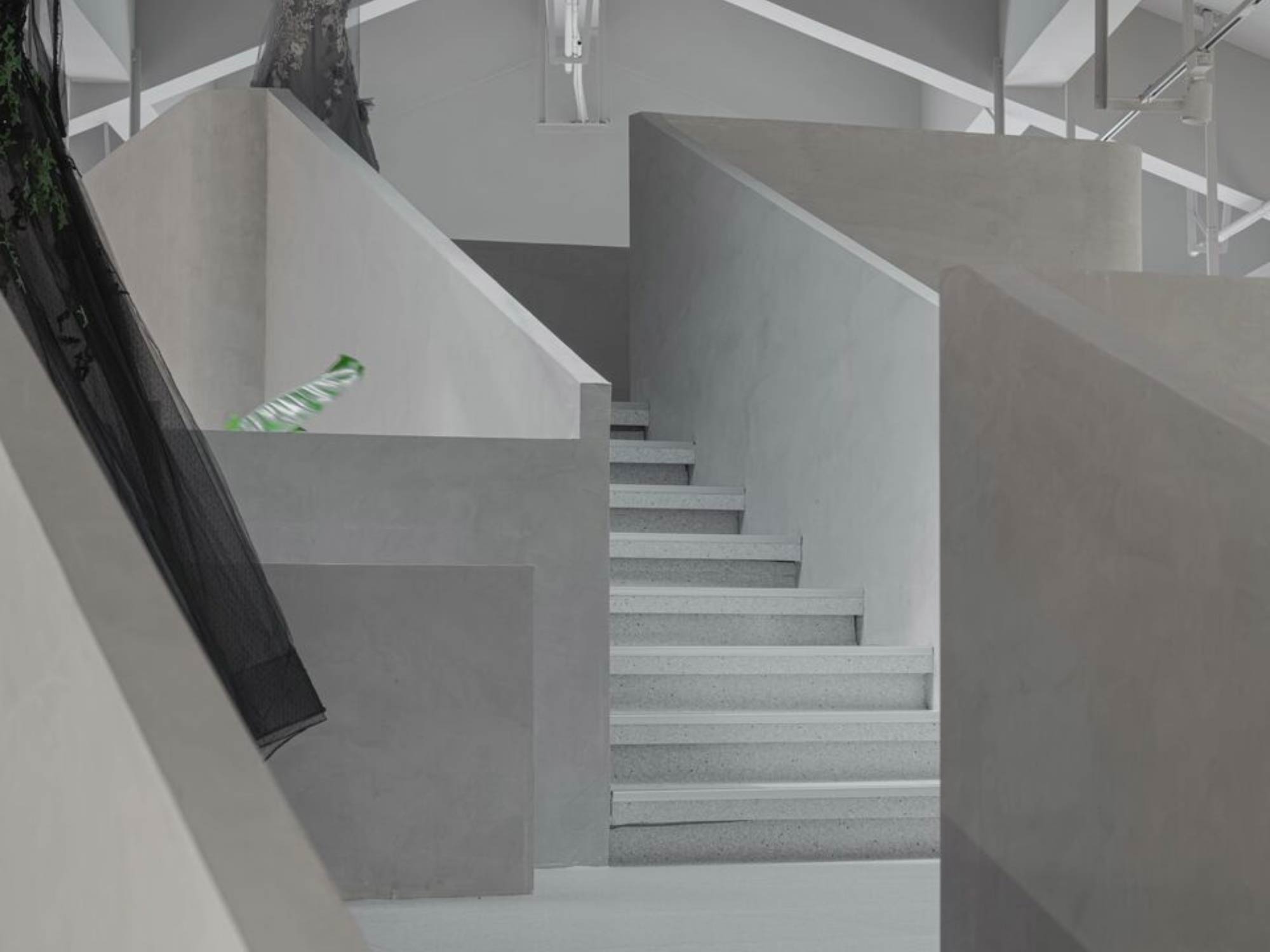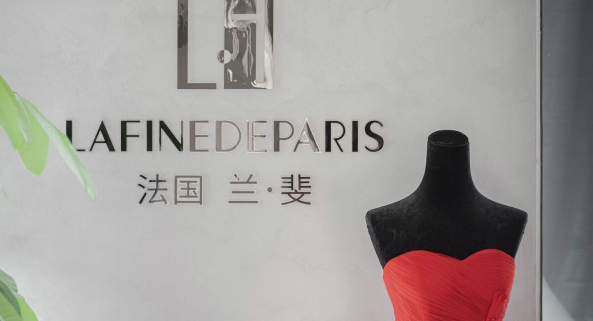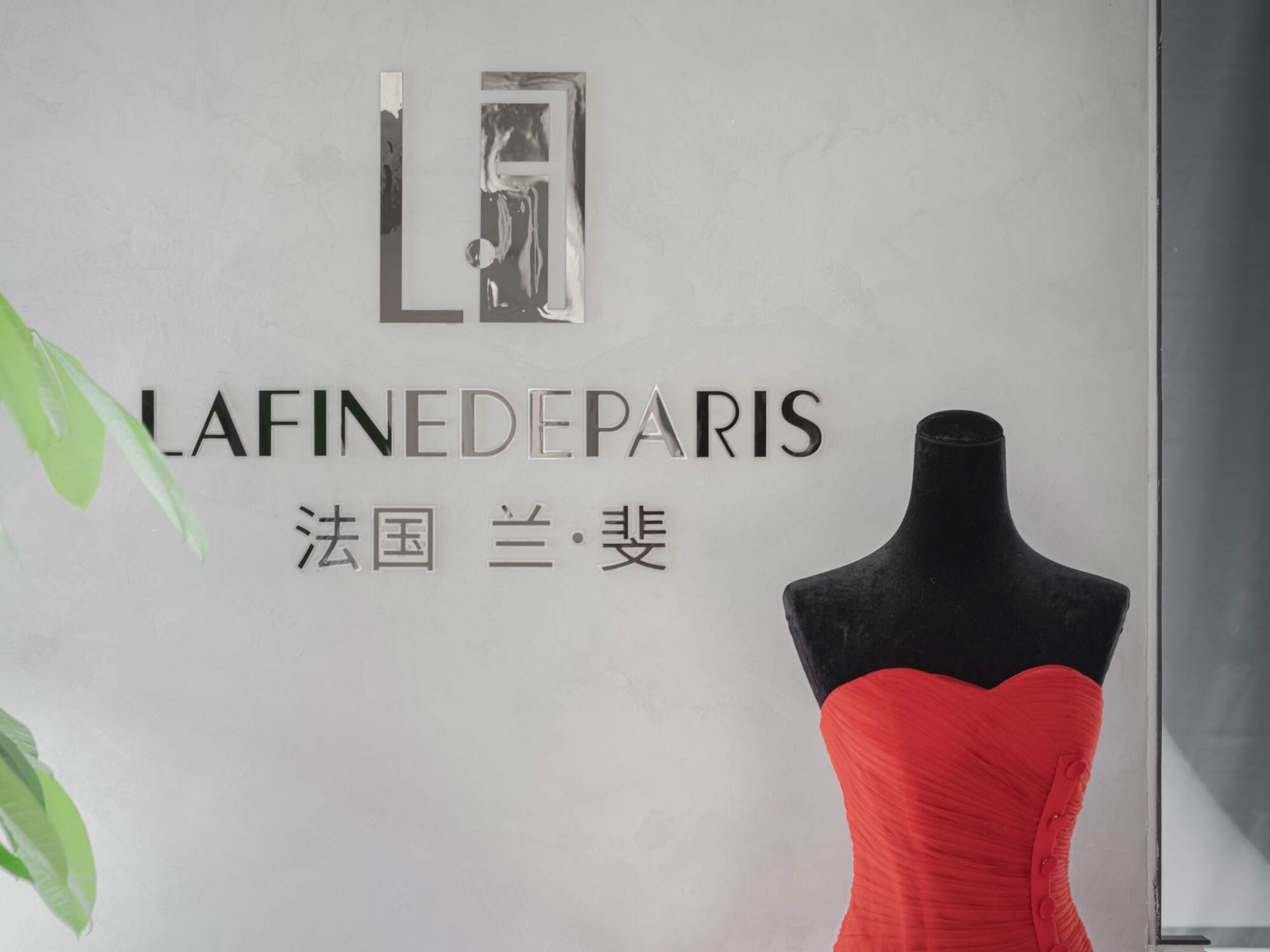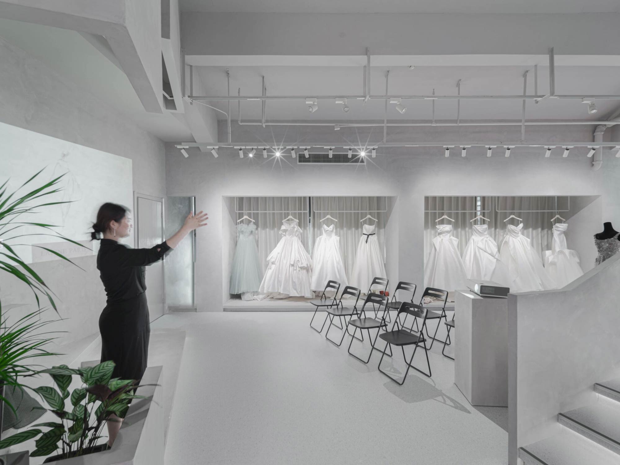 Khác với nhiều showroom thời trang sử dụng vật liệu cầu kỳ, dự án studio áo cưới Lafine de Paris lựa chọn một bảng vật liệu tiết chế nhằm làm nền cho sản phẩm. Các bề mặt tường, sàn và trần được xử lý đơn giản, với màu sắc trung tính, giúp váy cưới – với chất liệu và chi tiết phức tạp – trở thành trung tâm của sự chú ý.