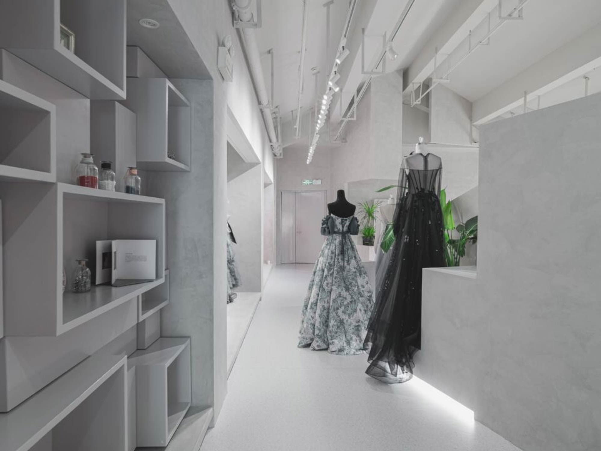Các khu vực trưng bày được bố trí dọc theo hệ cột và tường bao, tạo thành các “khung cảnh” riêng biệt cho từng mẫu váy. Điều này giúp mỗi sản phẩm được tôn vinh như một tác phẩm độc lập, đồng thời đảm bảo tổng thể không gian vẫn giữ được sự liên kết.