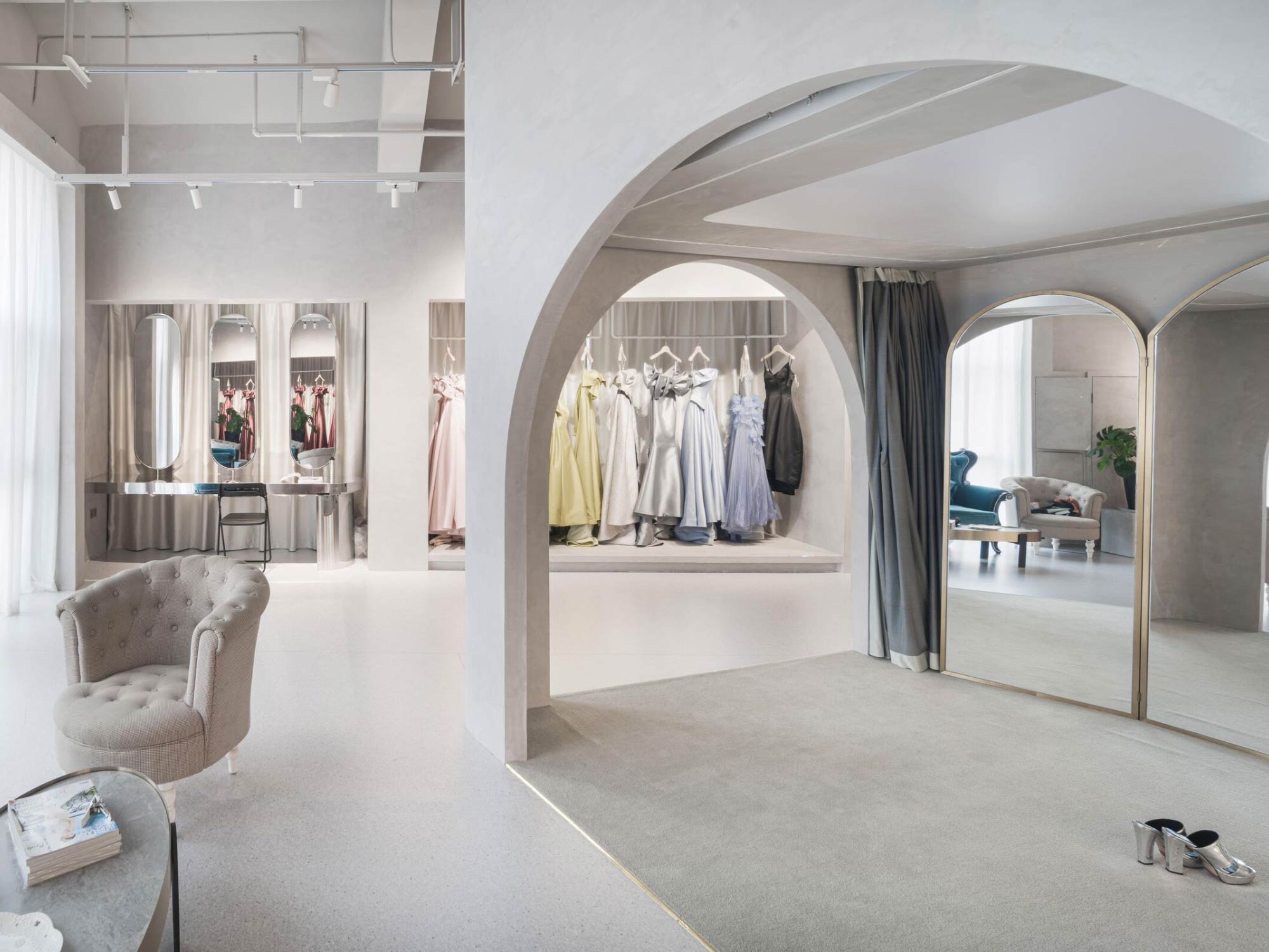 Điều này khiến showroom không còn là nơi lựa chọn sản phẩm, mà trở thành một “sân khấu cảm xúc”, nơi khách hàng – đặc biệt là cô dâu – đóng vai trò trung tâm. Mỗi khu vực không chỉ phục vụ chức năng mà còn mang ý nghĩa biểu tượng, từ bước chuẩn bị, thử đồ cho đến khoảnh khắc “xuất hiện”.