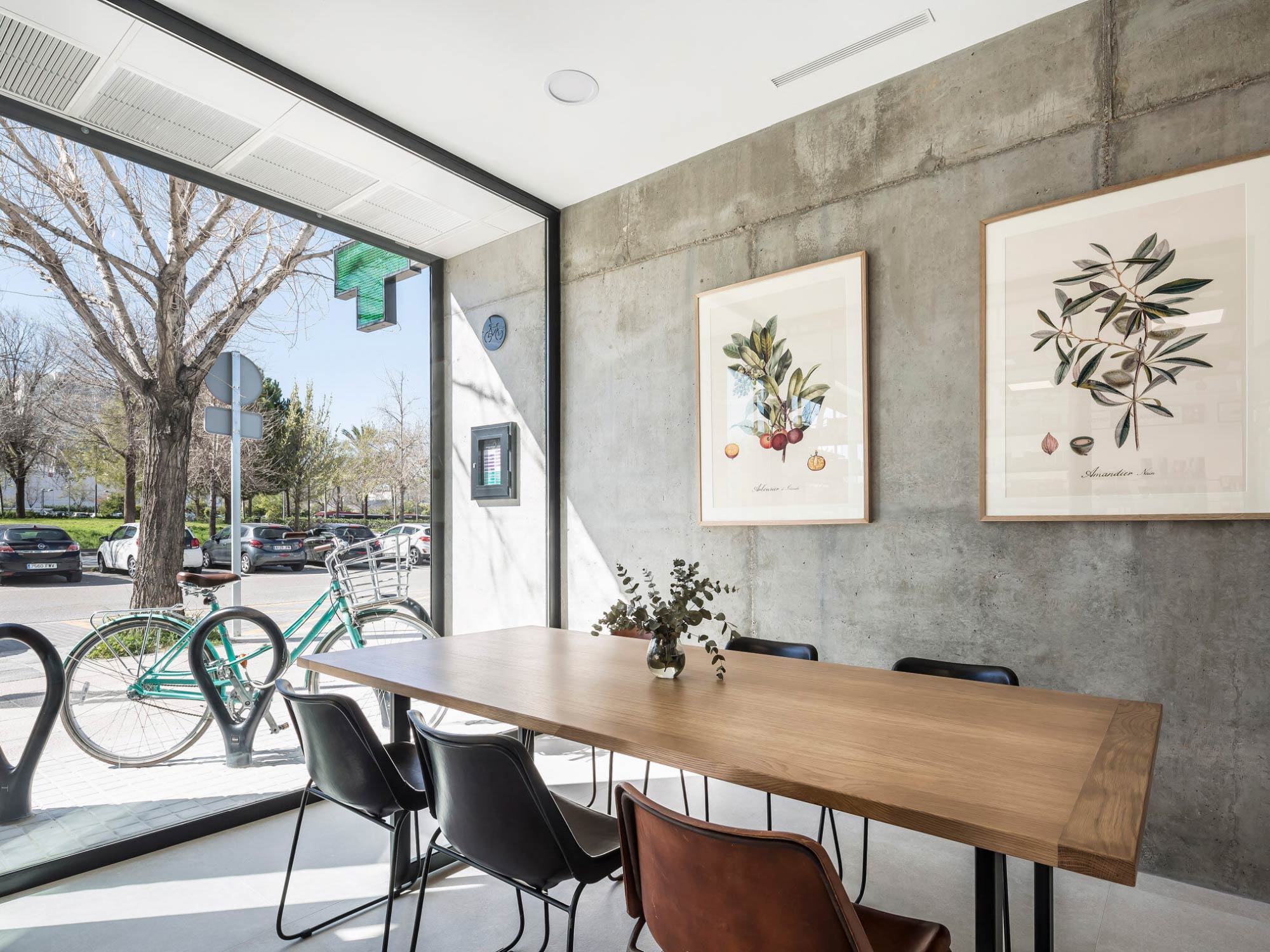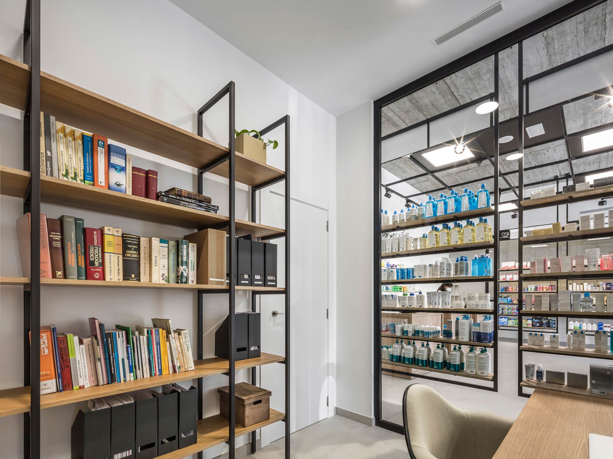 Bên cạnh đó, việc kết hợp bê tông thô, kim loại sơn tĩnh điện và gỗ công nghiệp màu sáng giúp không gian vừa có chiều sâu thẩm mỹ, vừa đảm bảo độ bền sử dụng lâu dài. BLUEWOOD luôn chú trọng lựa chọn vật liệu phù hợp với đặc thù ngành dược: dễ vệ sinh, chống ẩm, chịu lực tốt và duy trì vẻ đẹp ổn định theo thời gian.
