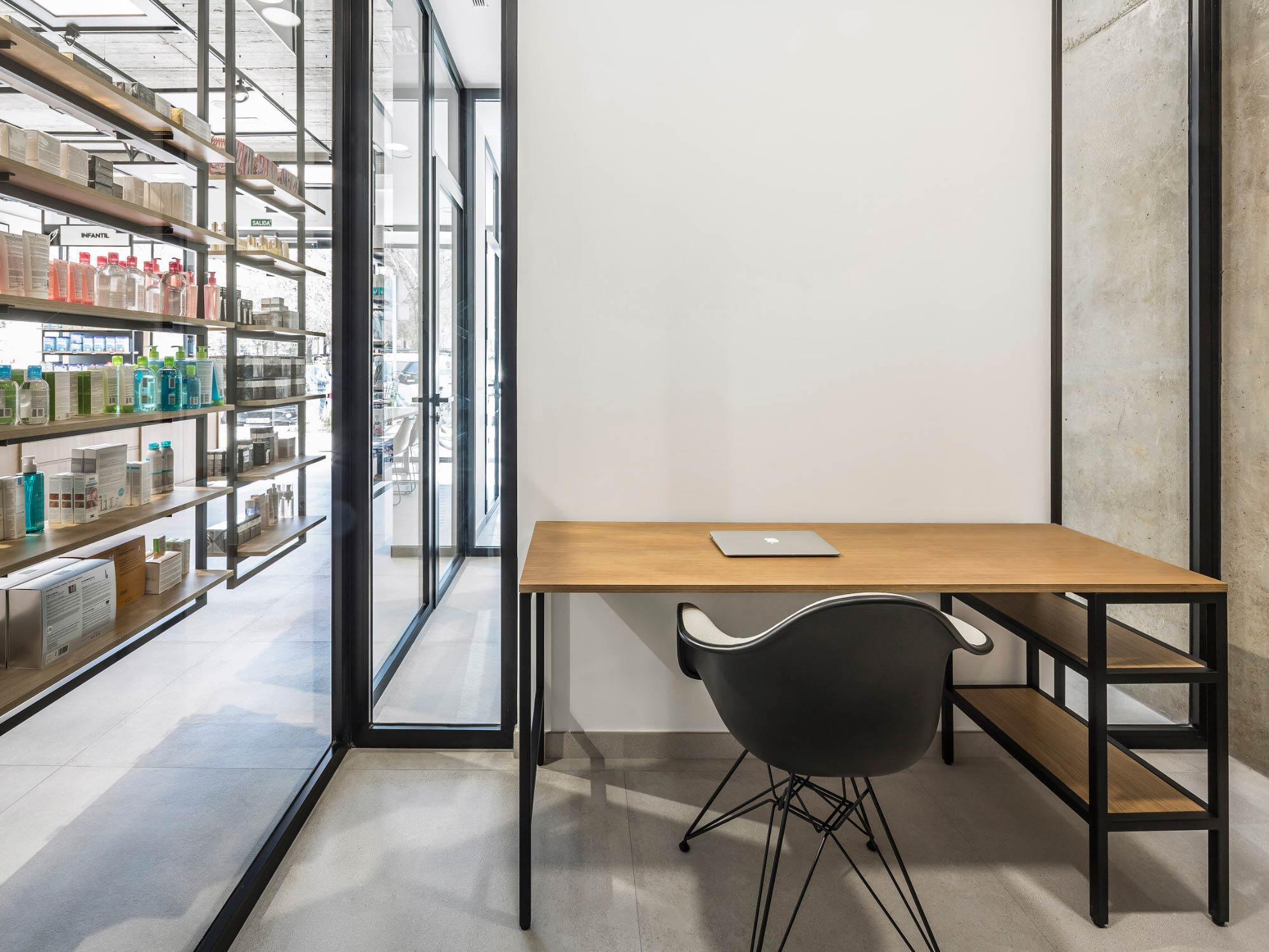 Hệ thống kệ trưng bày trong dự án nhà thuốc UNE là điểm nhấn nổi bật của toàn bộ không gian. Thiết kế kệ khung sắt kết hợp đợt gỗ vừa tạo cảm giác hiện đại, chắc chắn, vừa mang lại độ thoáng thị giác cao. Cách bố trí kệ sát tường, kệ trung tâm và các ô phân khu giúp sản phẩm được sắp xếp rõ ràng, dễ tìm và dễ tiếp cận.