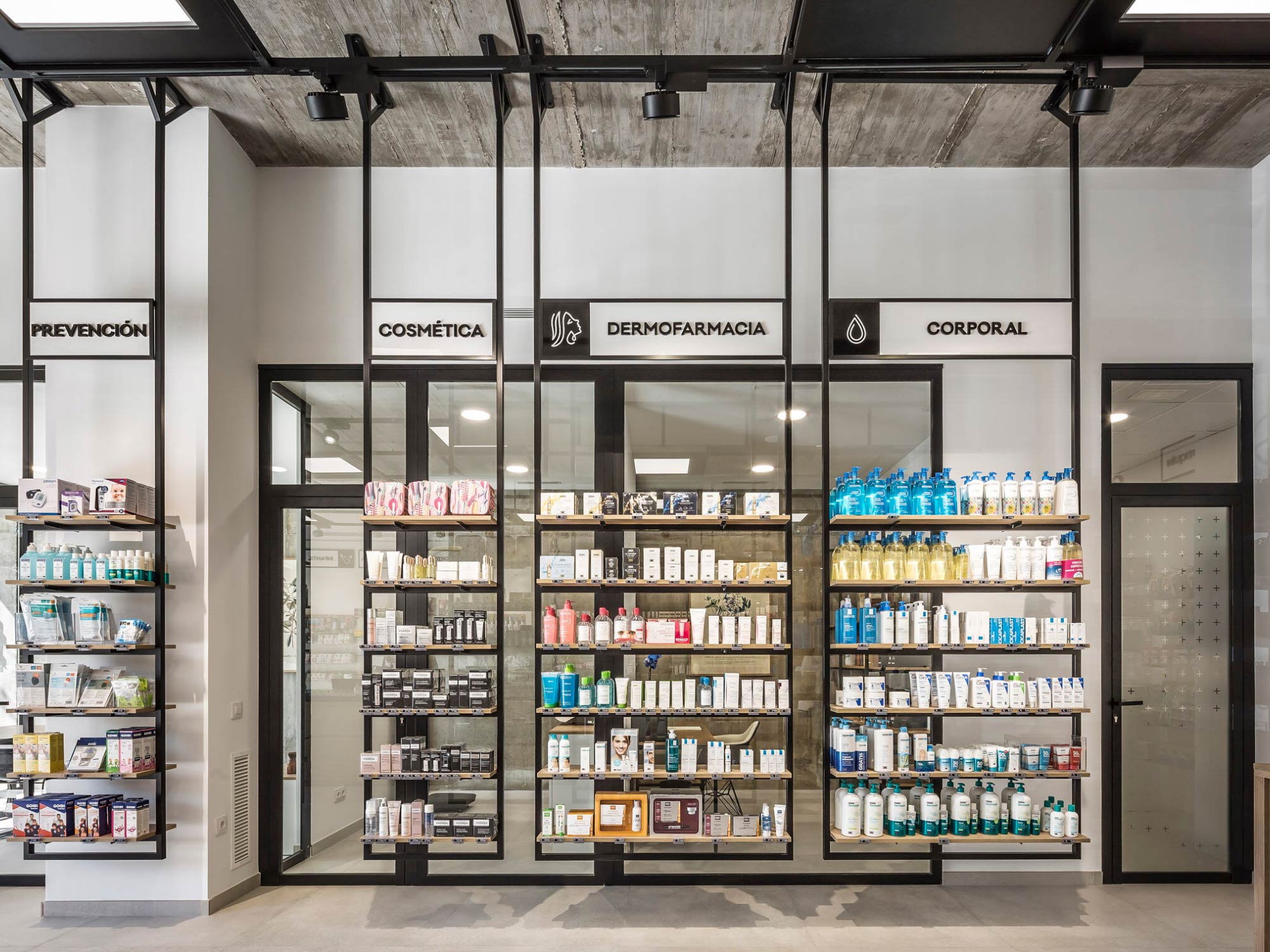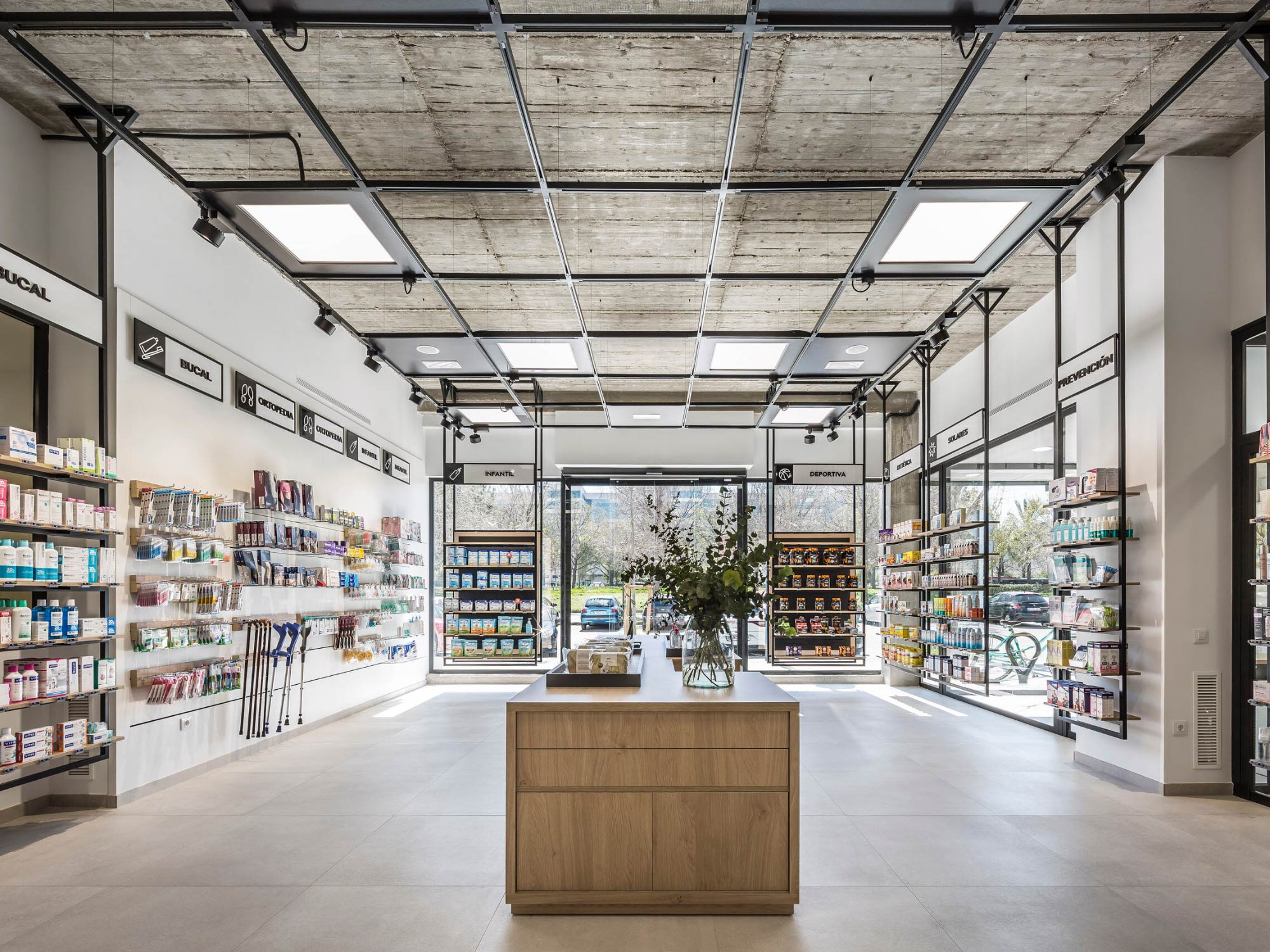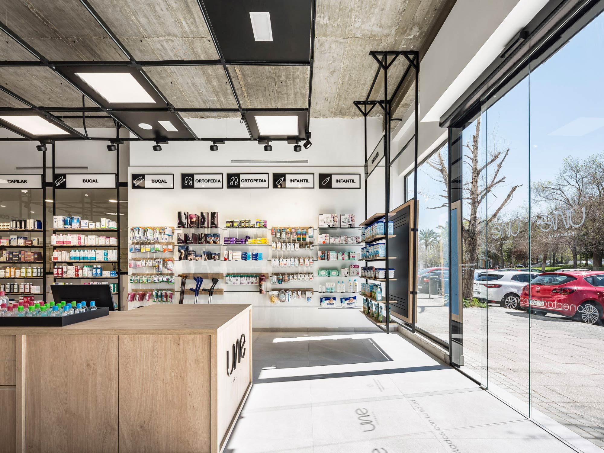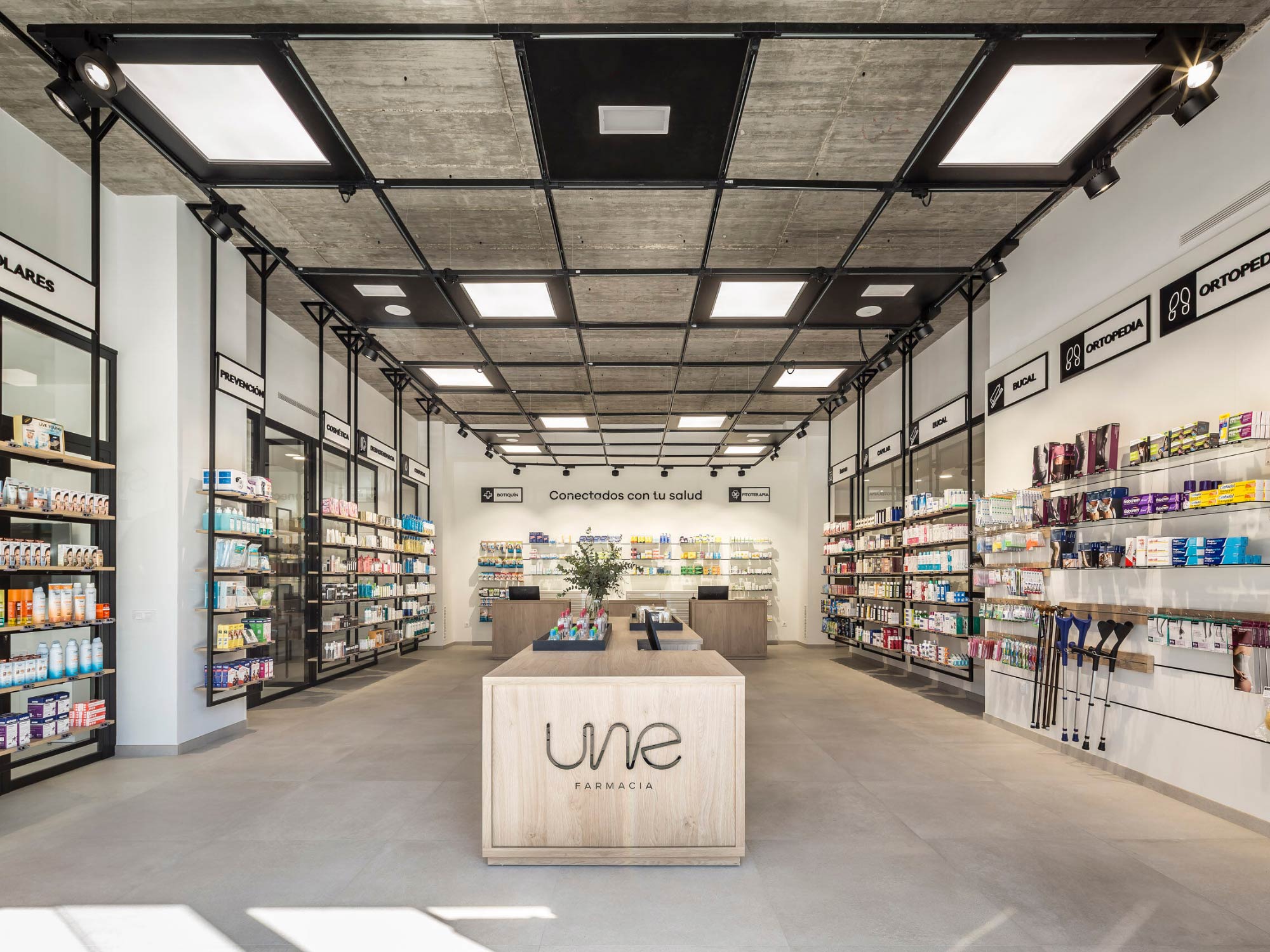 Ánh sáng trong thiết kế nhà thuốc đóng vai trò đặc biệt quan trọng bởi nó ảnh hưởng trực tiếp đến cảm giác sạch sẽ, minh bạch và tin cậy. Tại dự án thiết kế nội thất nhà thuốc Une, hệ trần được xử lý theo phong cách công nghiệp hiện đại với khung thép đen kết hợp các mảng đèn âm trần dạng hộp lớn, tạo nên hiệu ứng ánh sáng đồng đều, dễ chịu và sang trọng.