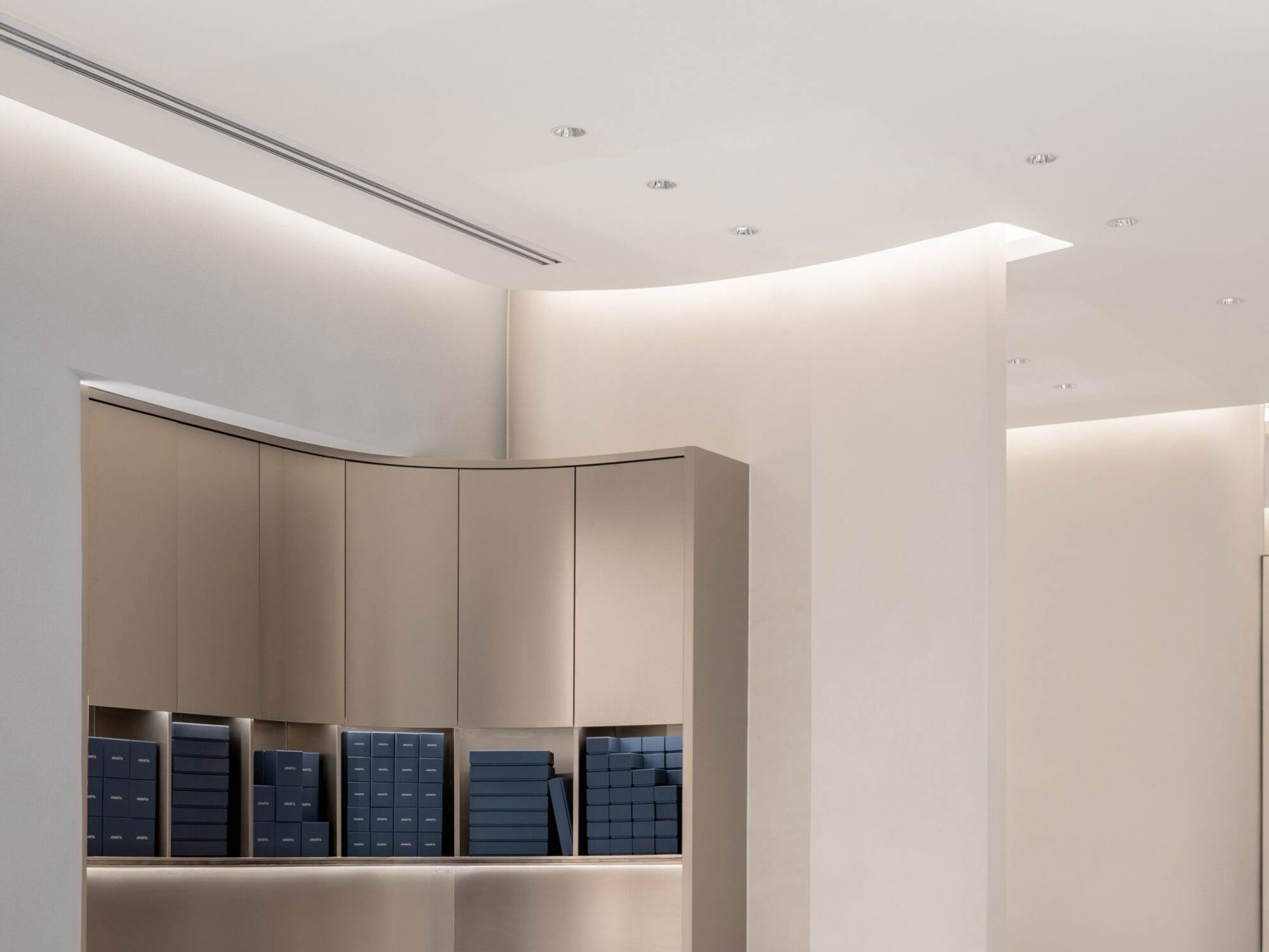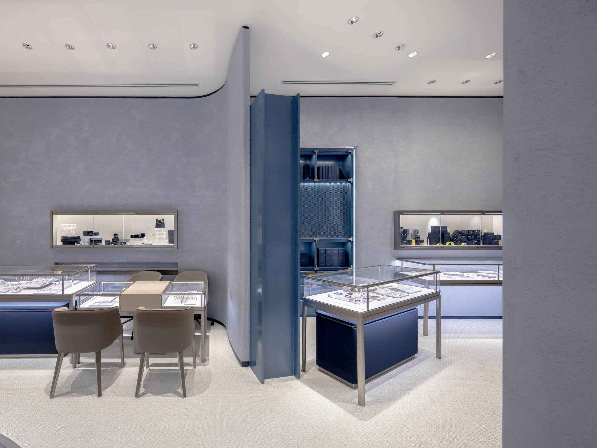 Những đường cong này không chỉ xuất hiện ở tường, mà còn được lặp lại trong các chi tiết nội thất và trưng bày, tạo nên một nhịp điệu thị giác thống nhất.