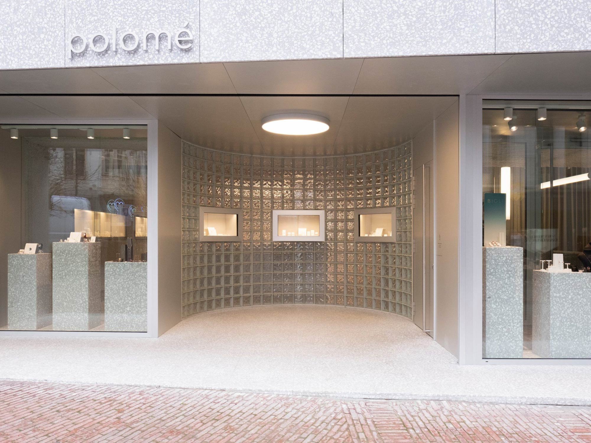 Bảng vật liệu của Dự án thiết kế tiệm vàng Polome được xây dựng theo hướng tạo ra một sự thống nhất về màu sắc, nhưng lại đa dạng về kết cấu. Các bề mặt như terrazzo, vải dệt và cellulose phun được kết hợp để tạo nên một hệ sinh thái vật liệu phong phú.