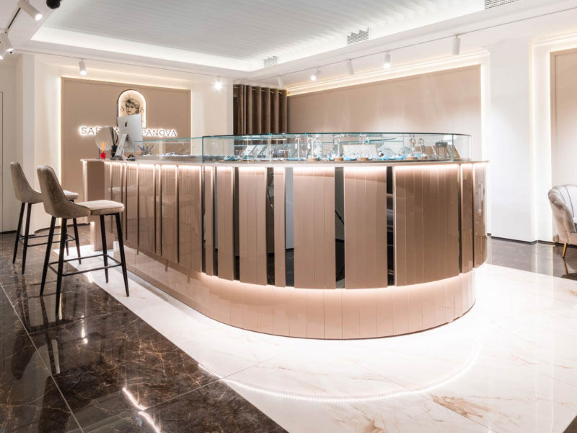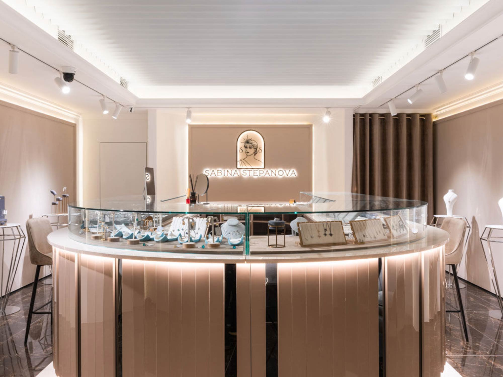 Trong thiết kế cửa hàng trang sức, ánh sáng không chỉ là công cụ chiếu sáng mà là yếu tố quyết định trực tiếp đến giá trị cảm nhận của sản phẩm. Tại Sabina Stepanova, hệ thống ánh sáng được nghiên cứu kỹ lưỡng để làm nổi bật độ lấp lánh và màu sắc của từng món trang sức.