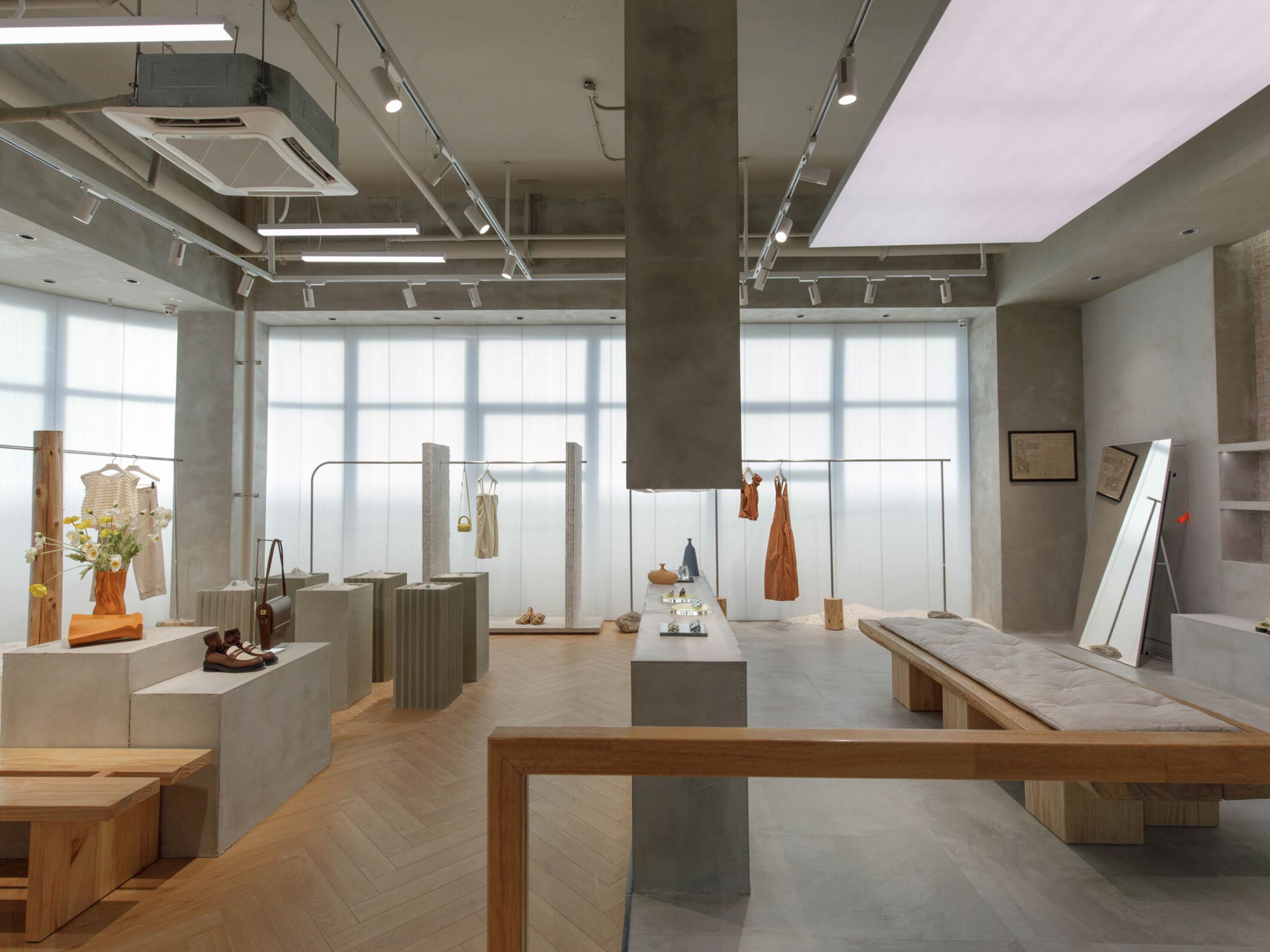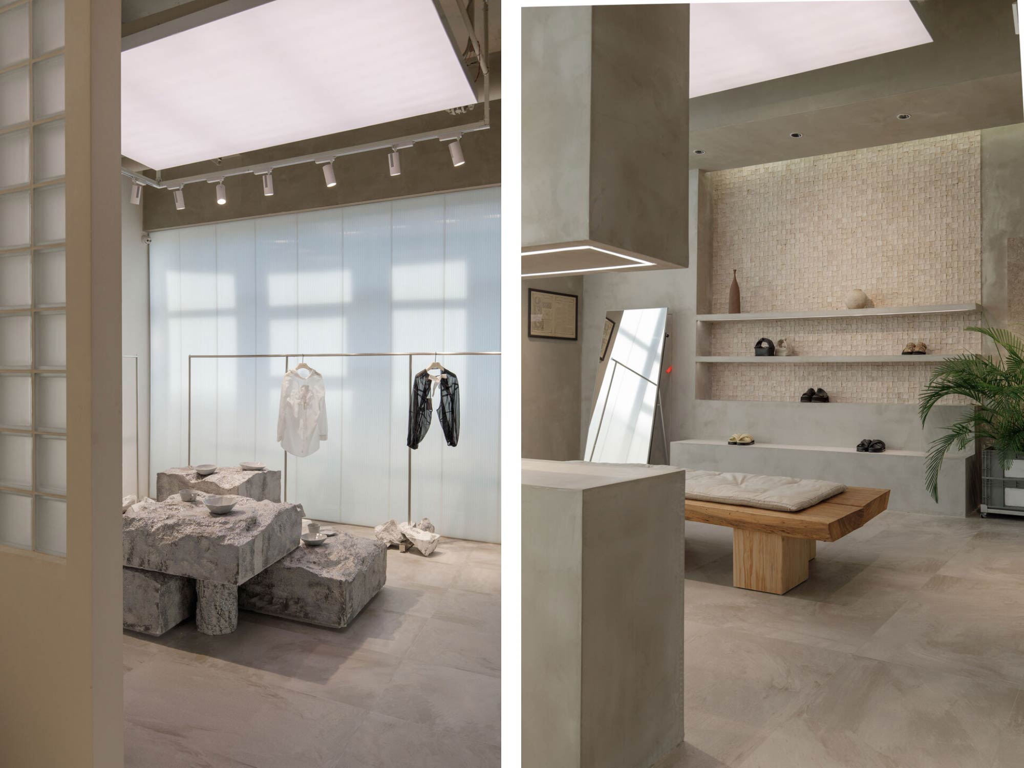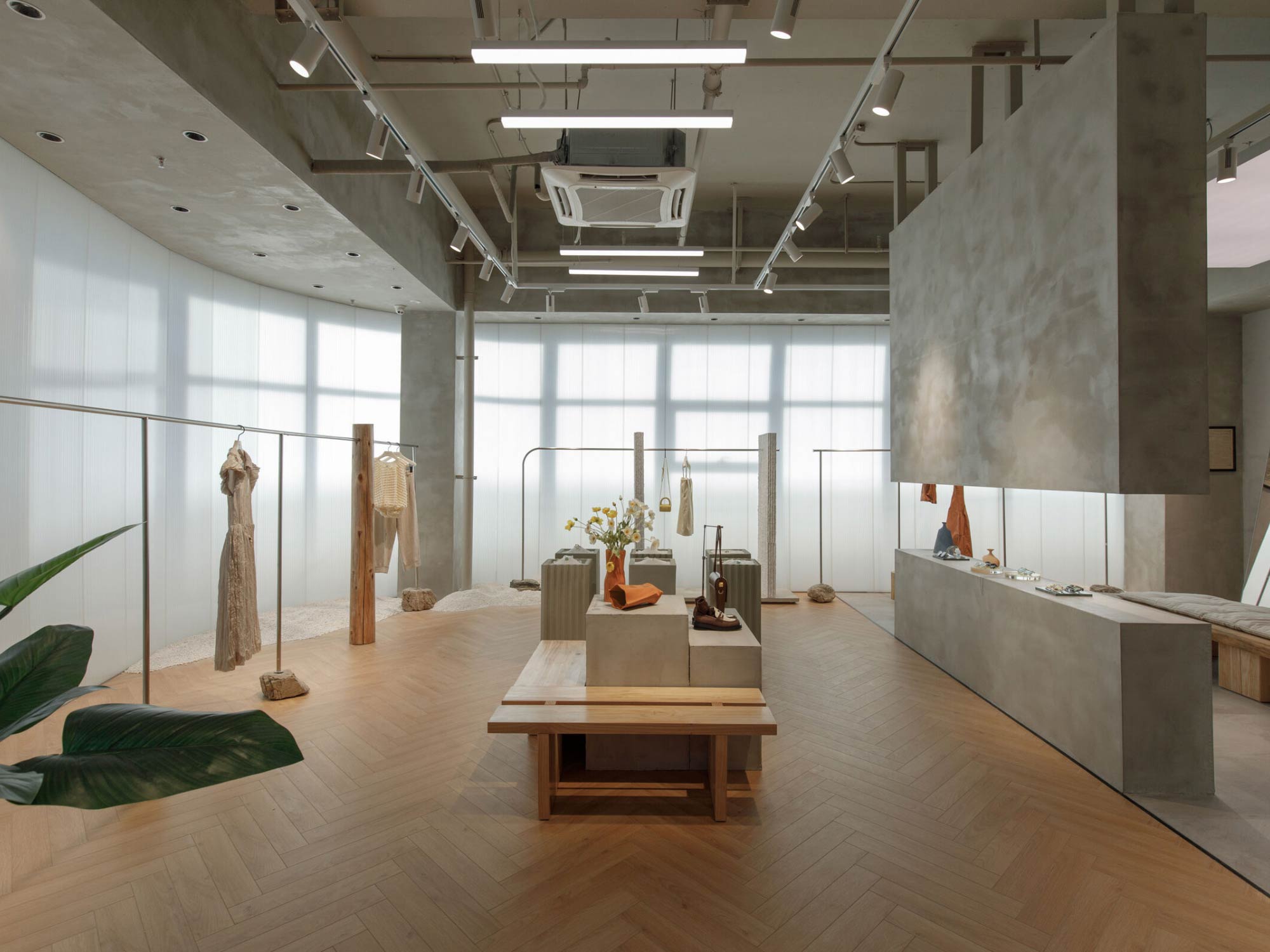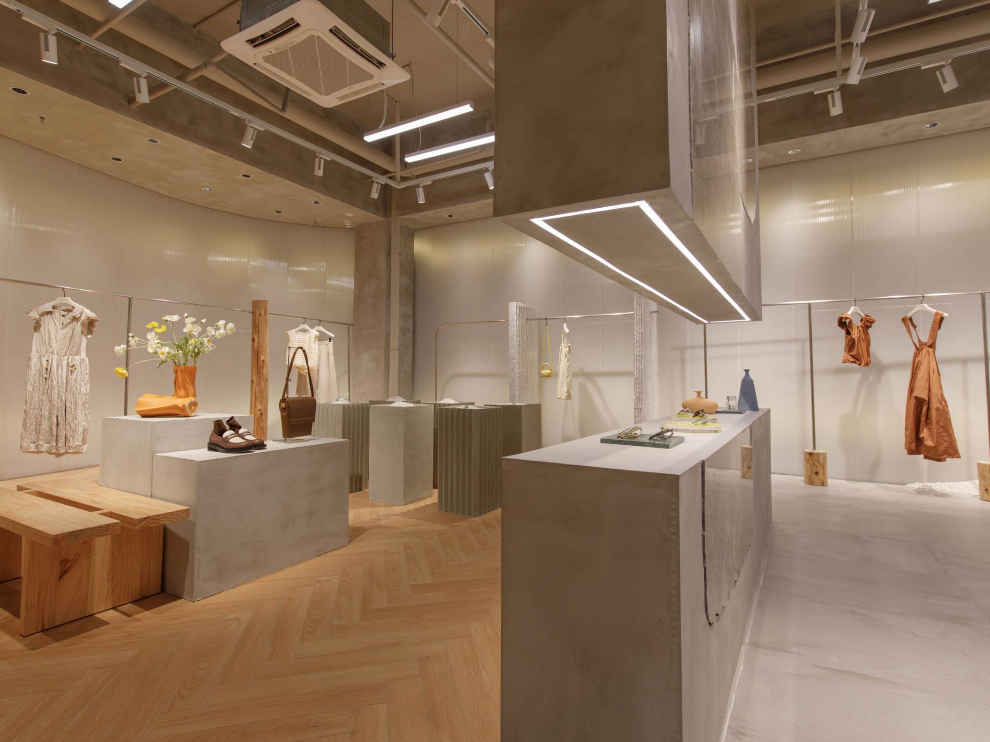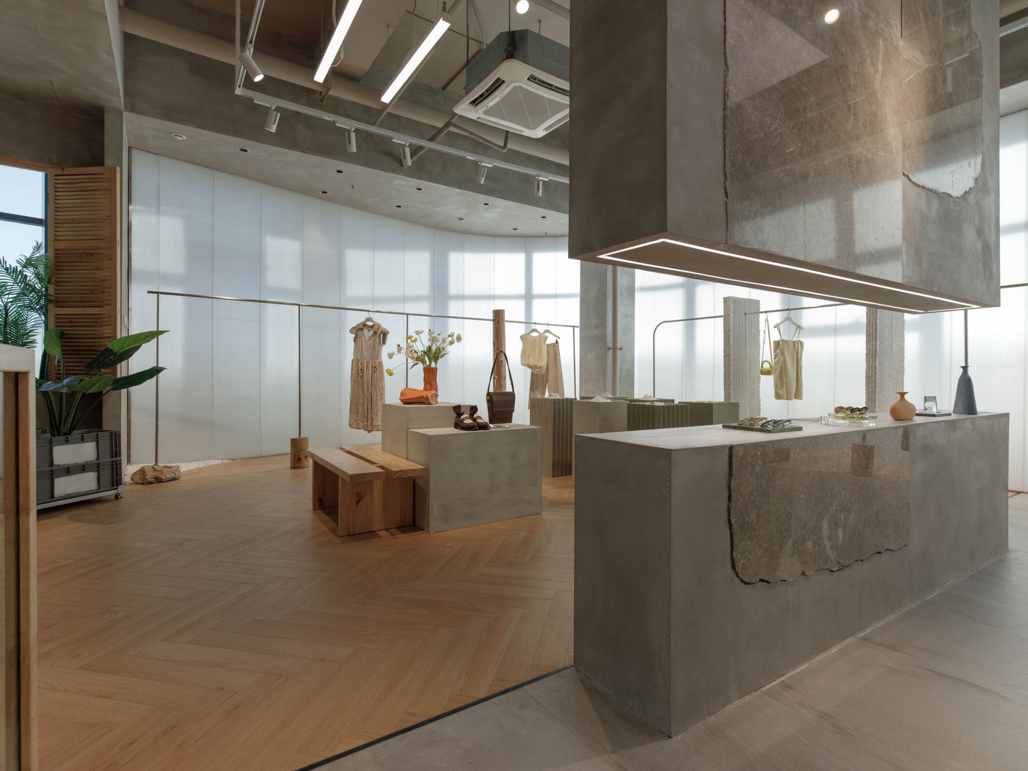 Dự án lựa chọn một bảng vật liệu tiết chế, thiên về các bề mặt thô và tự nhiên như bê tông hiệu ứng, đá travertine và gỗ sáng màu. Sự kết hợp này không nhằm phô diễn tính chất vật liệu mà hướng đến việc tạo ra một nền không gian “lặng”, nơi mọi chi tiết đều được giảm thiểu để nhường chỗ cho sản phẩm thời trang. Chính sự trung tính này giúp tăng độ tương phản thị giác, làm nổi bật hình khối, chất liệu và màu sắc của từng sản phẩm, đồng thời mang lại cảm giác cao cấp thông qua sự tối giản có kiểm soát. Đây là một xu hướng rõ rệt trong thiết kế retail đương đại, nơi vật liệu không còn là yếu tố trang trí mà trở thành công cụ điều tiết trải nghiệm.