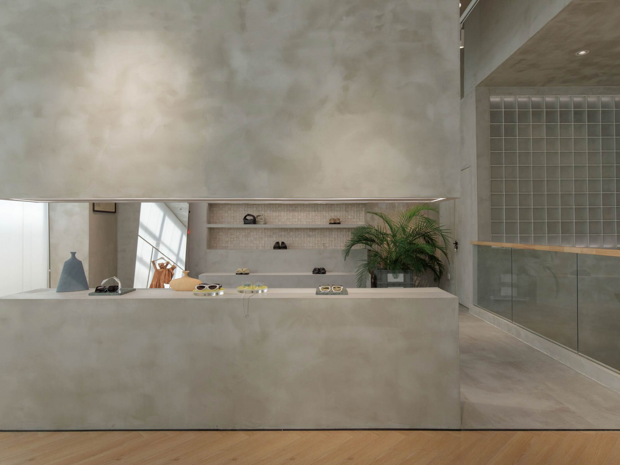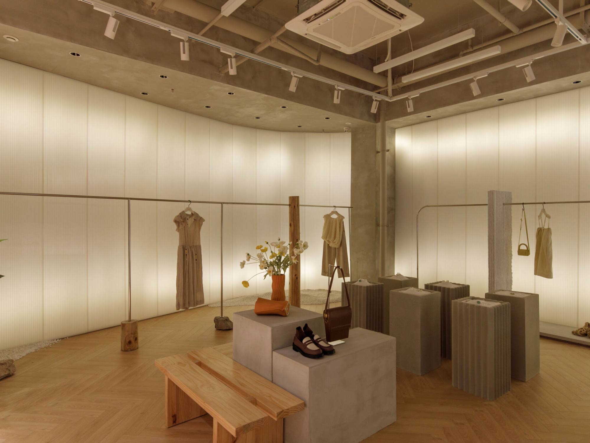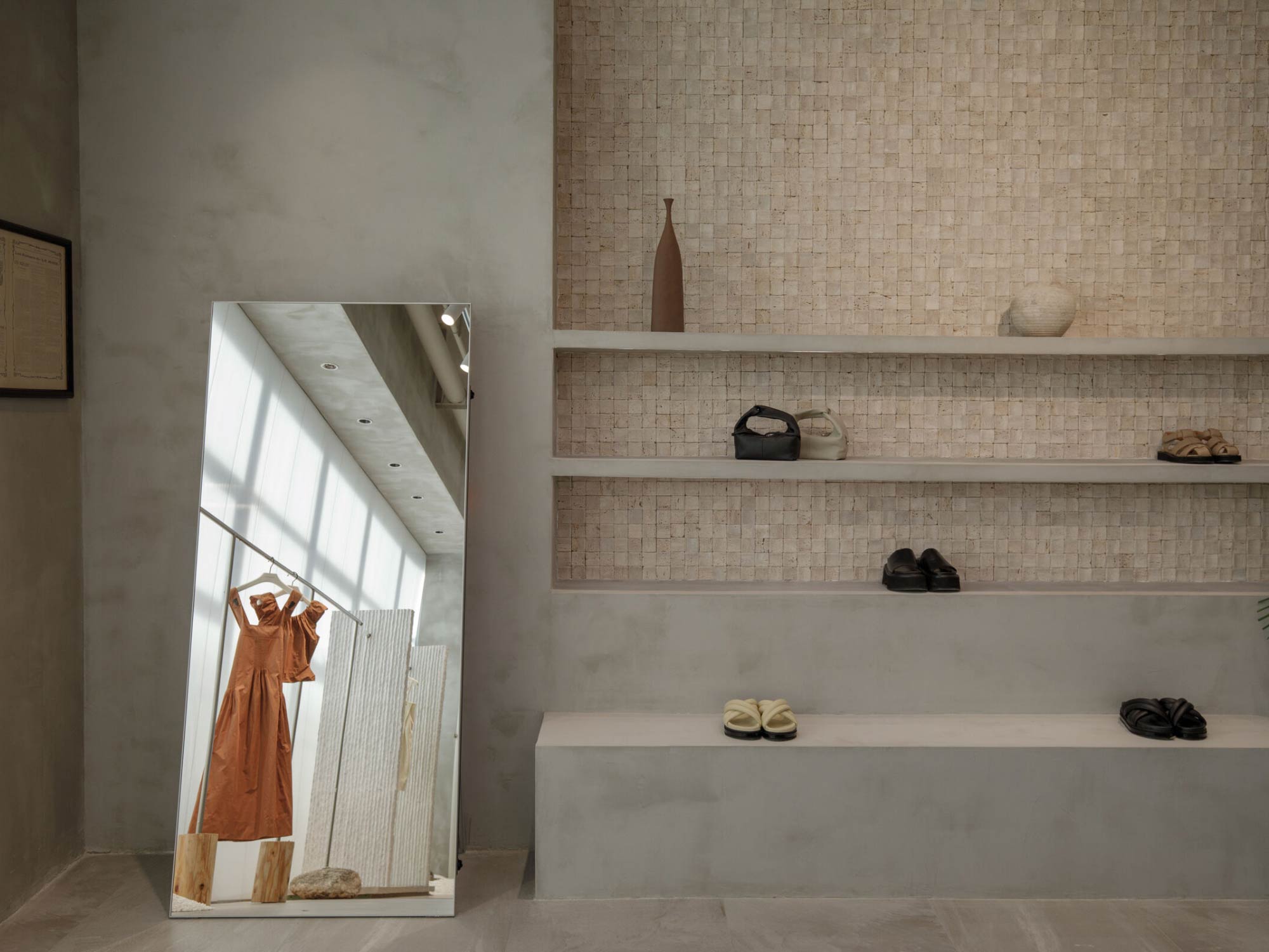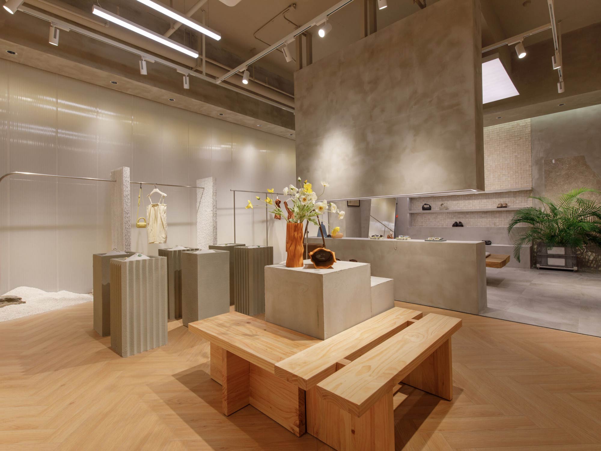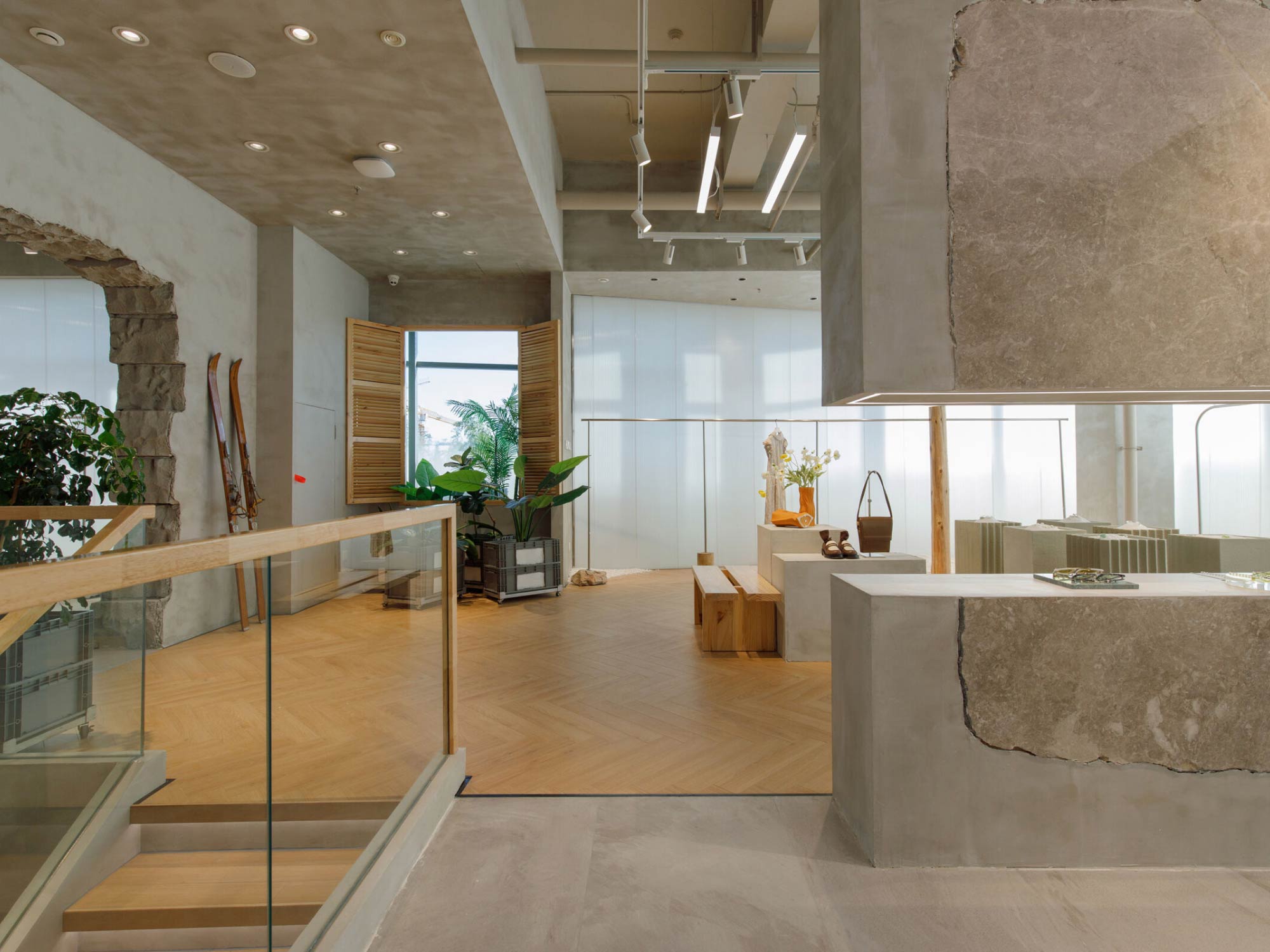 Dự án lựa chọn một bảng vật liệu tiết chế, thiên về các bề mặt thô và tự nhiên như bê tông hiệu ứng, đá travertine và gỗ sáng màu. Sự kết hợp này không nhằm phô diễn tính chất vật liệu mà hướng đến việc tạo ra một nền không gian “lặng”, nơi mọi chi tiết đều được giảm thiểu để nhường chỗ cho sản phẩm thời trang. Chính sự trung tính này giúp tăng độ tương phản thị giác, làm nổi bật hình khối, chất liệu và màu sắc của từng sản phẩm, đồng thời mang lại cảm giác cao cấp thông qua sự tối giản có kiểm soát. Đây là một xu hướng rõ rệt trong thiết kế retail đương đại, nơi vật liệu không còn là yếu tố trang trí mà trở thành công cụ điều tiết trải nghiệm.