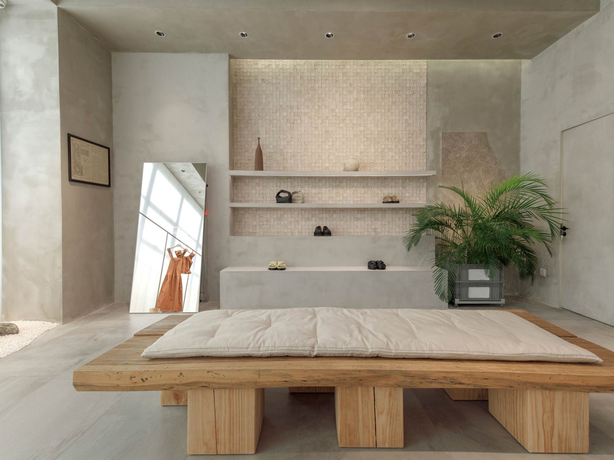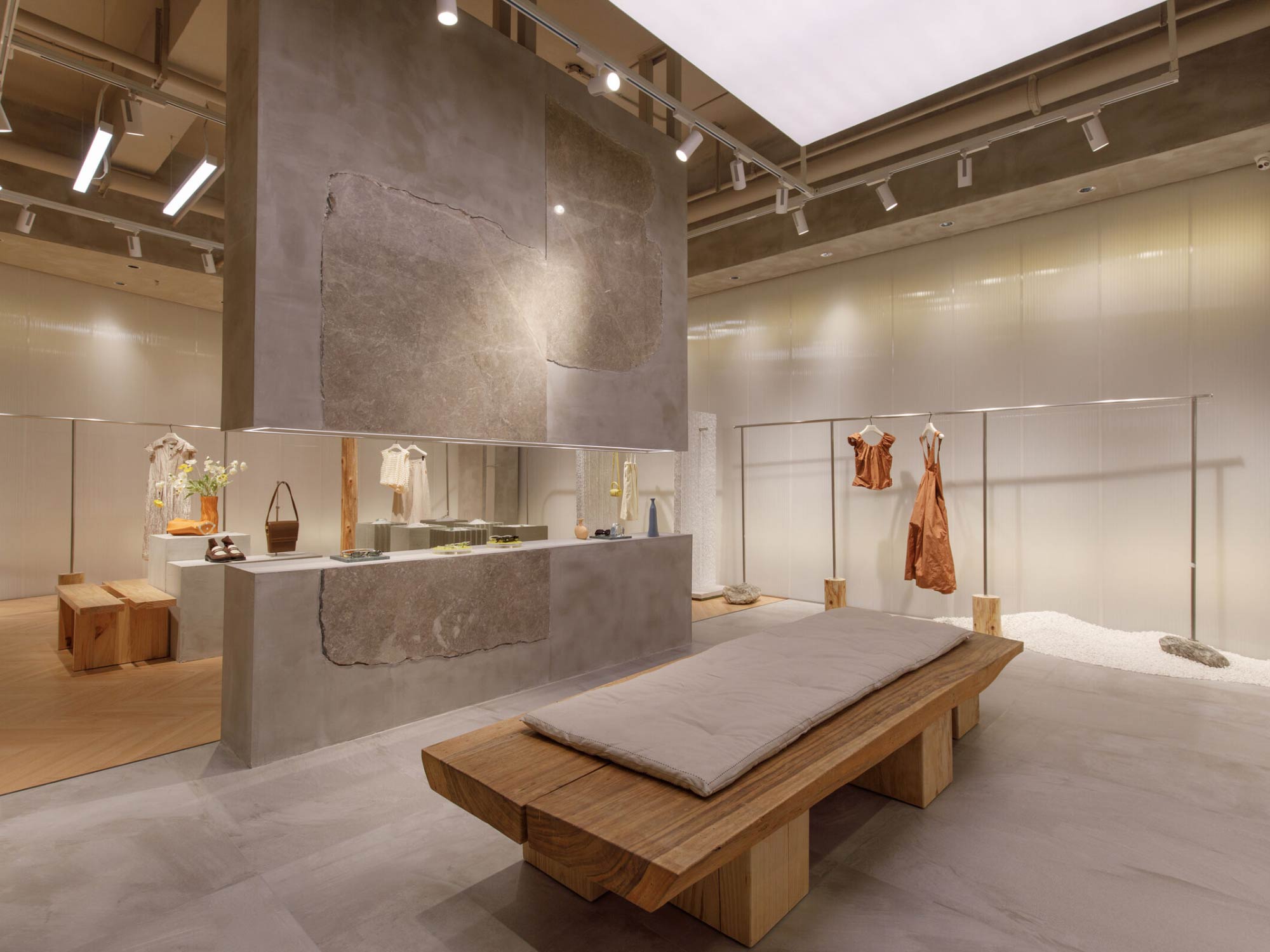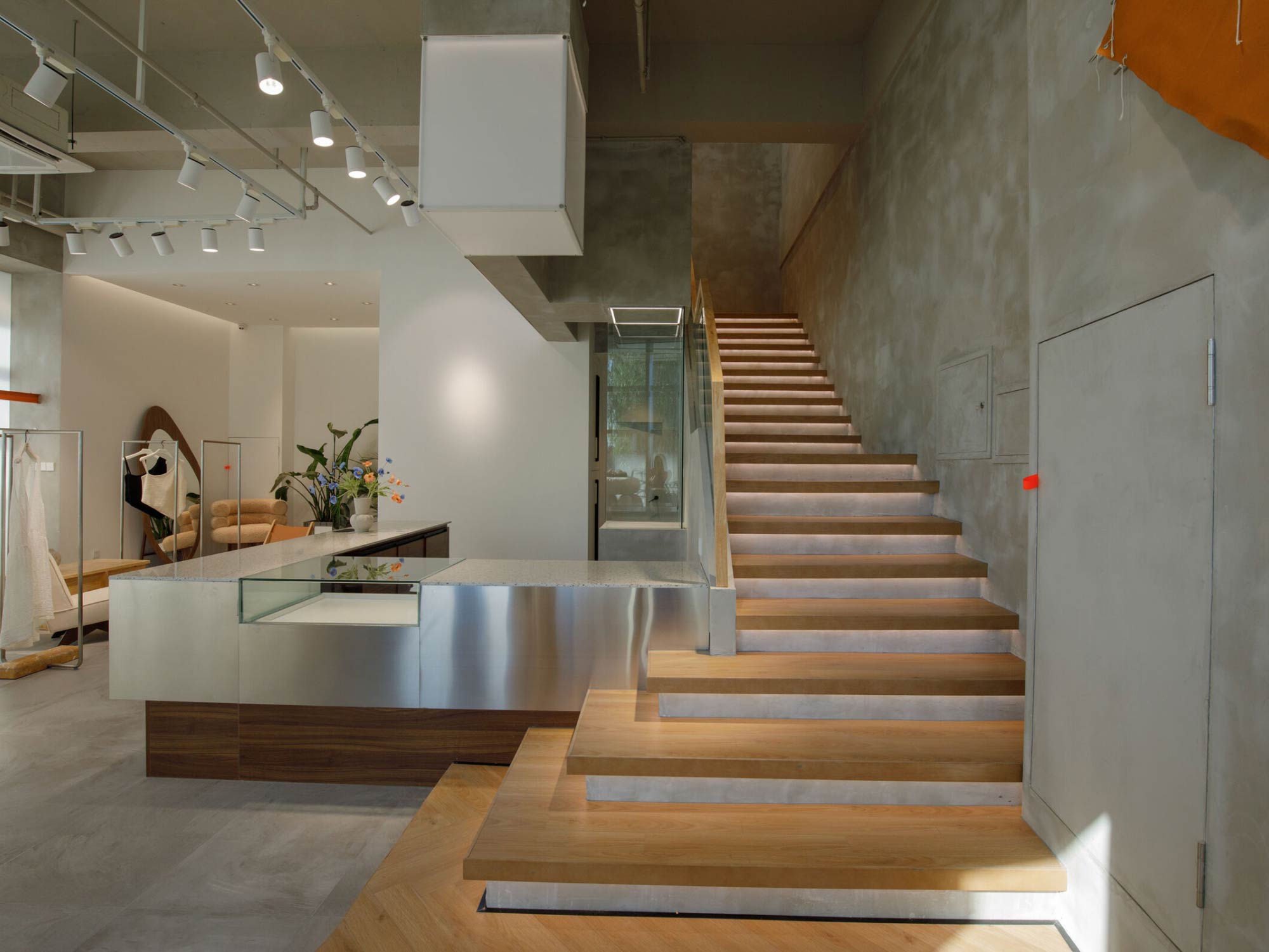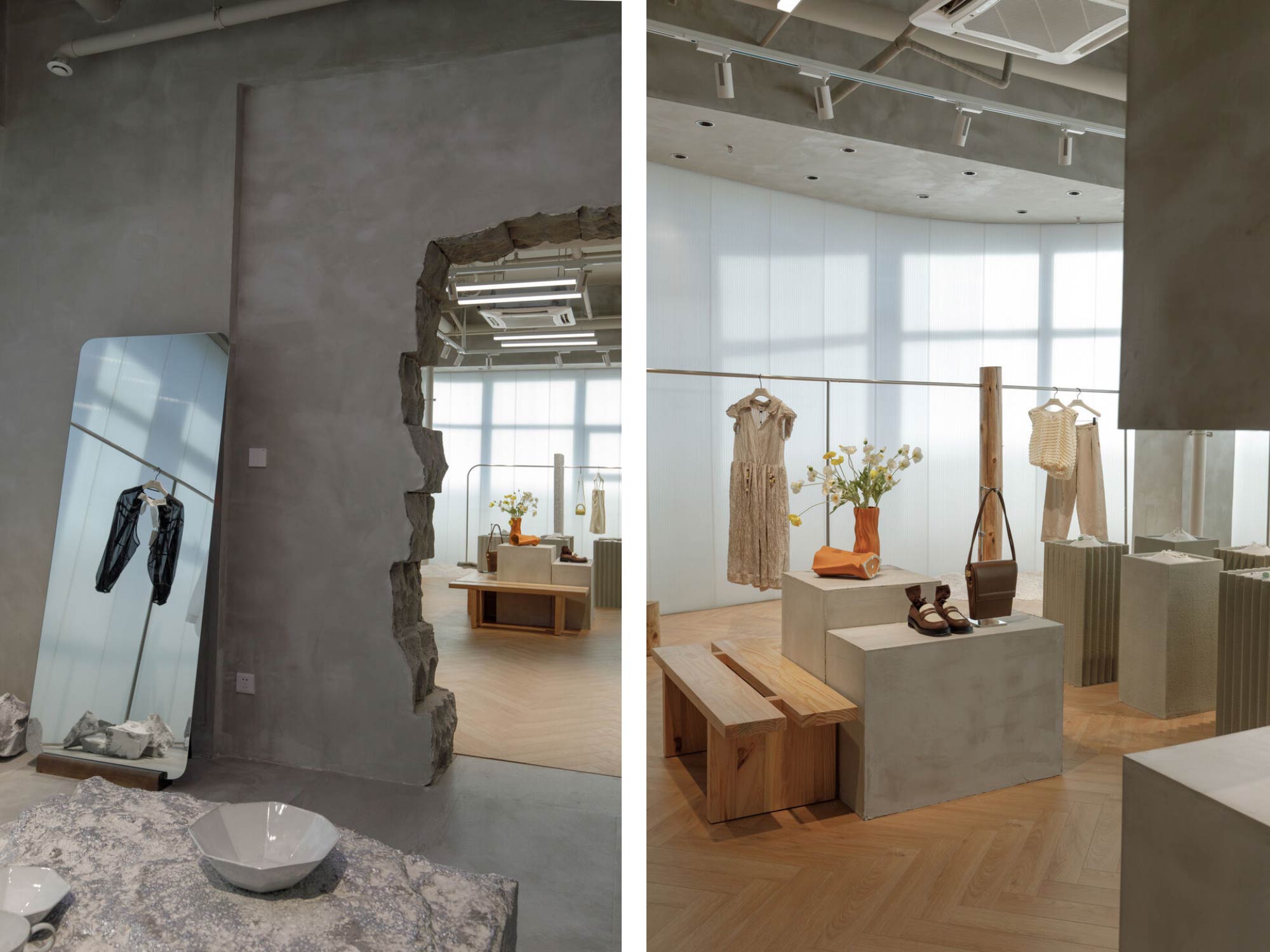 Dự án lựa chọn một bảng vật liệu tiết chế, thiên về các bề mặt thô và tự nhiên như bê tông hiệu ứng, đá travertine và gỗ sáng màu. Sự kết hợp này không nhằm phô diễn tính chất vật liệu mà hướng đến việc tạo ra một nền không gian “lặng”, nơi mọi chi tiết đều được giảm thiểu để nhường chỗ cho sản phẩm thời trang. Chính sự trung tính này giúp tăng độ tương phản thị giác, làm nổi bật hình khối, chất liệu và màu sắc của từng sản phẩm, đồng thời mang lại cảm giác cao cấp thông qua sự tối giản có kiểm soát. Đây là một xu hướng rõ rệt trong thiết kế retail đương đại, nơi vật liệu không còn là yếu tố trang trí mà trở thành công cụ điều tiết trải nghiệm.