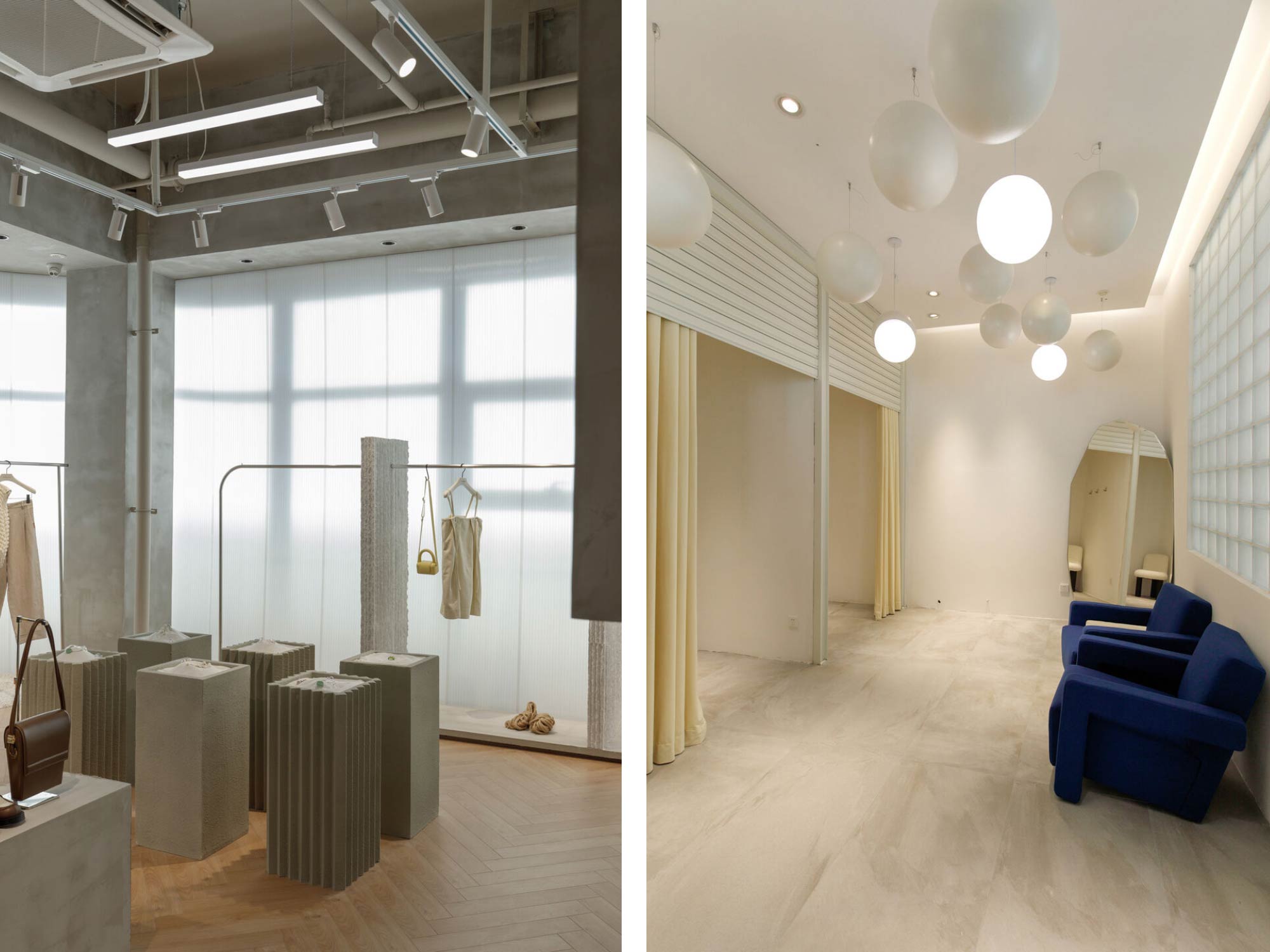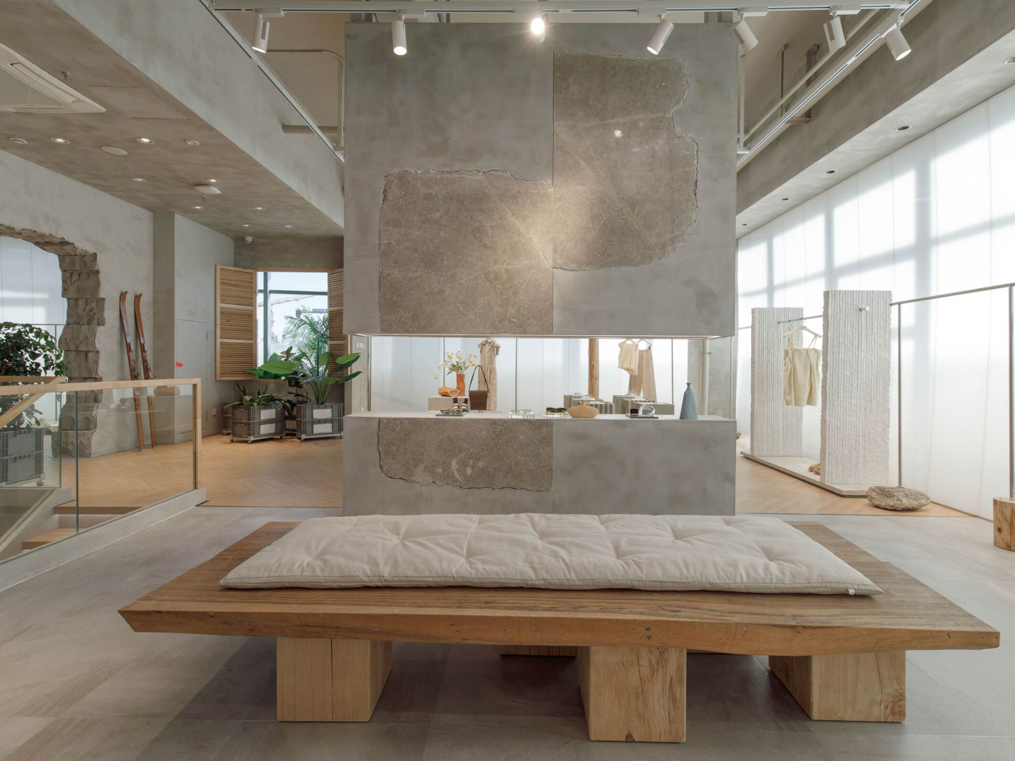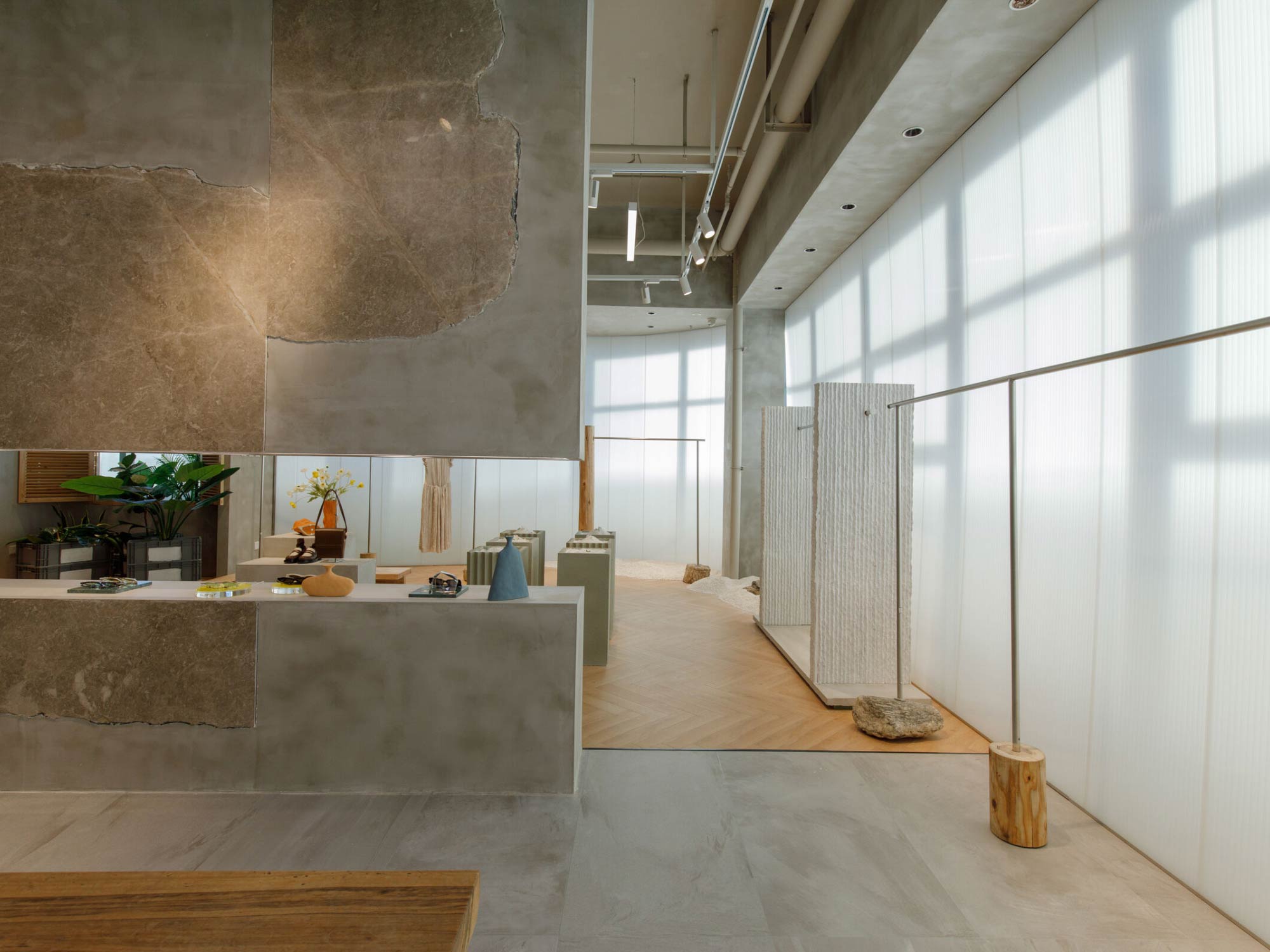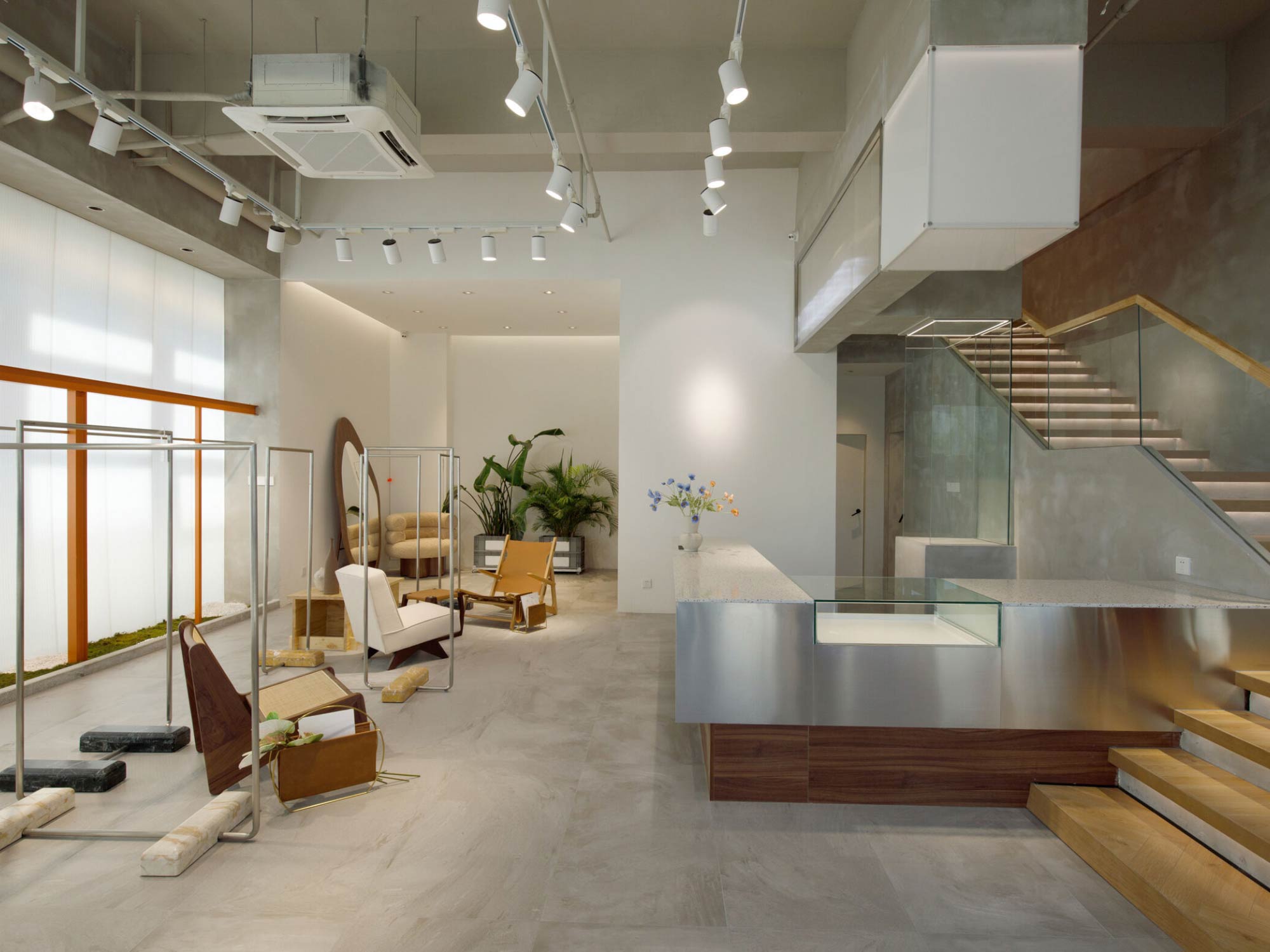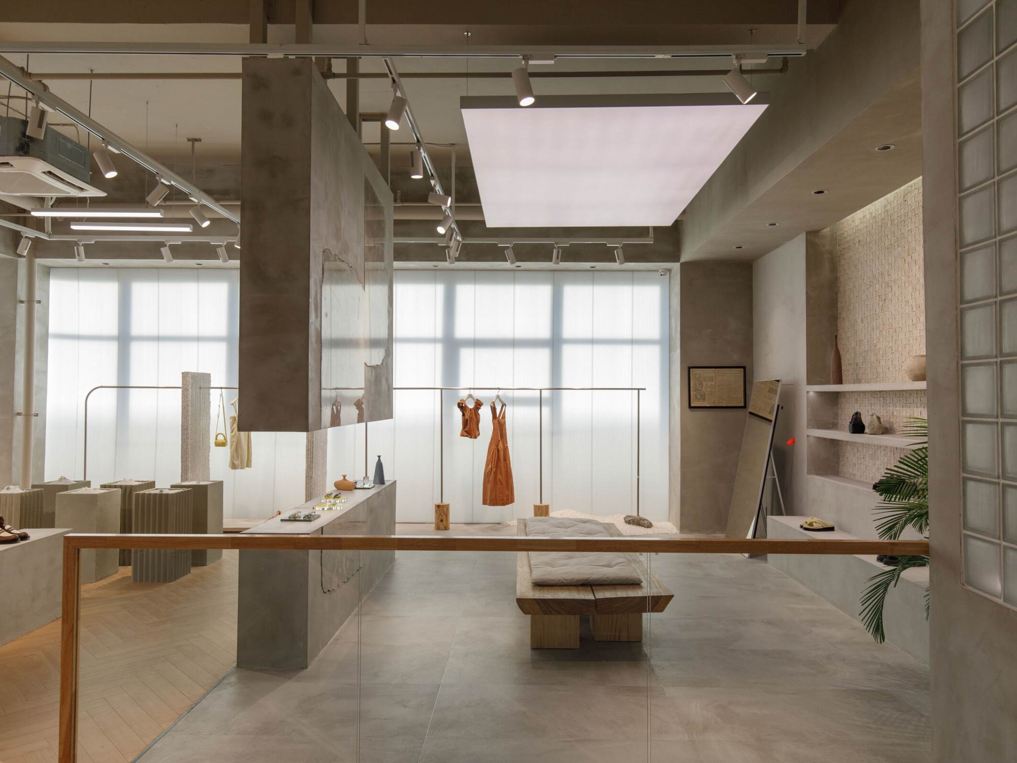 Dự án lựa chọn một bảng vật liệu tiết chế, thiên về các bề mặt thô và tự nhiên như bê tông hiệu ứng, đá travertine và gỗ sáng màu. Sự kết hợp này không nhằm phô diễn tính chất vật liệu mà hướng đến việc tạo ra một nền không gian “lặng”, nơi mọi chi tiết đều được giảm thiểu để nhường chỗ cho sản phẩm thời trang. Chính sự trung tính này giúp tăng độ tương phản thị giác, làm nổi bật hình khối, chất liệu và màu sắc của từng sản phẩm, đồng thời mang lại cảm giác cao cấp thông qua sự tối giản có kiểm soát. Đây là một xu hướng rõ rệt trong thiết kế retail đương đại, nơi vật liệu không còn là yếu tố trang trí mà trở thành công cụ điều tiết trải nghiệm.